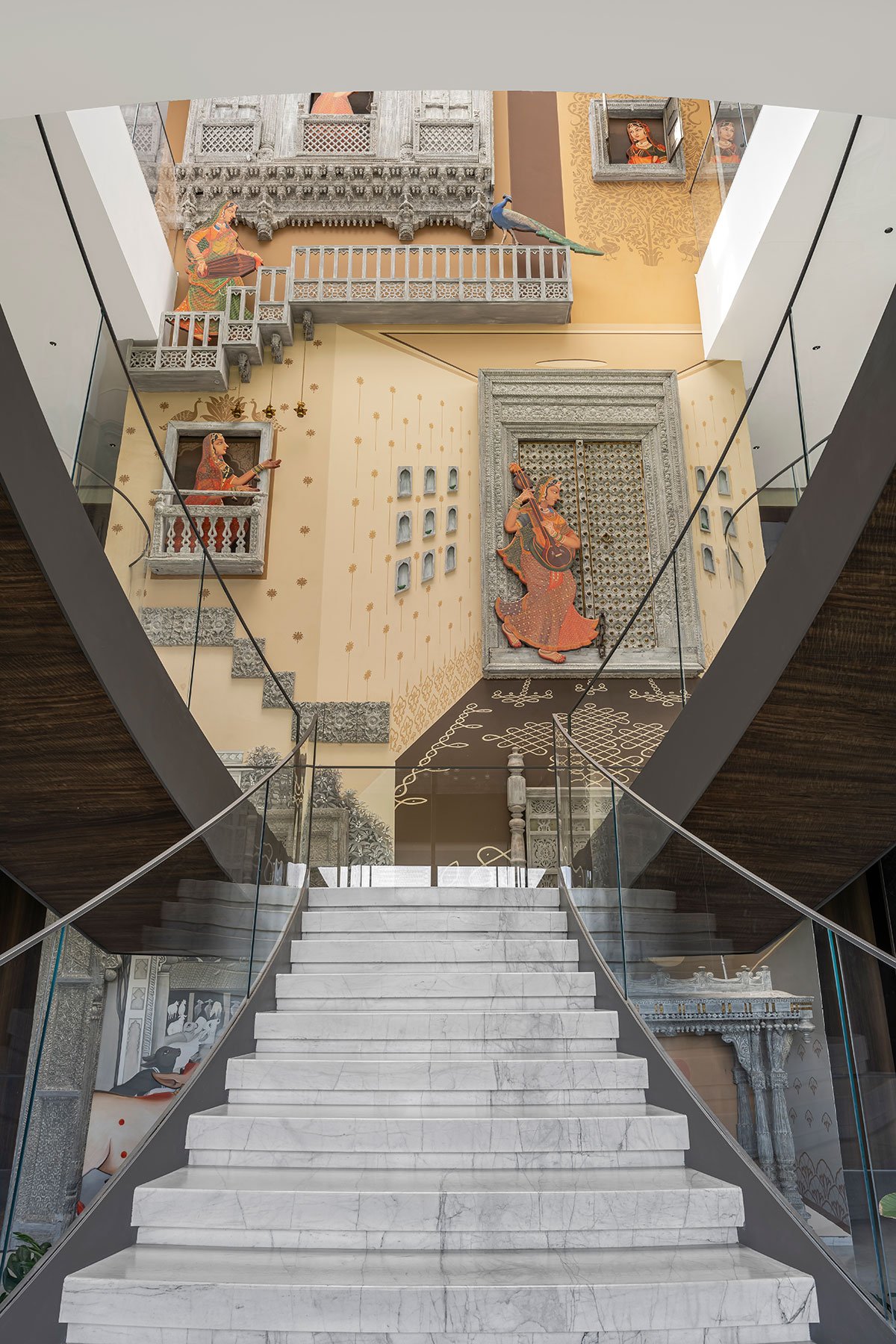 Project Highlights: The standout feature of Fusion Court is its seamless integration of traditional Indian elements with contemporary design. The central courtyard, with its grand staircase, acts as the heart of the home. Traditional jharokhas, doors, and arches are paired with modern aesthetics, creating a unique and harmonious space. The double-height formal living room, with its 20-foot aluminum sliding doors, connects the indoors with the outdoors, maximizing natural light and ventilation.