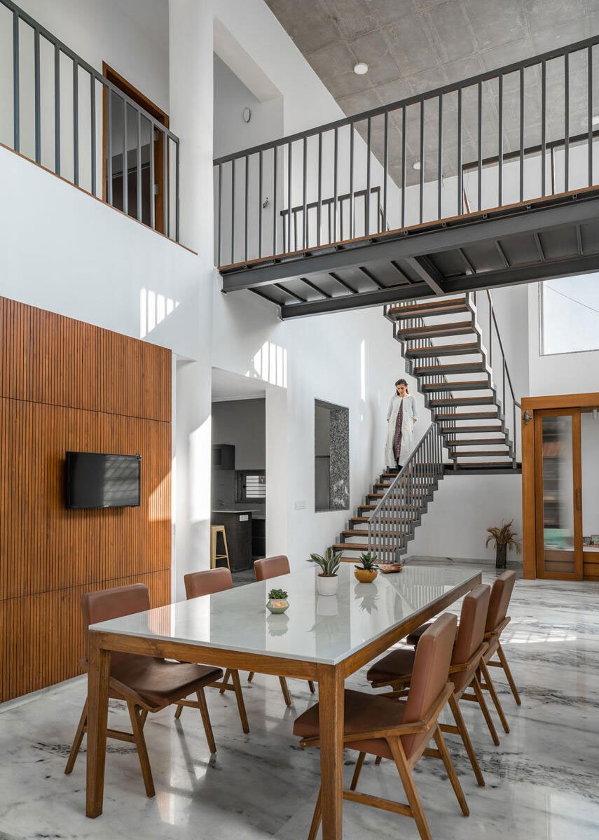 The design layout is about interconnected spaces and interconnected volumes. Internally all the spaces are free flowing within one another. The volume of the formal living is connected with the main house spaces on only one side, leaving all the three sides open and gets connected to the Garden. The middle double height volume takes the Family room and the Dinning spaces. Interestingly, this double height volume is sandwiched between two open spaces provides very good cross-ventilation in the living room area, where maximum time is spent by the family members. The bridge acts as an interesting element within the double height volume.
