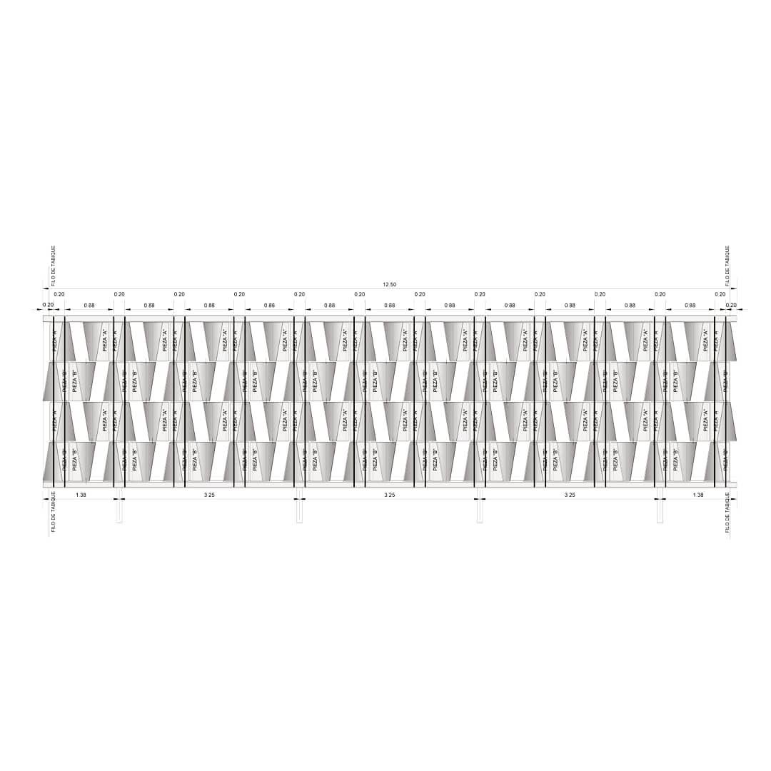 The elements on the façades were specially designed for this project. The 70cmx40cm concrete pieces were projected and manufactured in a workshop, bearing in mind the ideal size and weight for their transportation and assembly on site. The load-bearing structure consists of a lower beam that rests on a few columns and an upper beam that becomes the support in height. The pieces are ‘stuck’ together with concrete and connected by two iron bars that ‘sew’ them to the beams. This is how the façade is reduced to a single prefabricated piece that rationalizes the building process to its maximum at the time that facilitates the logistics and assemble process.