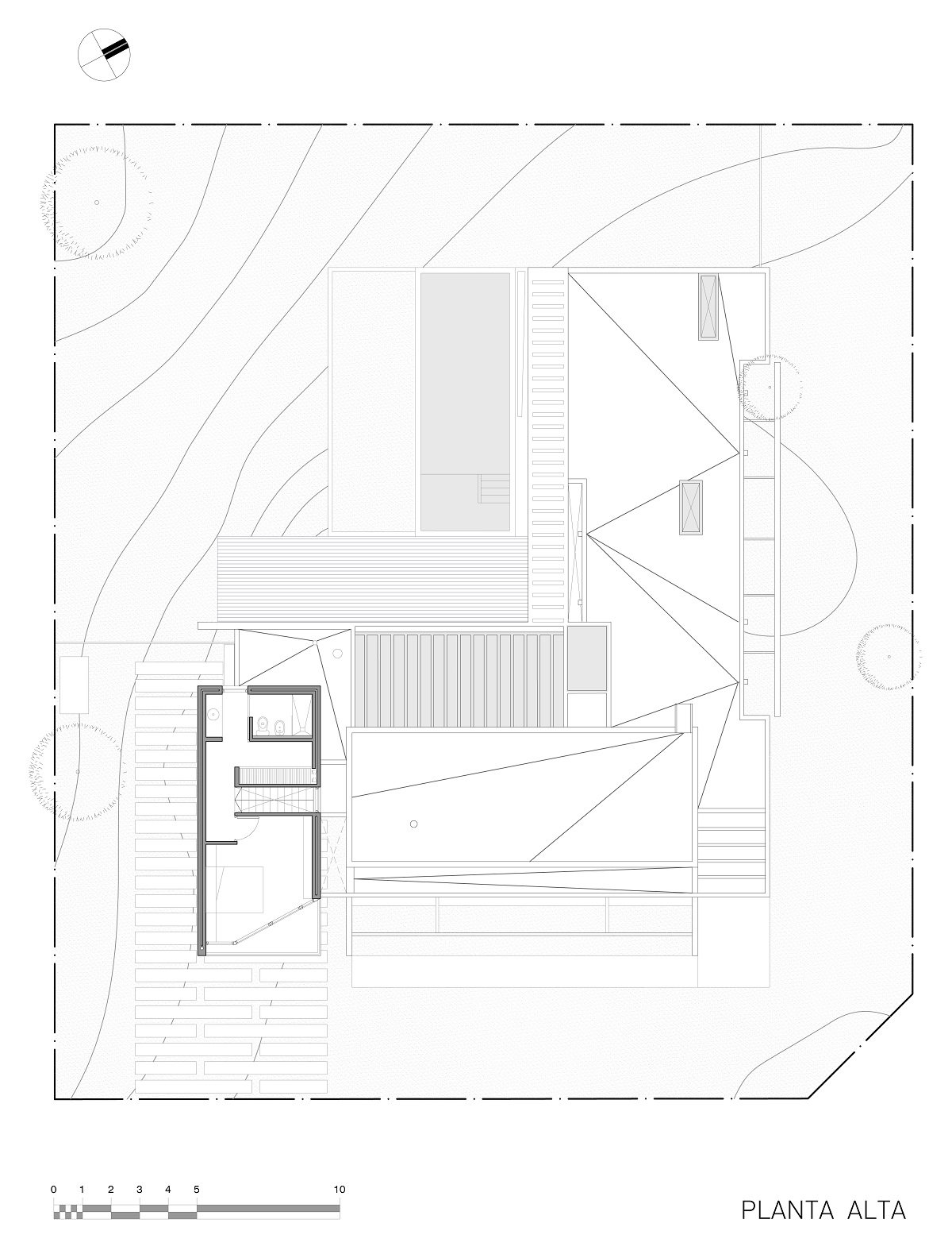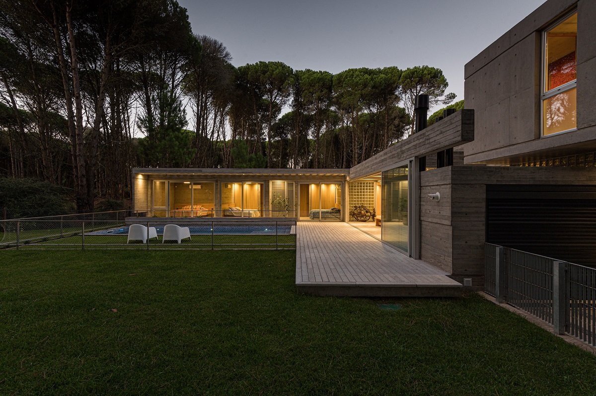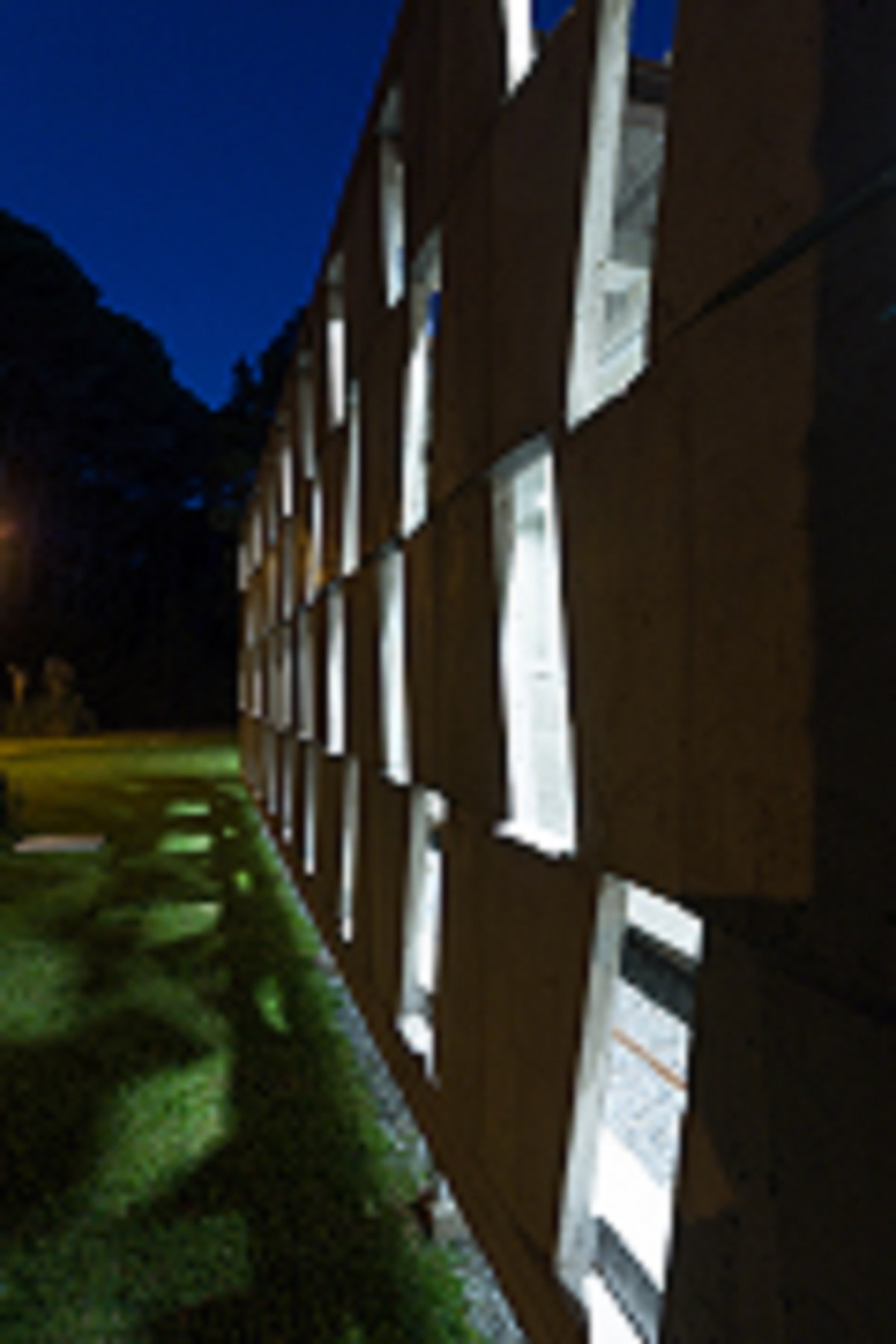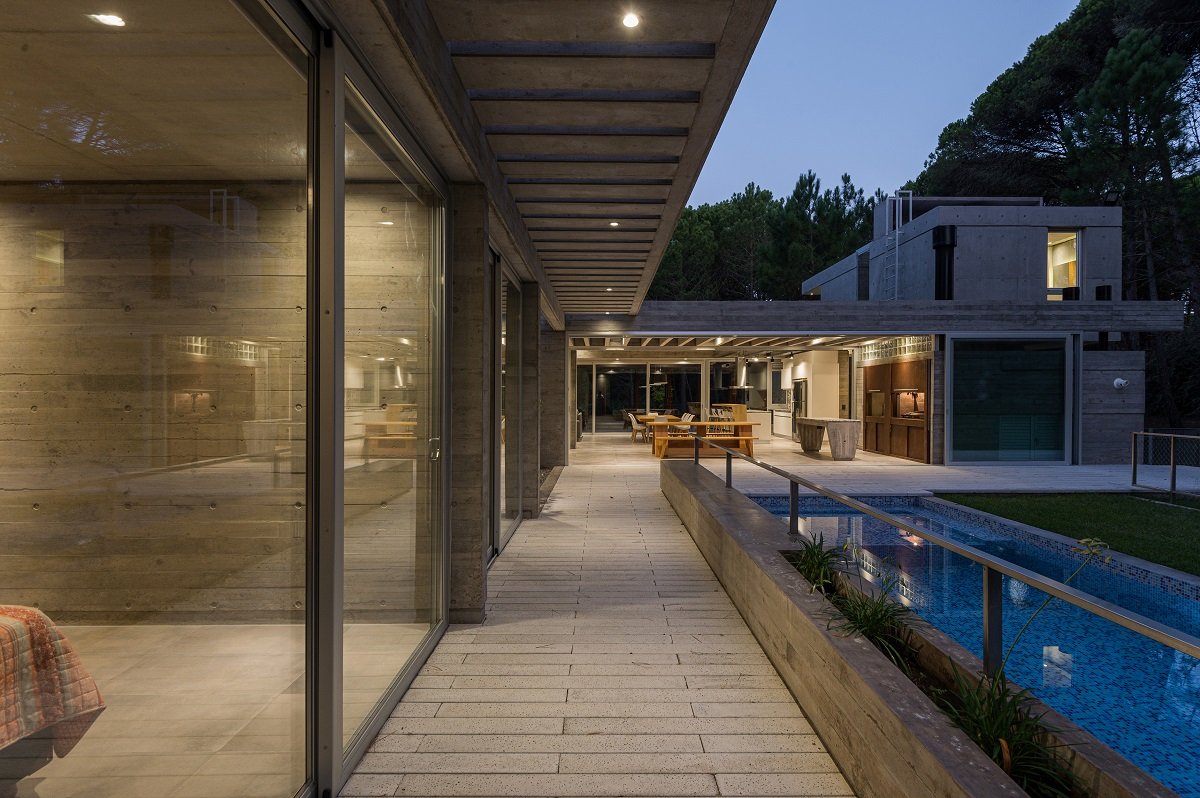 The residence presents an ambiguous relationship with the outside. The visual continuity of the interior is only randomly interrupted by pivot brisoleis which produce a playful and strongly personal character as the circumstantial occupants can temporarily modify the façade depending on their preferences or needs. To the longest street, a system of prefabricated concrete ‘scales’ allows the entrance of sunlight and closes the views of the internal circulation from the street. Facing a pine reserve, the social areas dominate the surroundings by been lifted from the lot level while a system of pivot brisoleis solve the different degrees of openness.