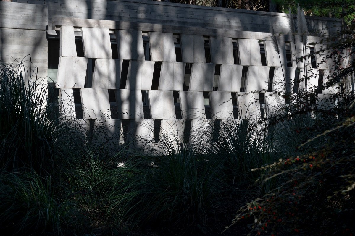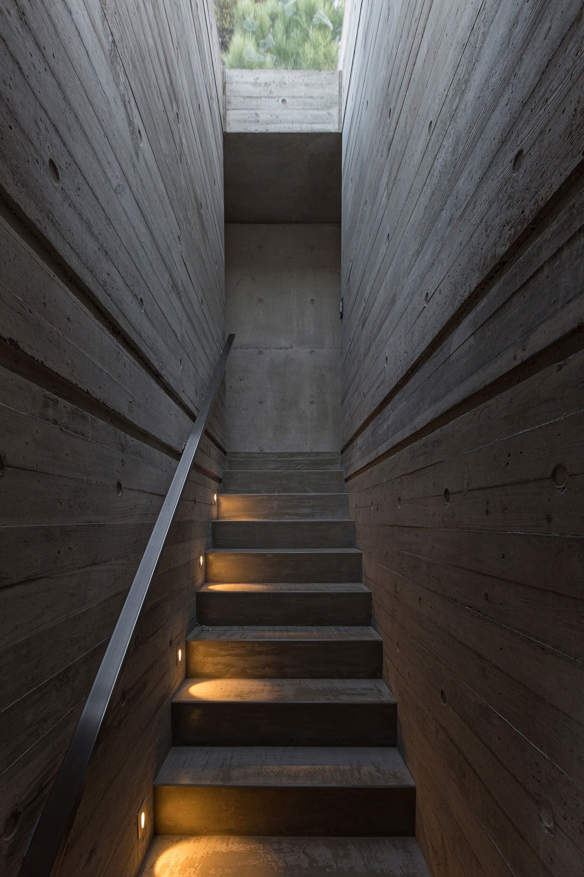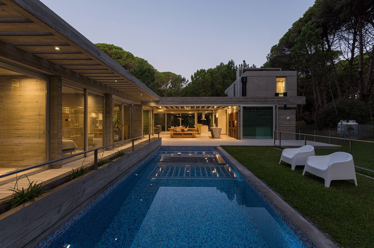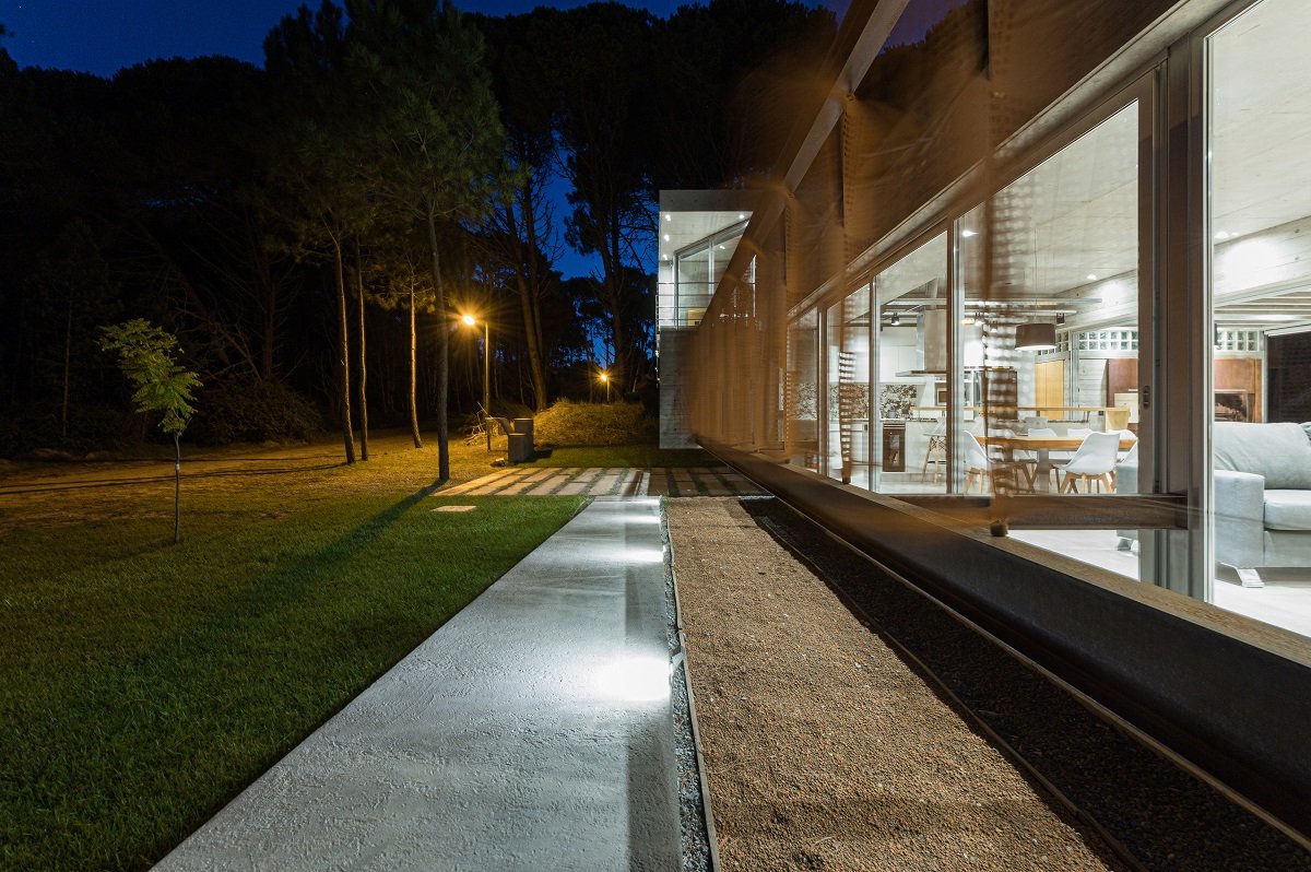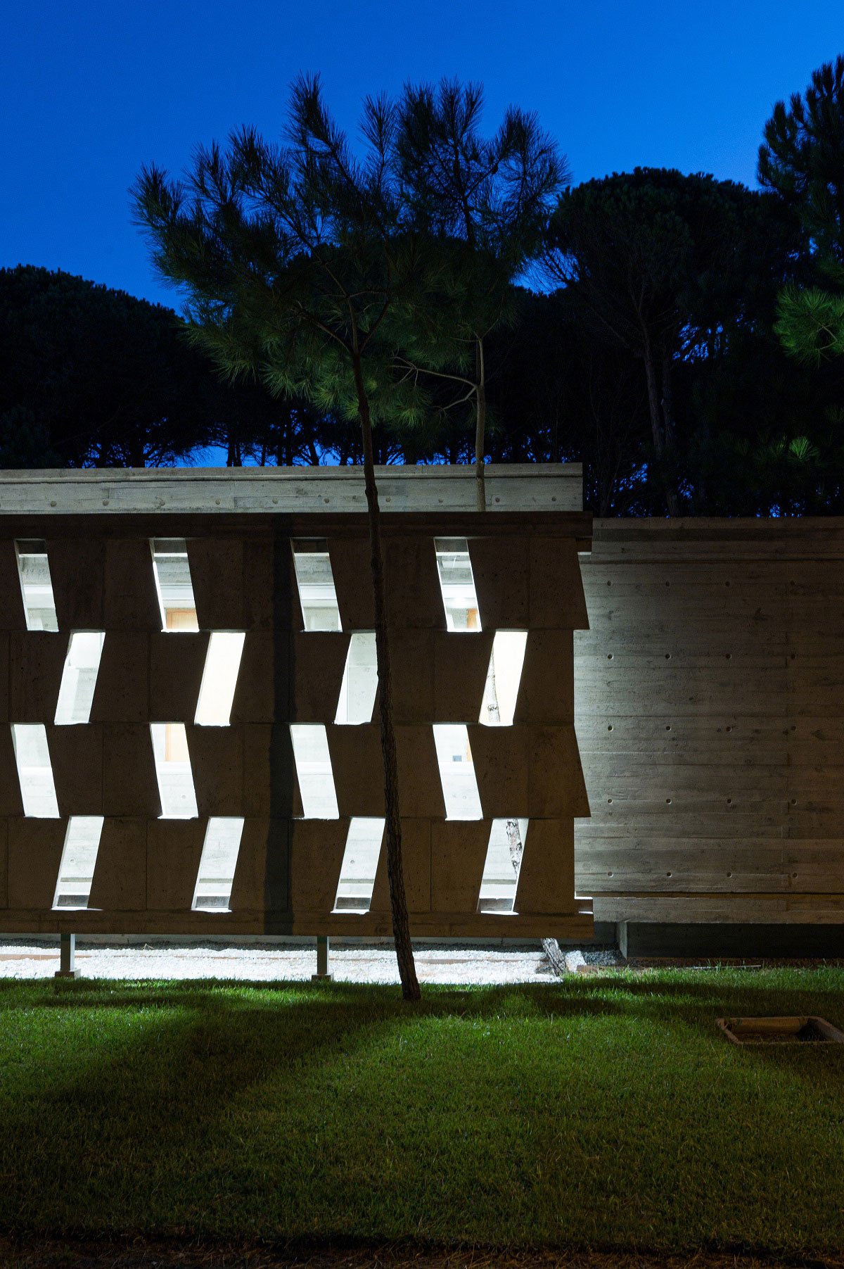 The residence presents an ambiguous relationship with the outside. The visual continuity of the interior is only randomly interrupted by pivot brisoleis which produce a playful and strongly personal character as the circumstantial occupants can temporarily modify the façade depending on their preferences or needs. To the longest street, a system of prefabricated concrete ‘scales’ allows the entrance of sunlight and closes the views of the internal circulation from the street. Facing a pine reserve, the social areas dominate the surroundings by been lifted from the lot level while a system of pivot brisoleis solve the different degrees of openness.