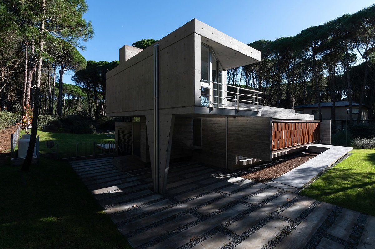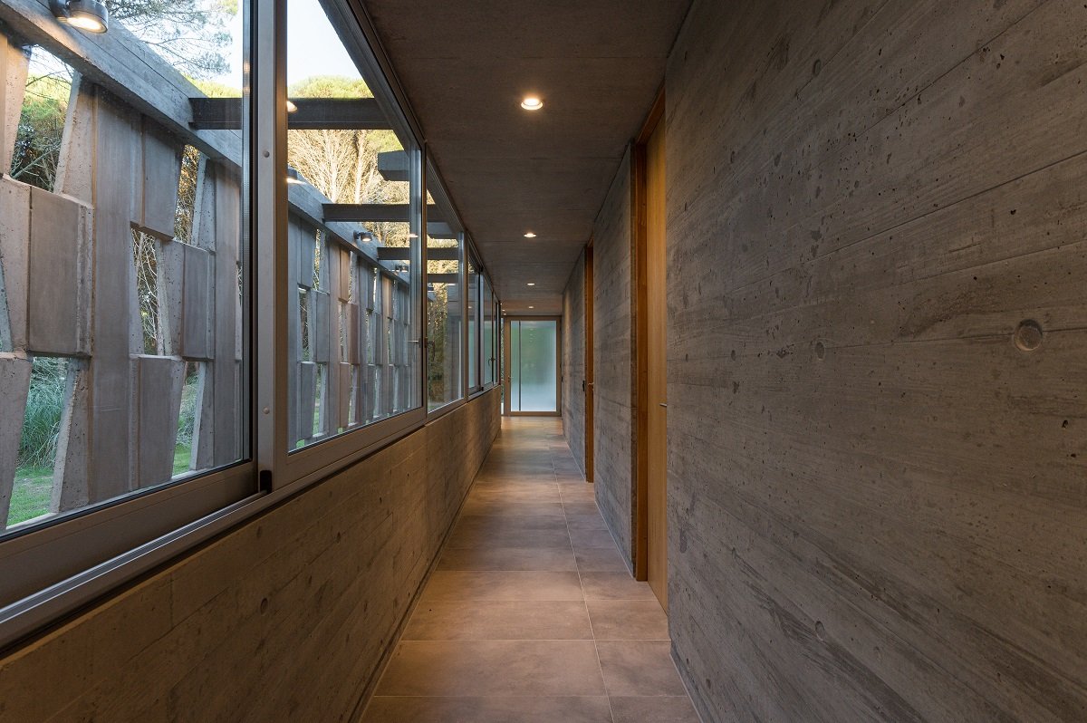 The new pine boards used in the formwork print a distorted natural image on the concrete. The exposed reinforced concrete is, by definition, contradictory as the frame remains in the inside and the only thing we see is 2 or 3 mm –a ‘thin skin’- of concrete. Even though we do not perceive the forces, we know that the composite material is resisting compression and traction with the iron bars protected by the concrete.