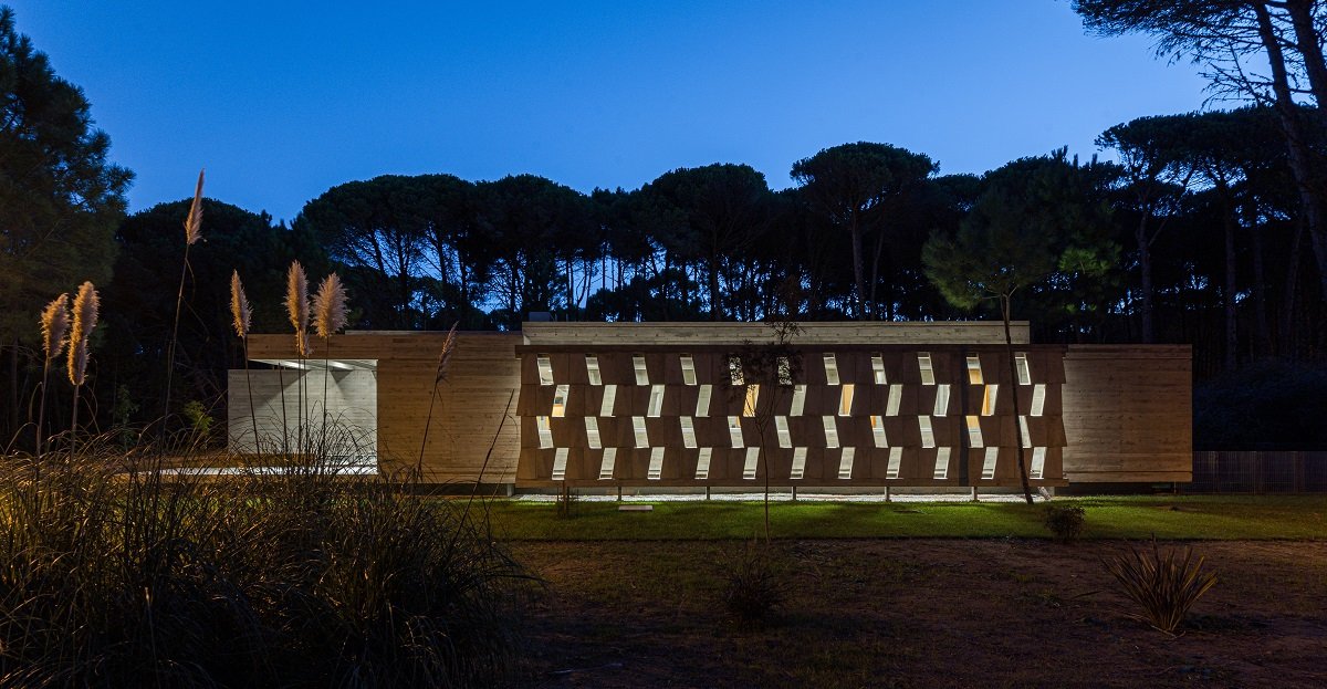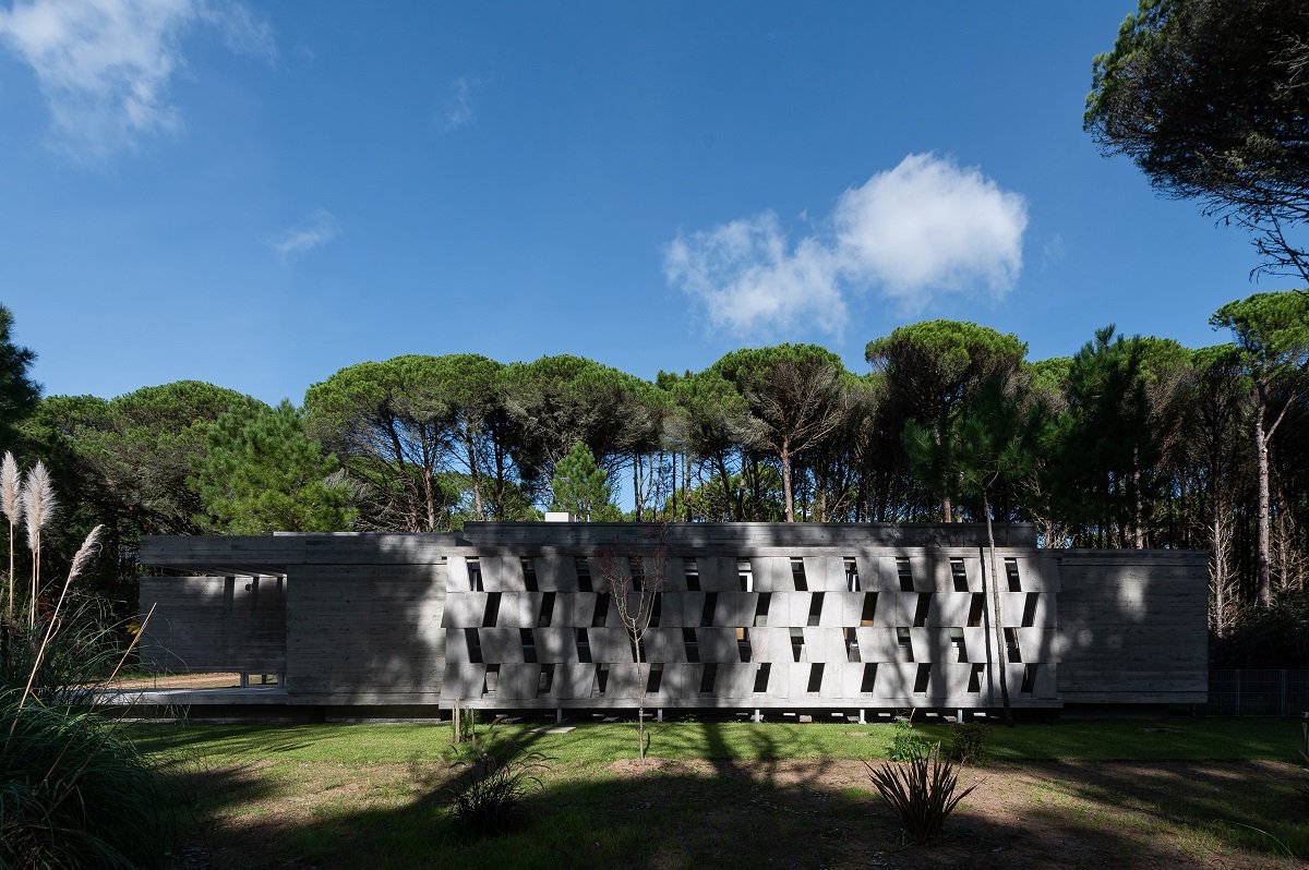 Excerpt: Casa Galatea is a vacation home, designed by Estudio Galera, built in Constancia neighbourhood, in a four-block-appendix in the south of Cariló, a seaside town situated 400 km from Buenos Aires. The residence presents an ambiguous relationship with the outside. The visual continuity of the interior is only randomly interrupted by pivot brisoleis which produce a playful and strongly personal character as the circumstantial occupants can temporarily modify the façade depending on their preferences or needs.