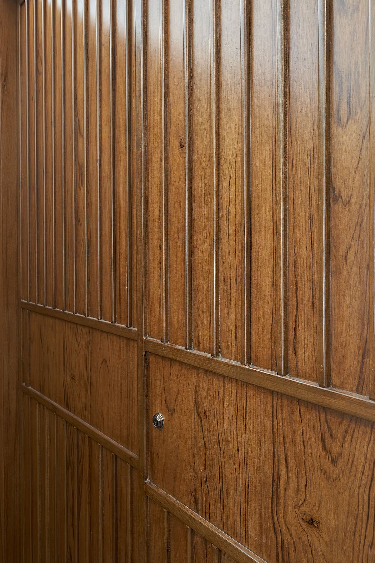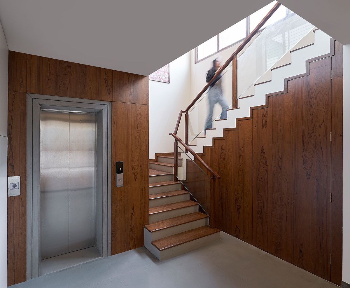 A key architectural highlight lies in the ingenious layout of the residence. To mitigate the vertical tower effect and evoke the warmth of an independent bungalow, the first and second floors are ingeniously amalgamated into a unifying volume framed with extended beams and clad with wooden aluminium batons. Also the third floor of the bungalow is pushed back from the front façade to make it feel visually lighter, these architectural features not only breaks the scale of the building but also enhances its aesthetic allure.