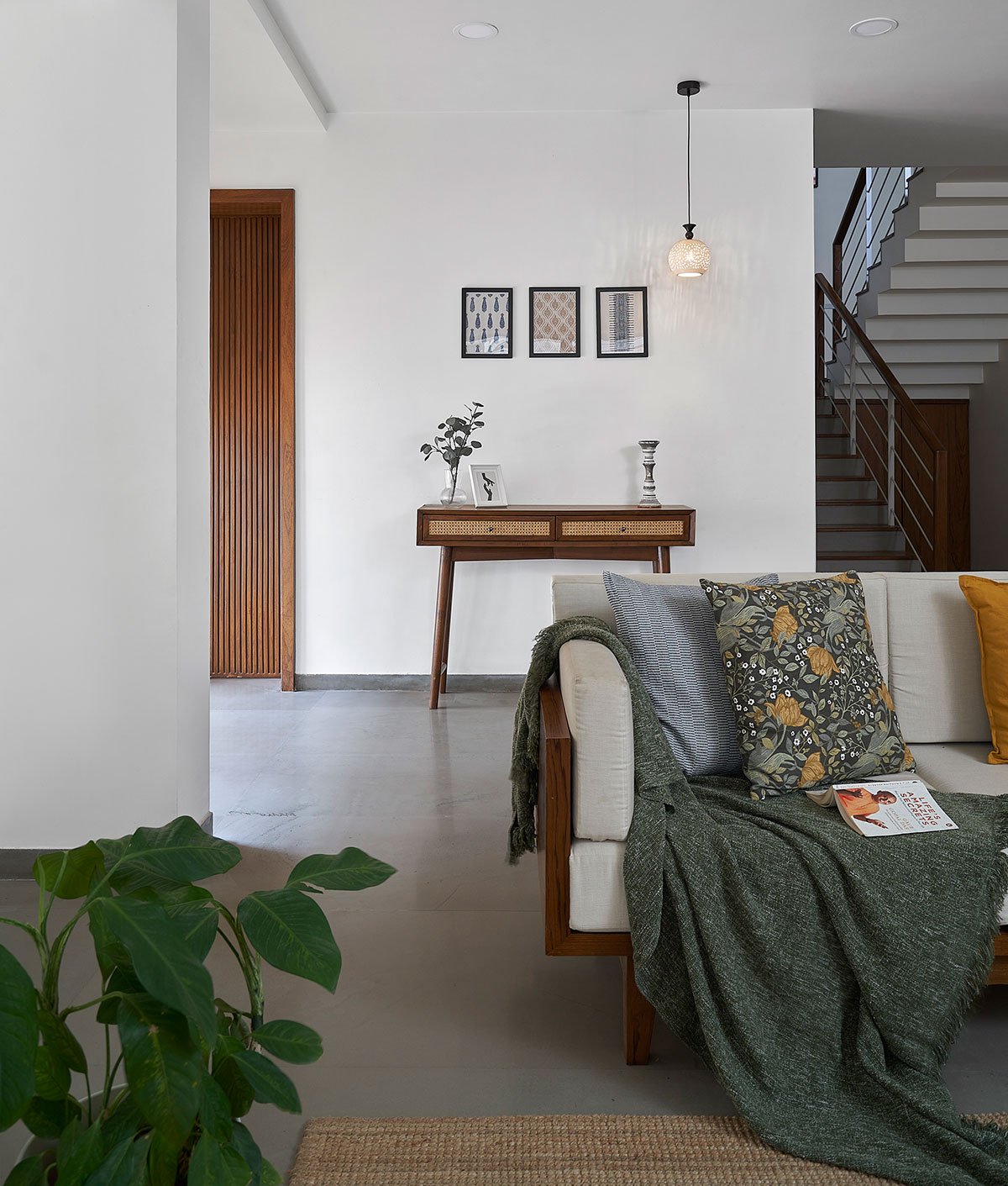 Step inside, and one is greeted by an interior that seamlessly marries Indian contemporary aesthetics with timeless elegance. The grey sandstone flooring serves as a canvas for the interplay of light and shadow, further enhancing the visual appeal of the space.