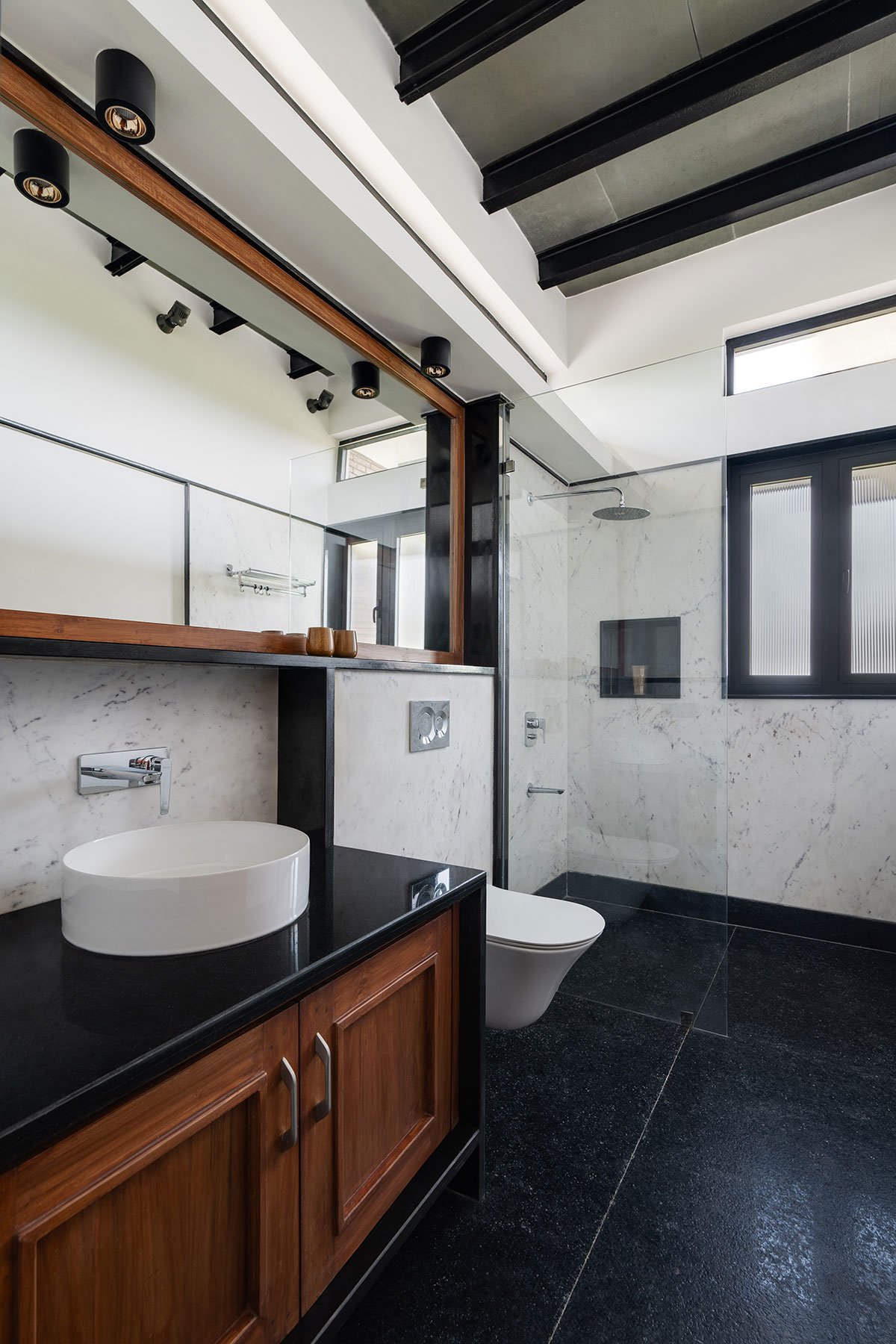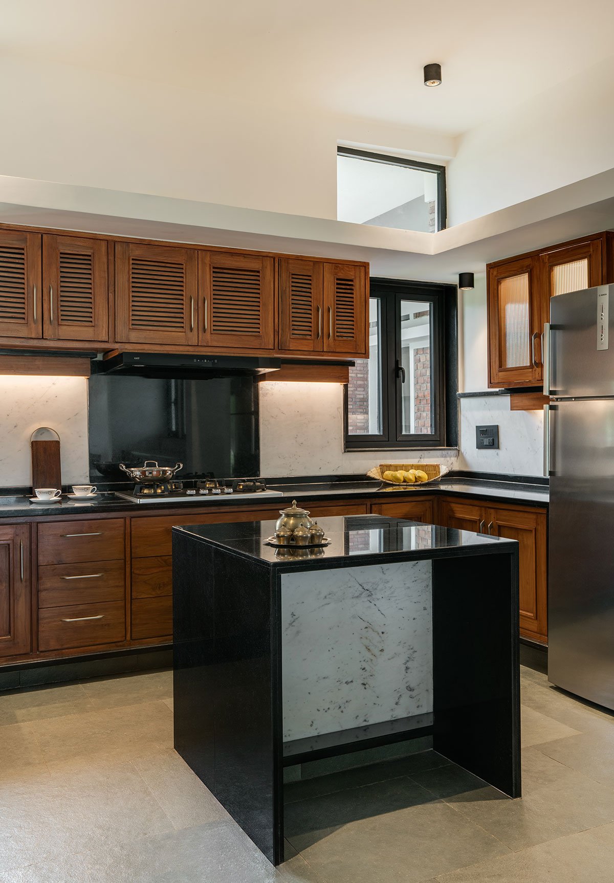 All walls are thick load bearing structures that provide insulation to interior spaces, while rough natural stone complemented with built-in marble and granite furniture and utilities, have been extensively used throughout the building. Continuous lintel level projections provide ample overhead storage space for farm produce and pickling jar collections to preserve foods.