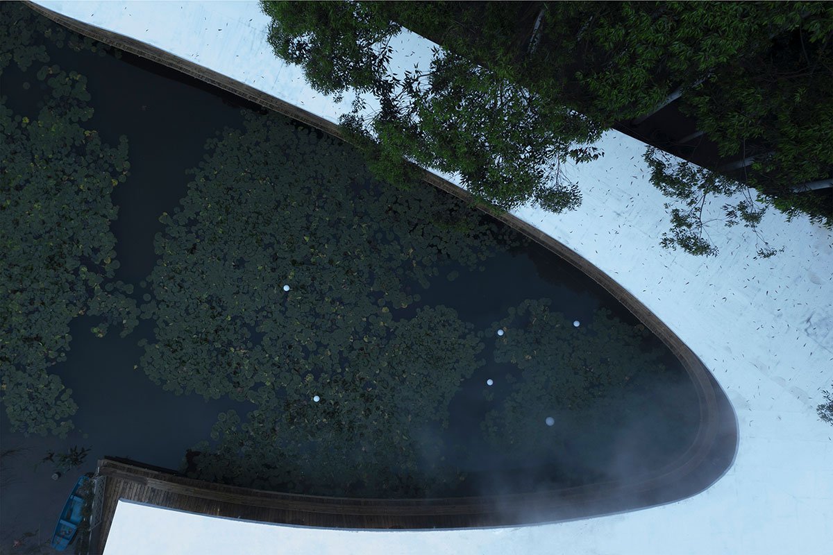 The natural environment of the site is beautiful but complex. Tens of eucalyptus trees must be preserved, and the terrain is tortuous with a maximum drop of nearly 2 meters. In order to respect the natural environment and minimize human intervention in this natural site, MUDA conducted manual mapping and recorded of the site in person, and the building was designed according to the location of eucalyptus trees and lake. Moreover, the free curve of the roof is designed according to the site characteristics and function.