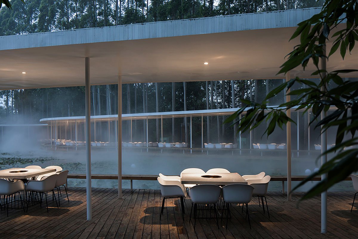 Garden Hotpot Restaurant is in the hinterland of Sansheng Township, surrounding a lotus pond, hidden in a eucalyptus forest. On the premise of paying the greatest respect to the natural environment, MUDA decides to eliminate the architectural scale, leaving out walls, only using pillars and boards to lightly hide the building in the woods, letting the building gently integrate with the site and delineating the shape of the lake in a light and peaceful way.