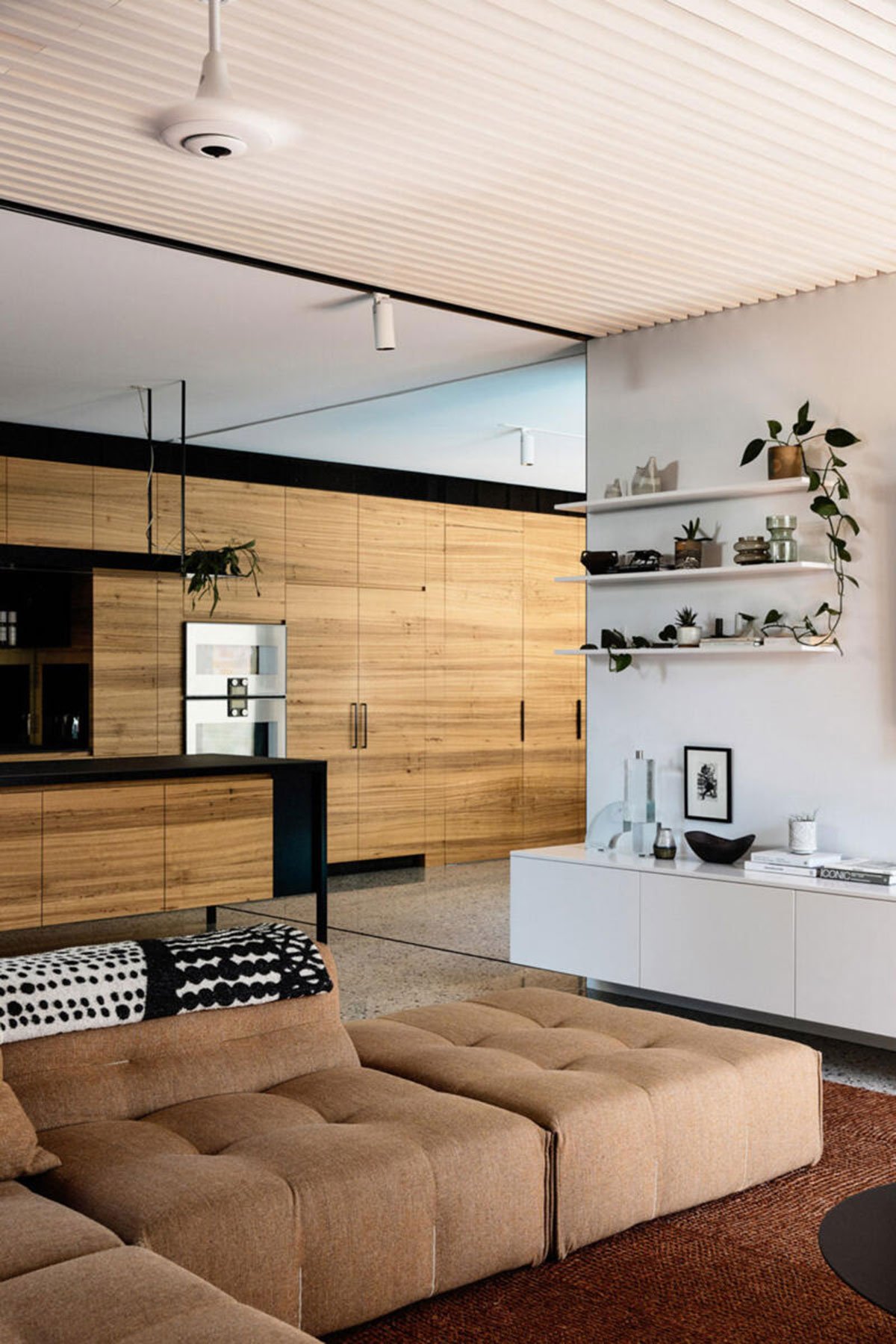 Internally there are concealed doors allowing for spaces to be opened up or sealed off. Large openings connect the inside with the garden, with seasonal outdoor spots such as the fire pit, shaded outdoor table, sunny lawn and heated pool. Garden House was designed to function off grid. The house is completely self-powered, all-electric with no connection to the gas network. Hot water, space heating and cooling, hydronic heating, pool heating – is all supplied by highly efficient heat pumps. Cooking is done on induction cooktops and electric fan-forced ovens (and a steam oven). The family’s electric car is also completely powered by the house, ensuring they never have to pay for power or fuel.