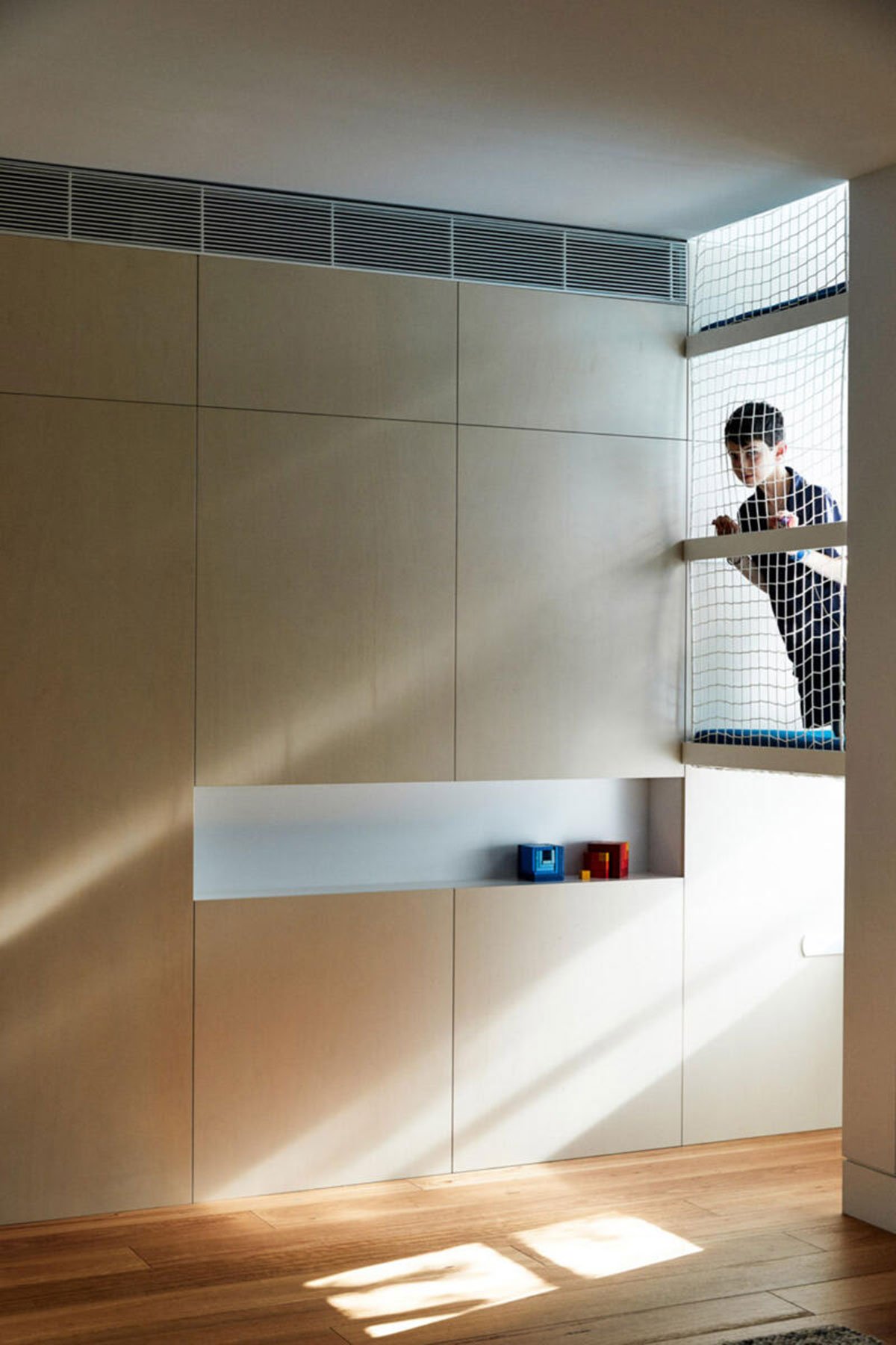 Though the owners wanted a home with the capacity to regularly entertain dozens of people, space for their three children to grow up and a dedicated office/conference room, they didn’t want the feeling of a big house. Instead the bulk of the home is broken up into four distinct elements appearing as separate buildings, ‘invisibly’ connected via mirrored glass corridors that reflect the deep-rooted garden. A two-car garage and workshop faces the street, with an all purpose rumpus room behind and home office/conference suite above. Living/ dining / kitchen (with hidden pantry and laundry) all open out to the garden. The main bedroom has an ‘open balcony’ lounge area and ensuite, while the children have a dedicated area with three bedrooms, two bathrooms, a TV/rumpus room and a netted play-stair.