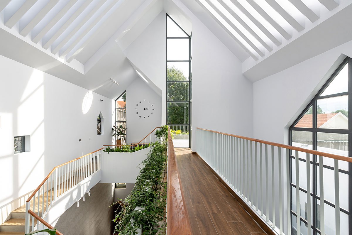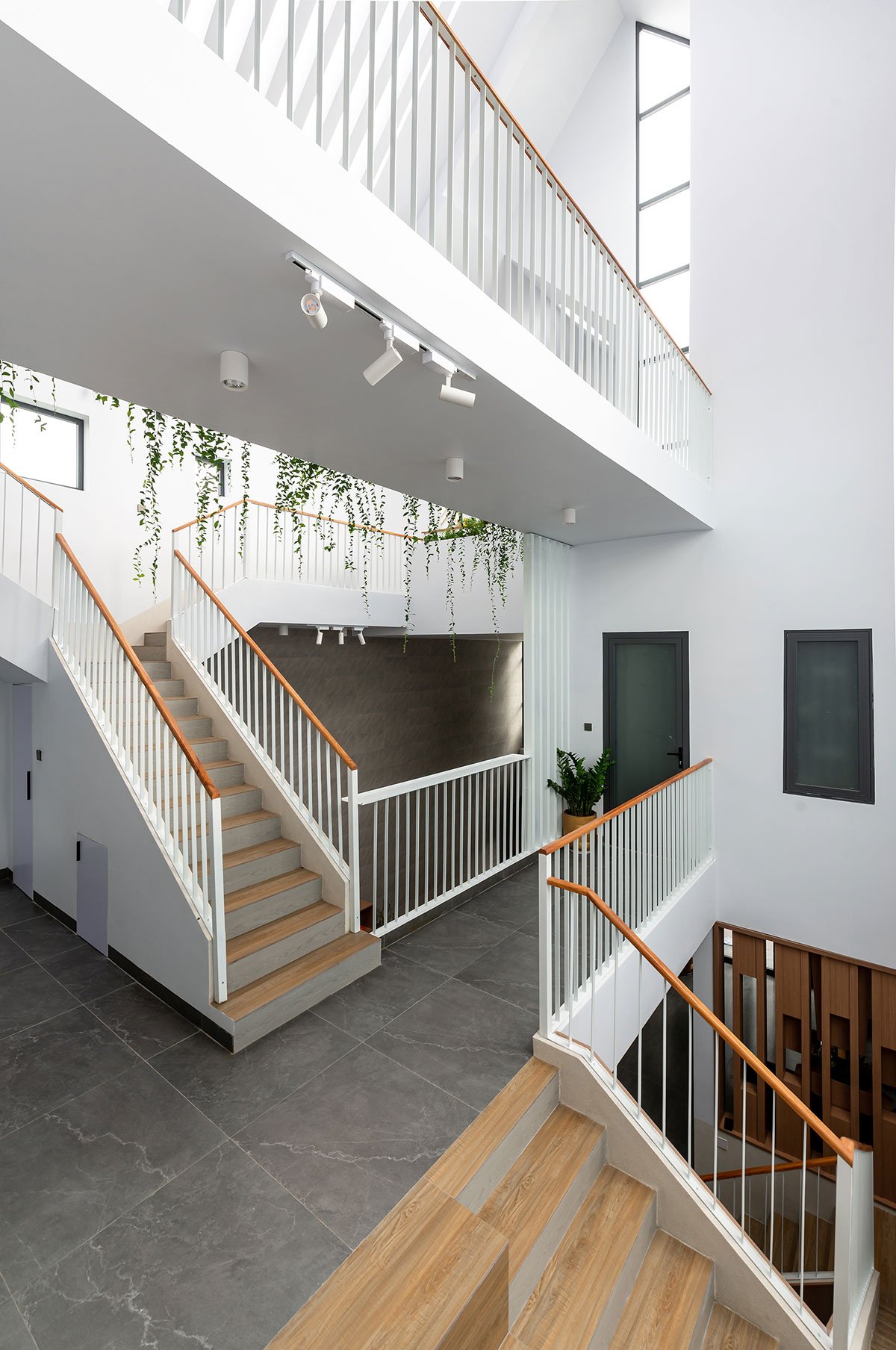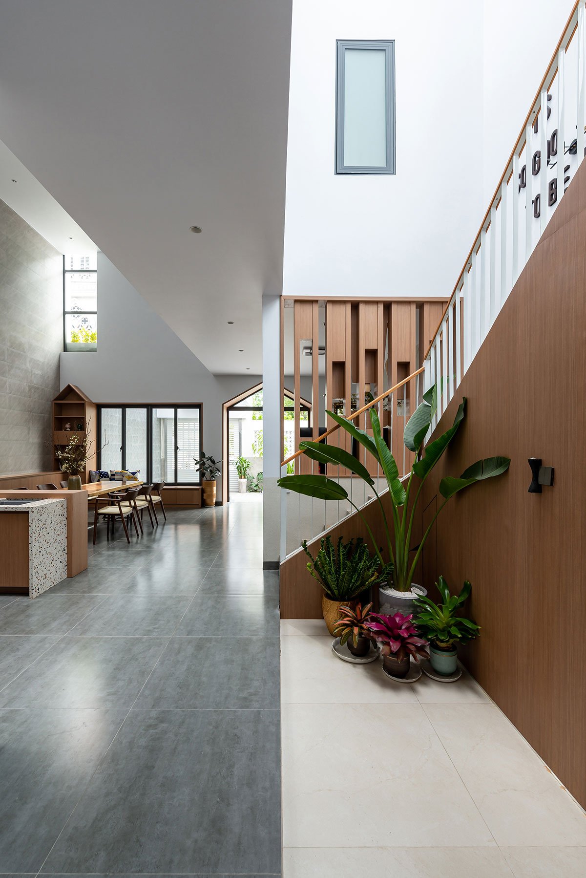 The roof space in the middle of the house is made of concrete slats combined with a glass roof to help bring in natural light, and with the spirit of a Catholic family When God created this world, created light. Therefore, natural light is very important, cutting many doorways in different positions combined with the glass roof in the middle of the house creates many alternating light rays on the wall to make the space interesting.