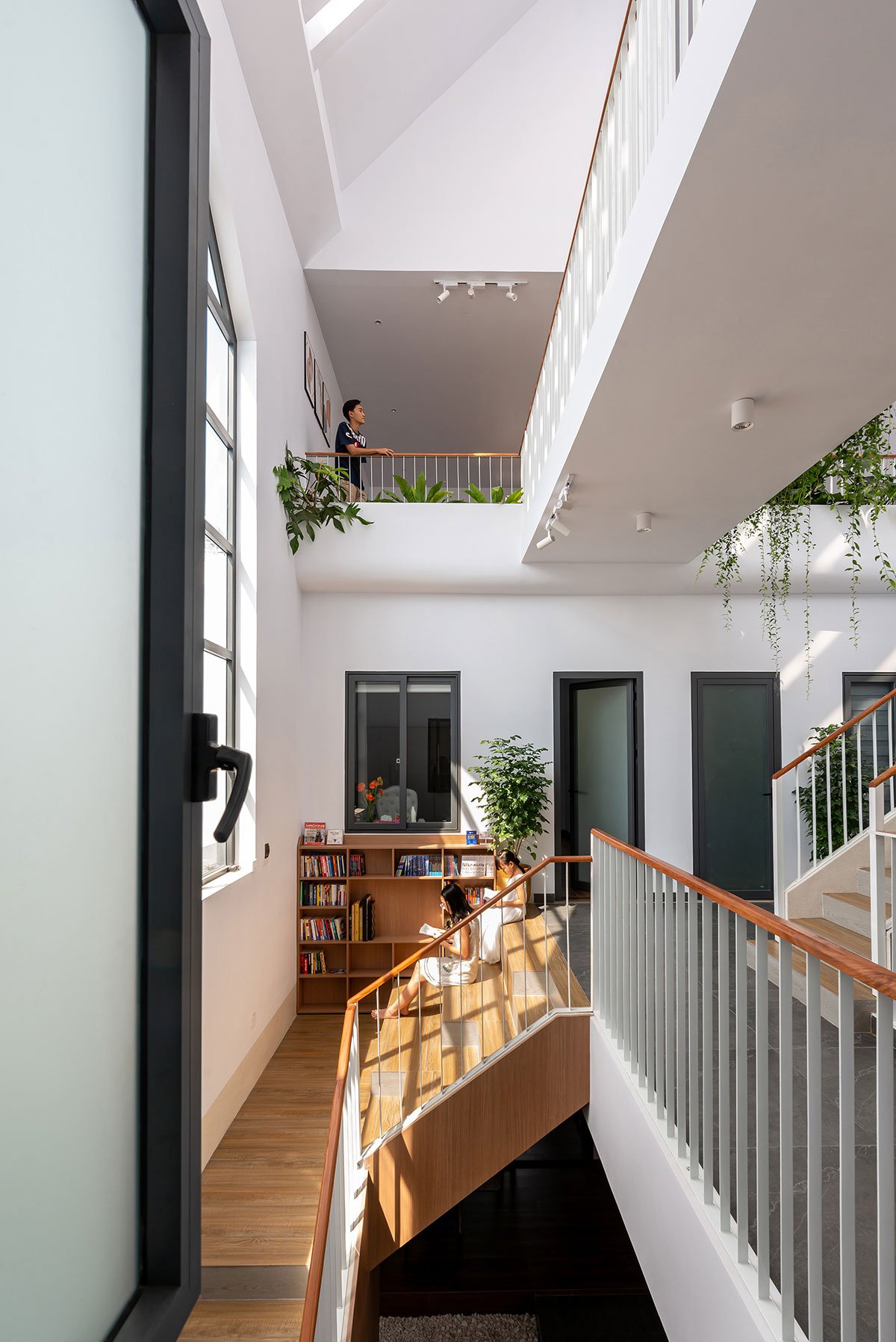 Up to the 2nd floor is the space for the children, including 3 bedrooms, these bedrooms face the lobby and common corridor, an area where the children can interact and connect regularly. The stair landing space is designed to be large to combine as a reading area, the wide corridor also incorporates a bar to relax together. And from the lobby, corridor, and stairs of the 2nd and 3rd floors, you can observe and connect the kitchen and living room areas thanks to the atrium. so that the children can watch the mother cook, and feel the taste of the food.