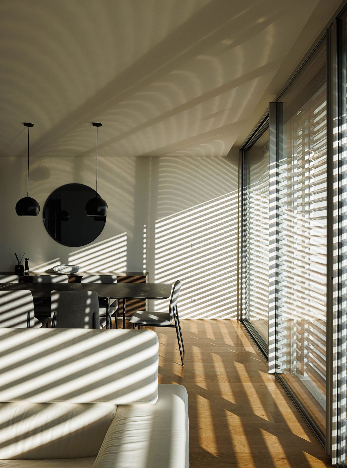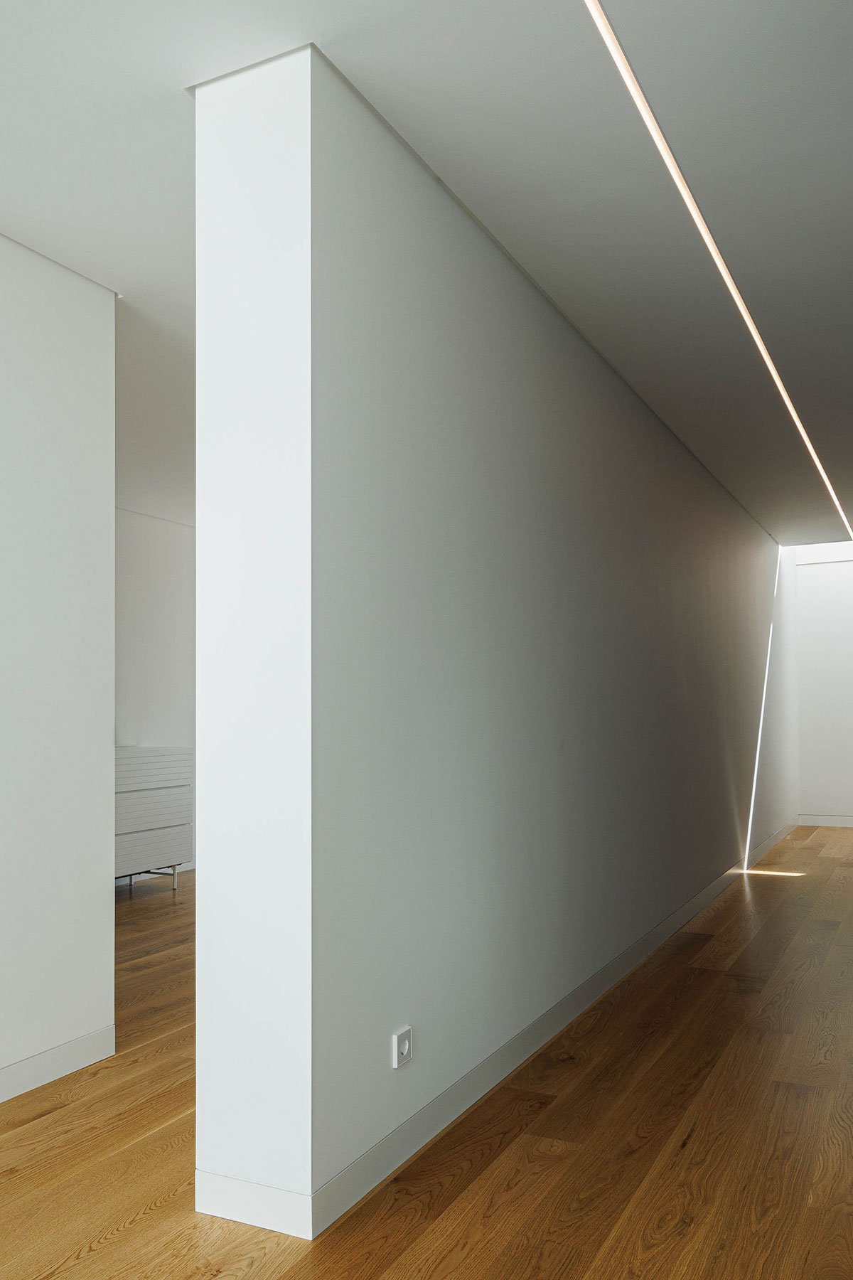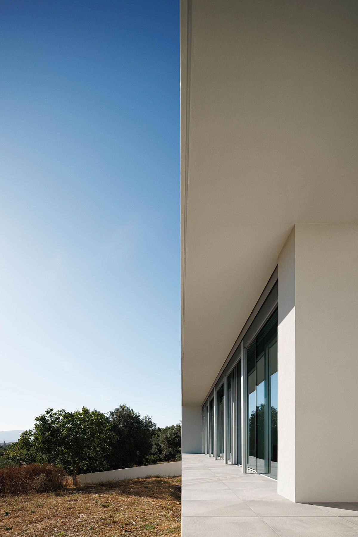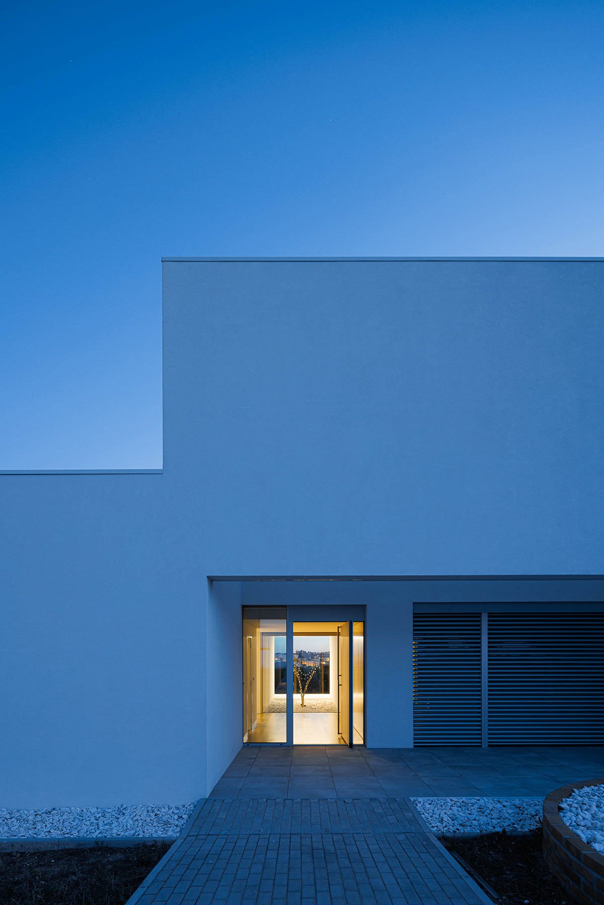 [Text as submitted by architect] The GD house is located in an urban area of Torres Novas, on a plot of land with an area of around 21 640.00 m2 and a construction area of 372.00 m2. It is built from a pure volume, with a clear and clean geometry, where the gestures and openings on the facades reveal the visual permeability and the interior/exterior relationship through large openings. The openings thus result from the abstract absence of continuity/discontinuity of the façade, creating a house with a unique and purely abstract identity, which allows you to contemplate the Castle, the city of Torres Novas, and the Serra de Aire.