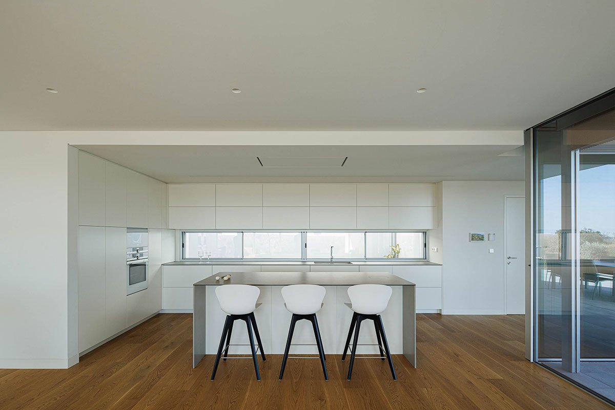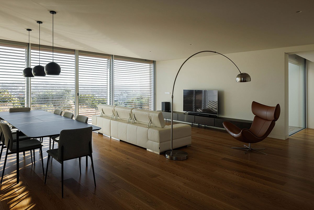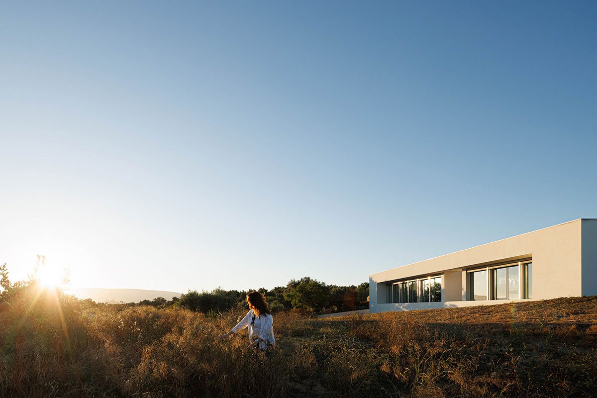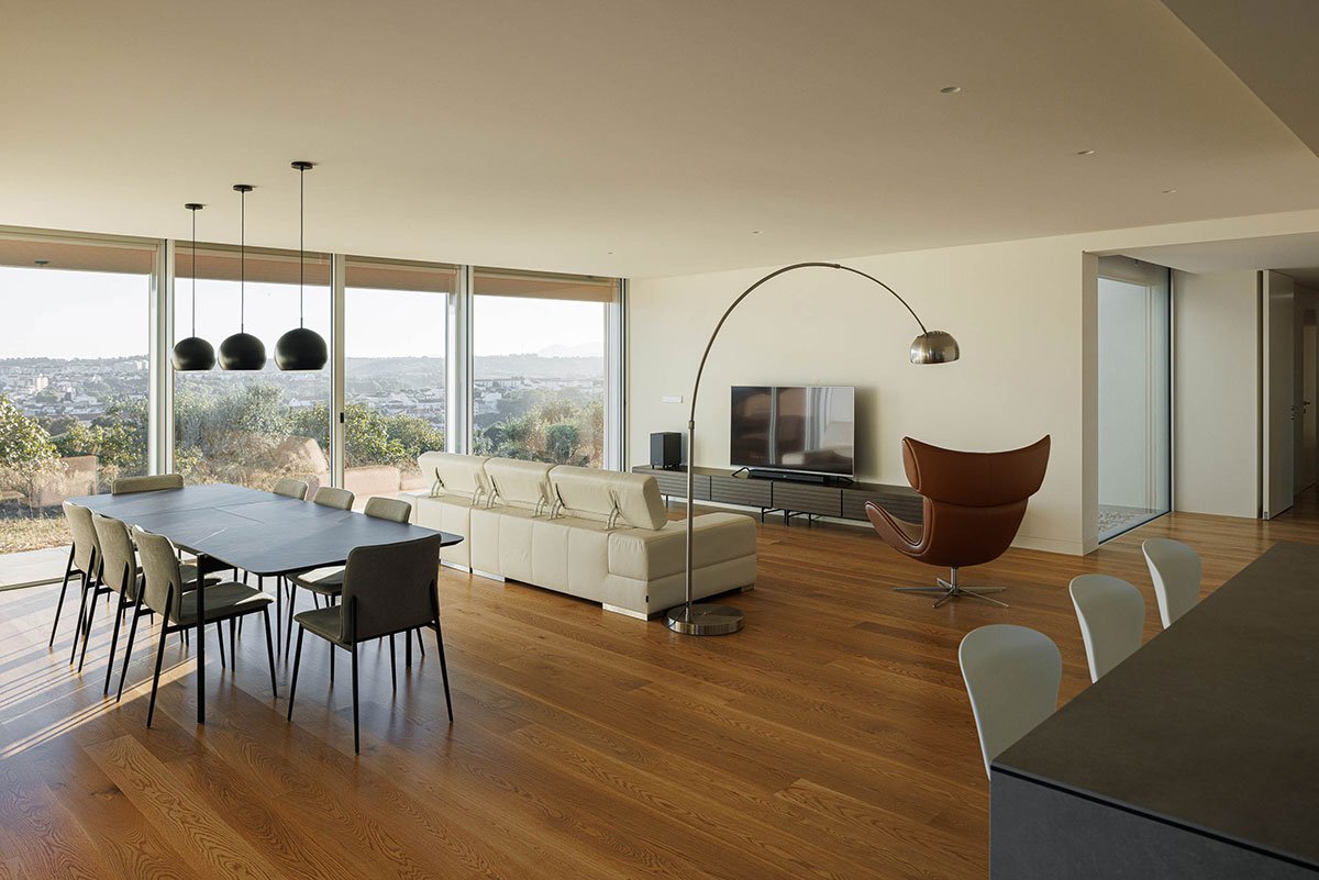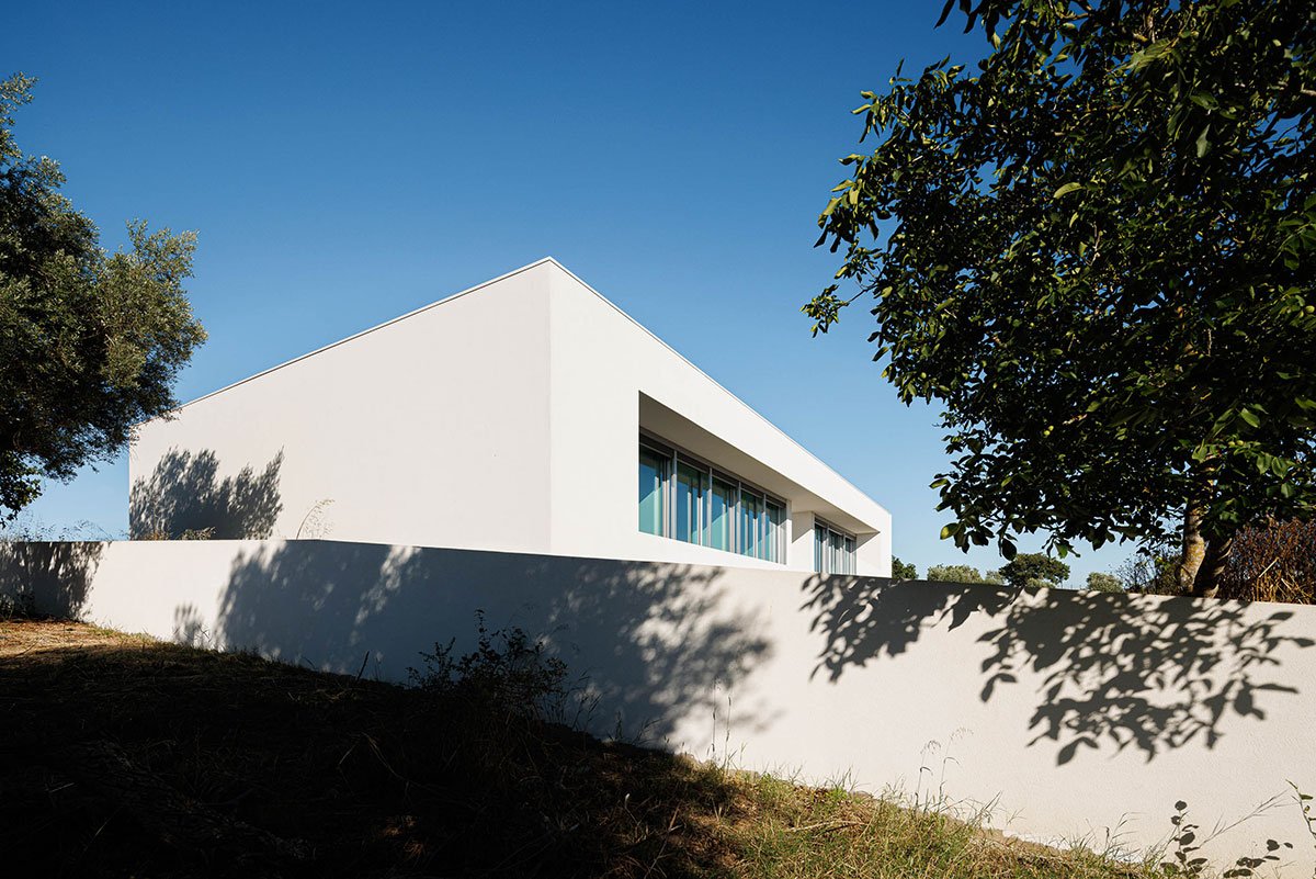 The volume rising to the east reveals the entrance to the house. Entering the living space, the distribution atrium allows a visual extension framed by the Torres Novas Castle. The courtyard, the house’s generating element, mediates the social space from the private space and the east-facing patios guarantee privacy and natural lighting and ventilation for spaces such as the kitchen and sanitary installations.
