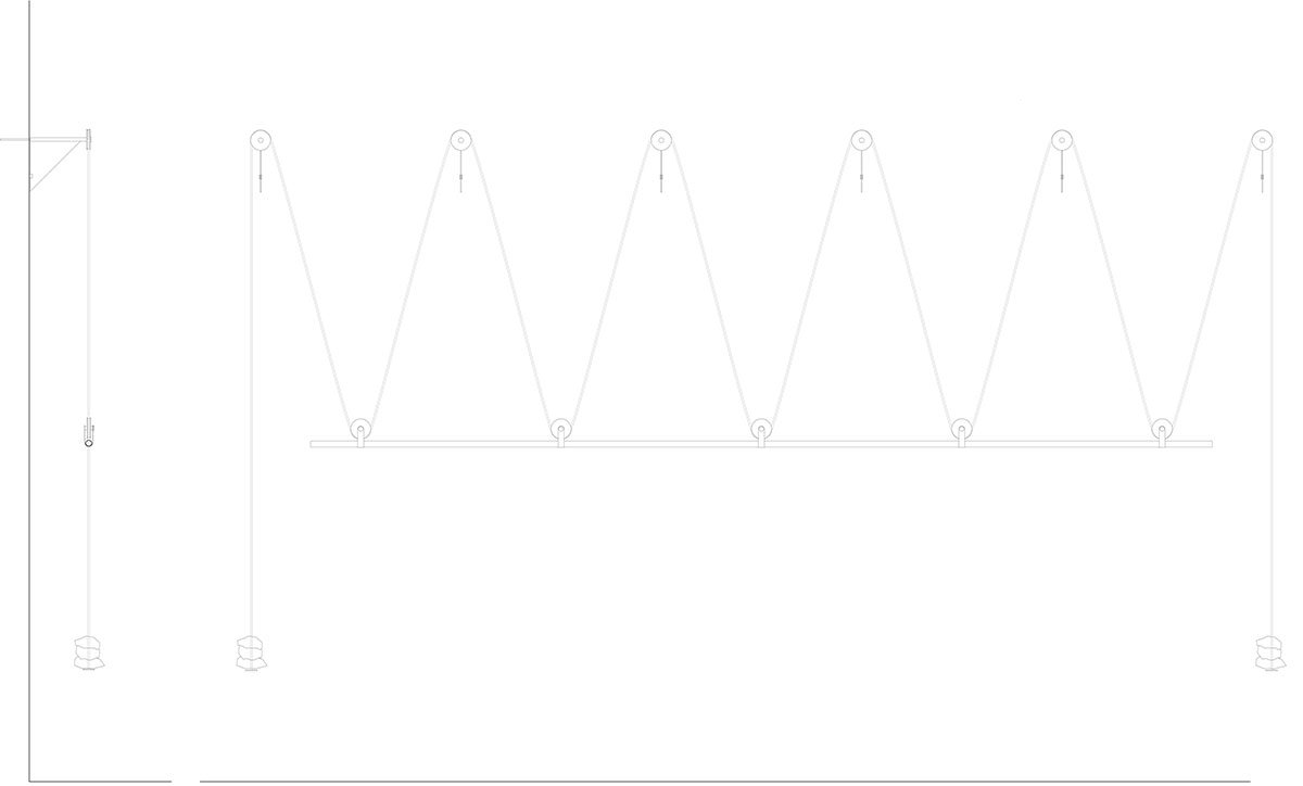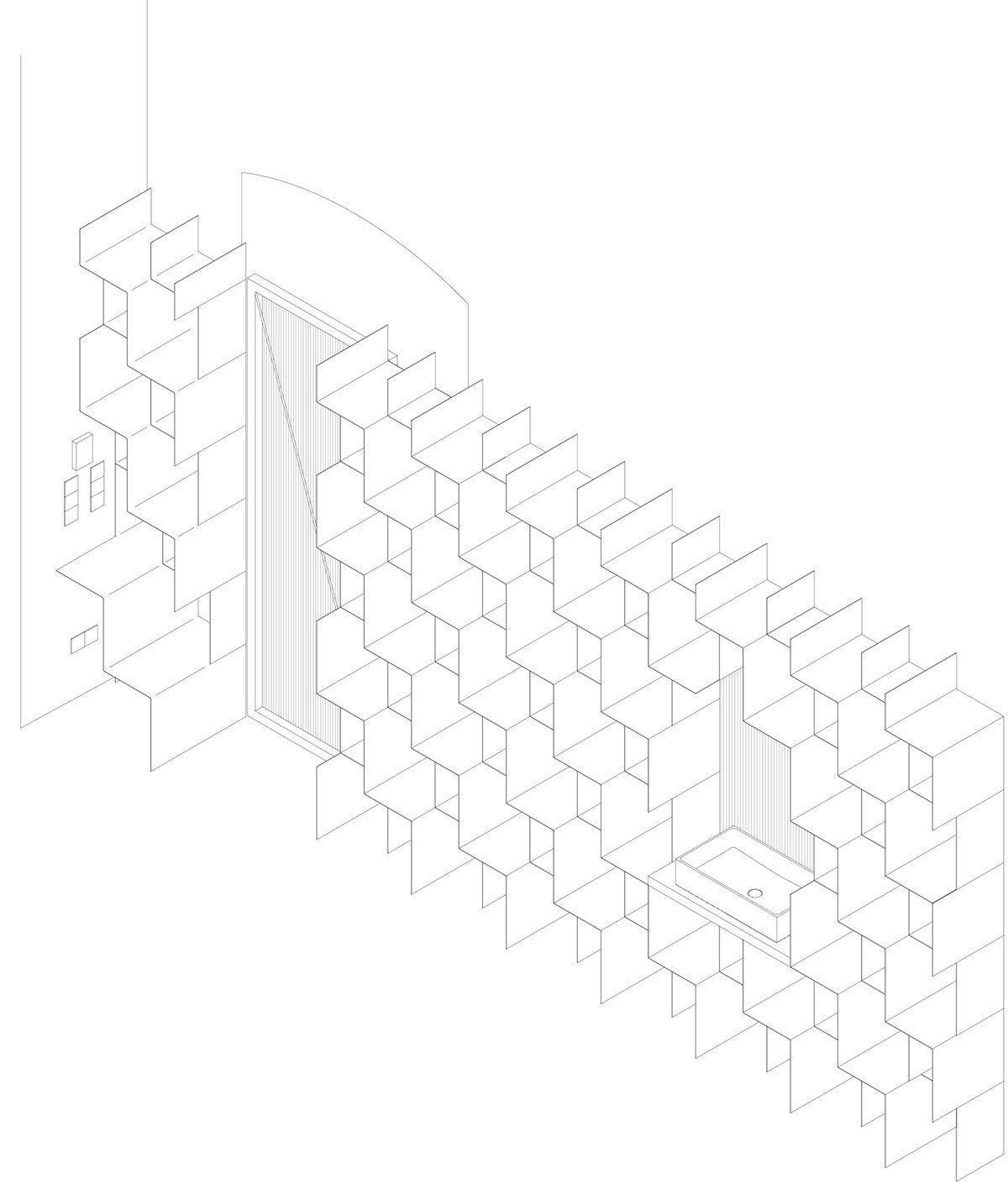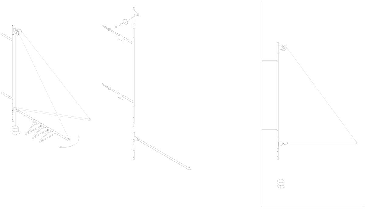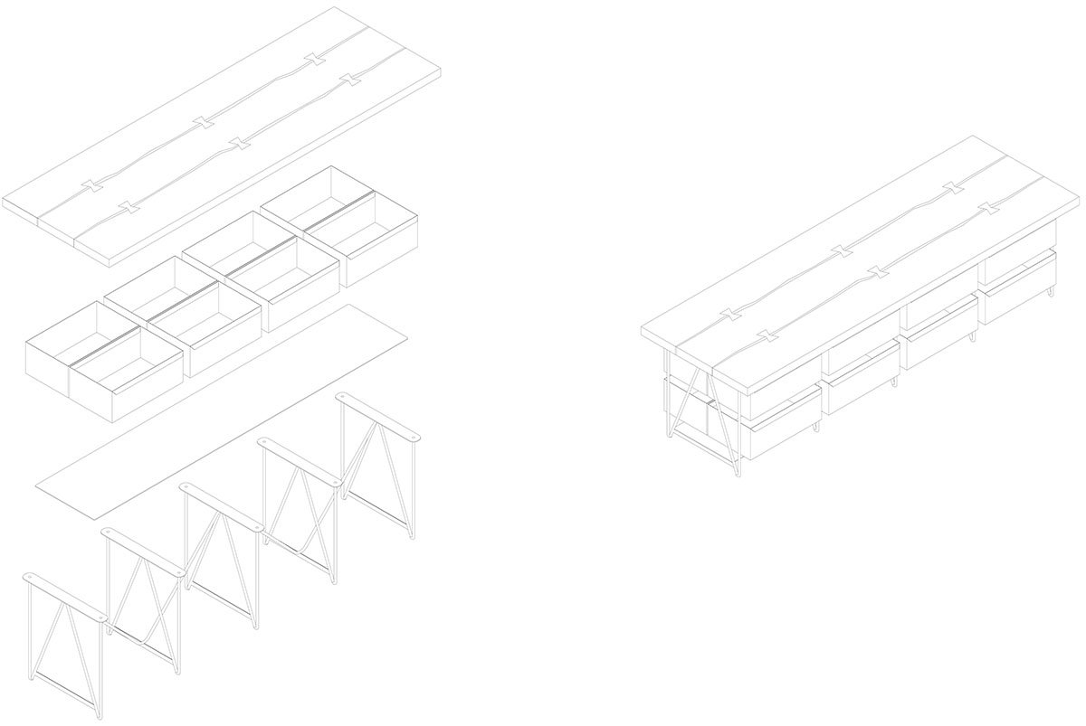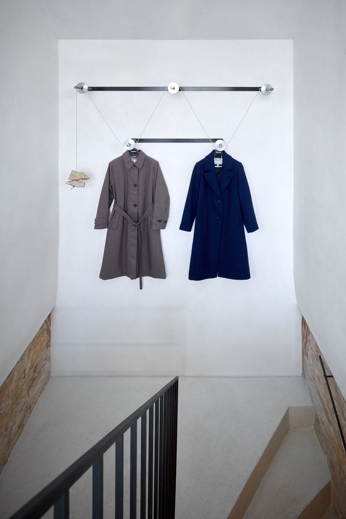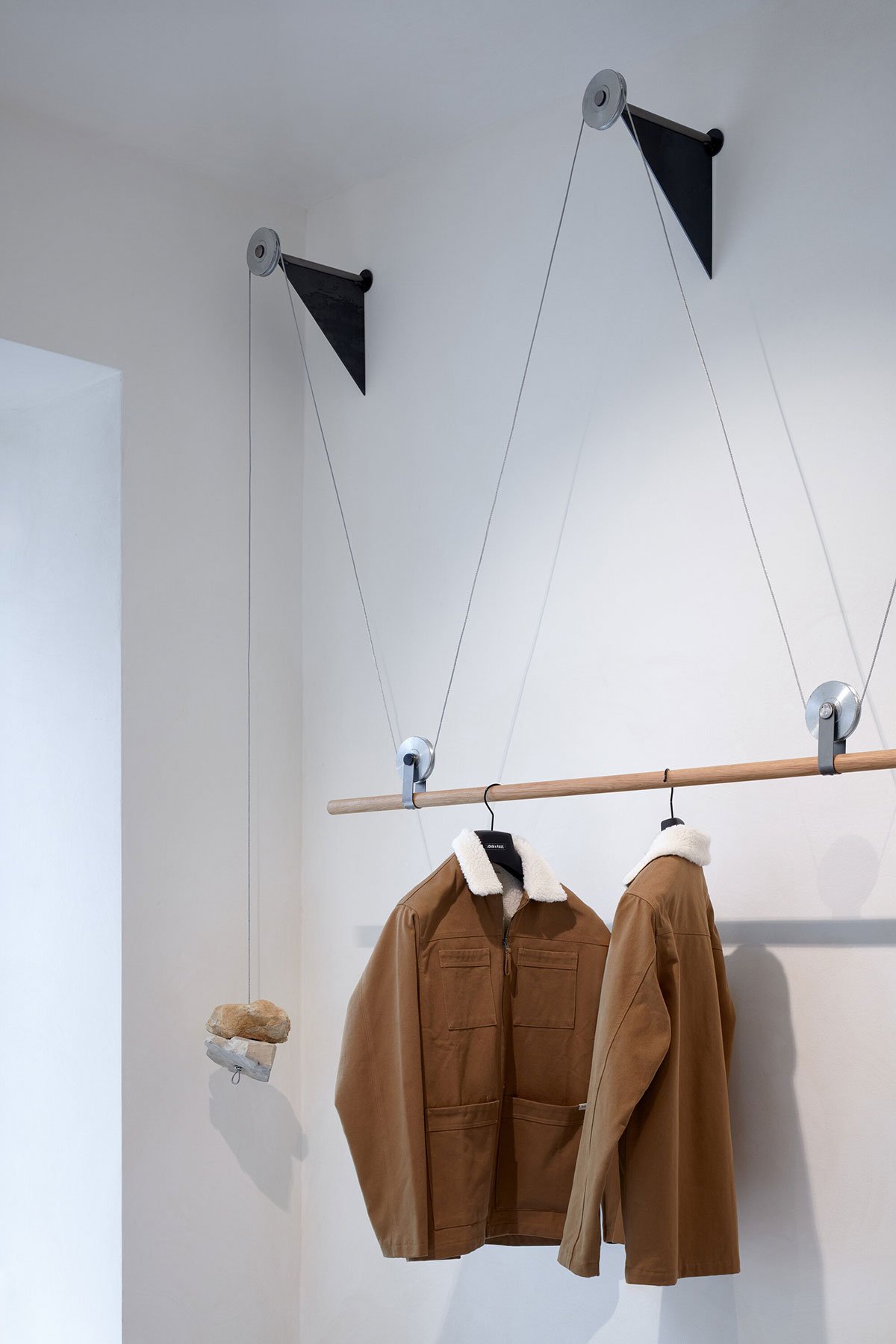 Lightweight hangers, subtle in appearance but capable of holding large quantities of clothing, emphasize the lightness of the design. These practical elements are balanced by rough stones that were uncovered during the building’s renovation and repurposed from the backyard where the landlord had stored them. Folded sheet metal is used to create shelves, following a simple and repetitive motif. Most of the shelves remain open, allowing the products to be displayed freely without the need for concealment.