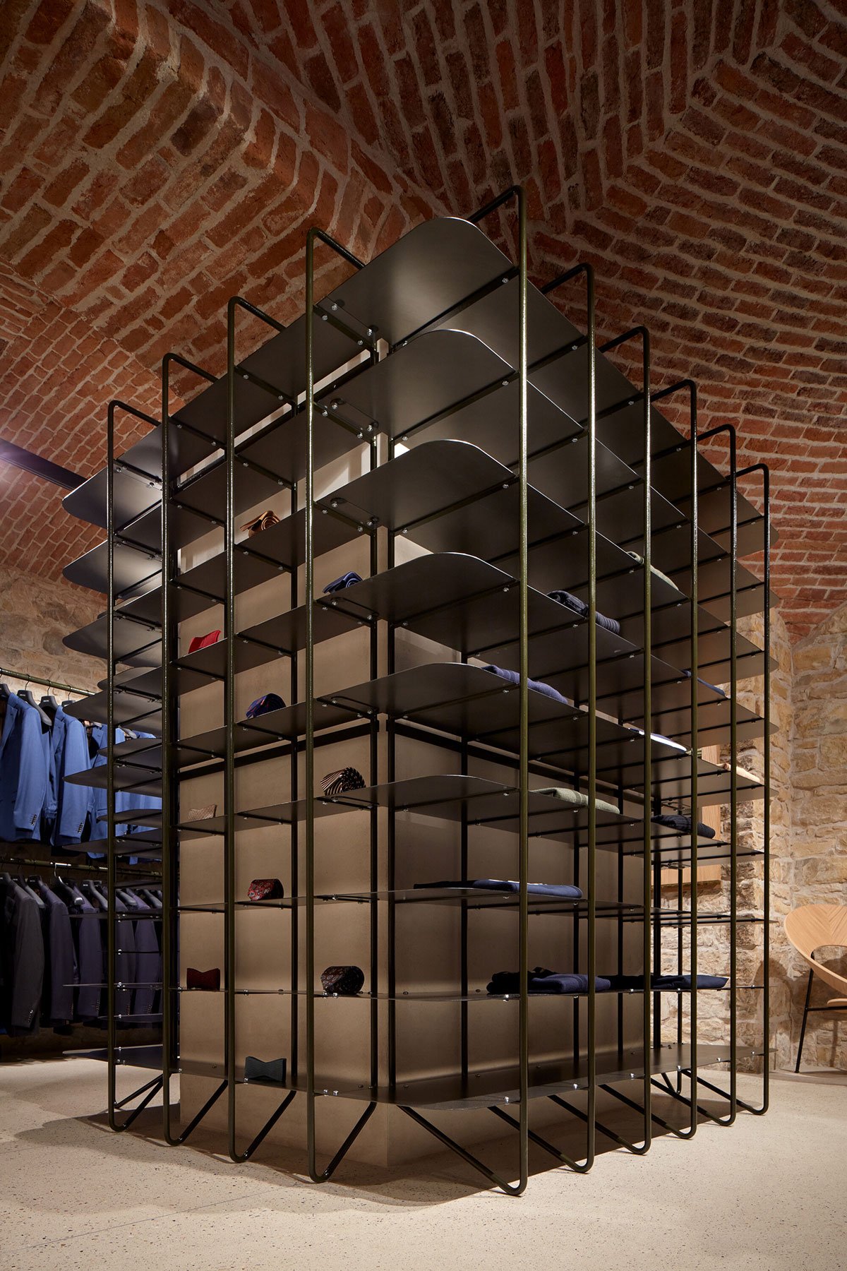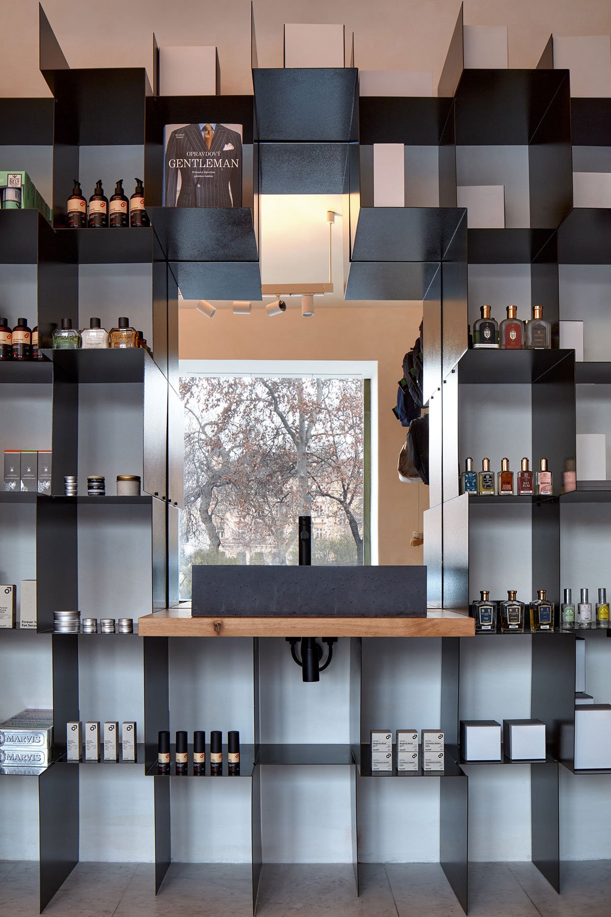 Excerpt: Gentleman Store by ORA and třiarchitekti is a project centered around building refurbishment and its interior design. Třiarchitekti reimagines an existing basement, converting it into a commercial space while preserving the unplastered structure and adding a new concrete floor. ORA’s interior design complements the architecture, enhancing the space without overpowering it. The design aims to showcase quality goods in a balance between emptiness and overcrowding.