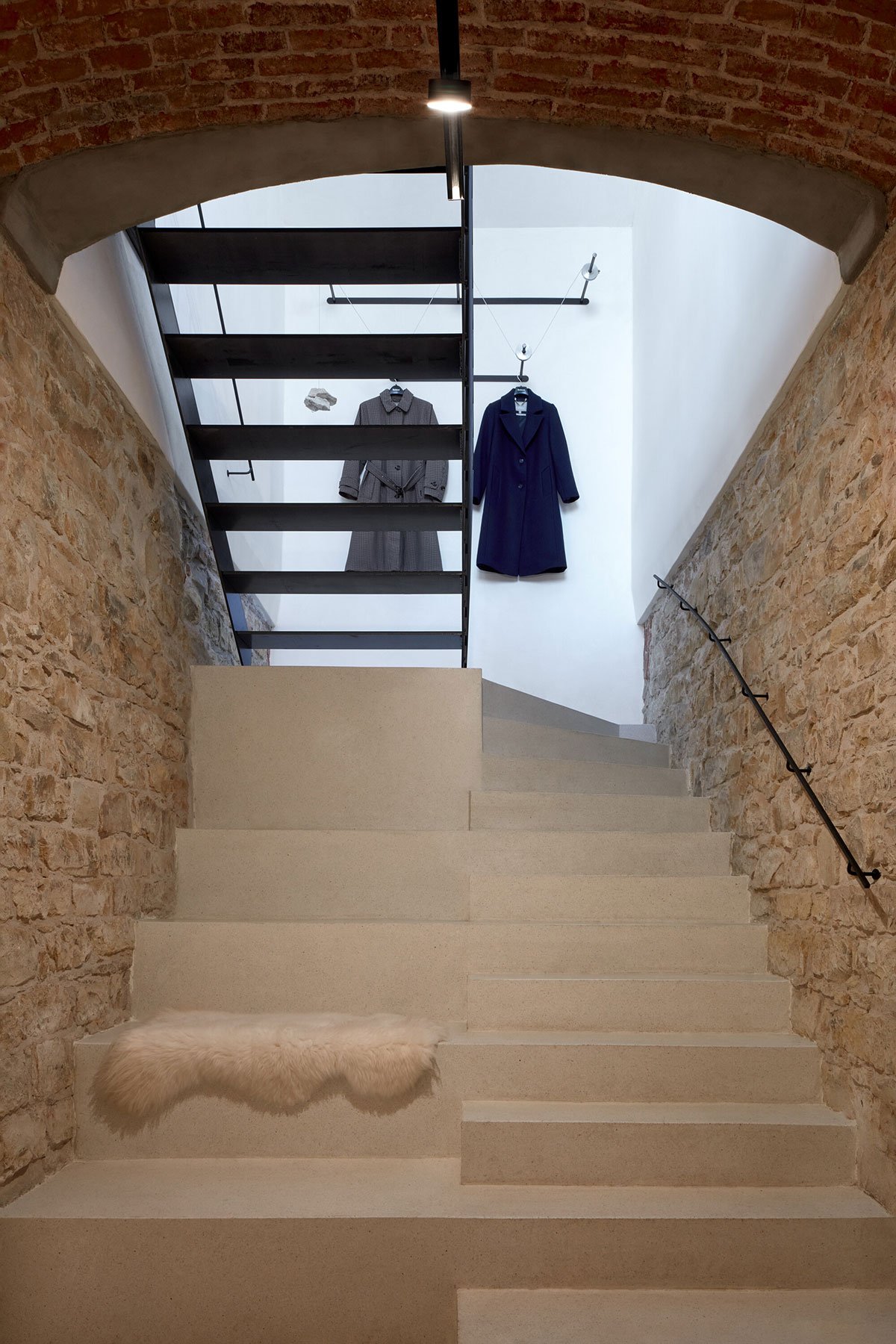 The proposal centered around transforming the original basement into a commercial area. The grand vaulted rooms were left unplastered, allowing the darker surfaces of the brick vaults and stone walls to be complemented by a new light-colored polished concrete floor, separated from the old walls by a distinctive joint. On the ground floor, only minor cosmetic updates were made, with the most significant change being the installation of a new terrazzo staircase connecting the basement to the ground level. Careful attention was given to the placement of the staircase, ensuring it naturally linked to the entrance, striking a balance between economic practicality and minimal structural intervention. The material palette of the spaces is moderated to be as versatile and timeless as possible.