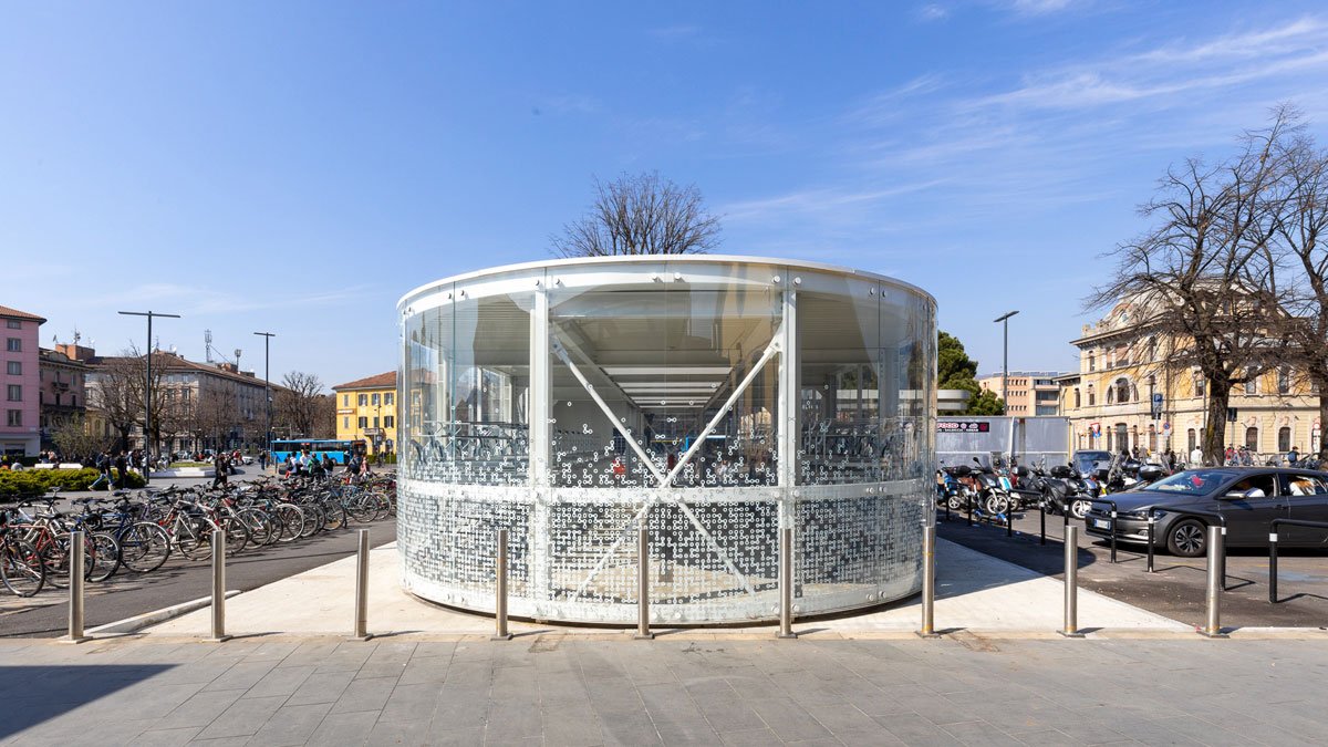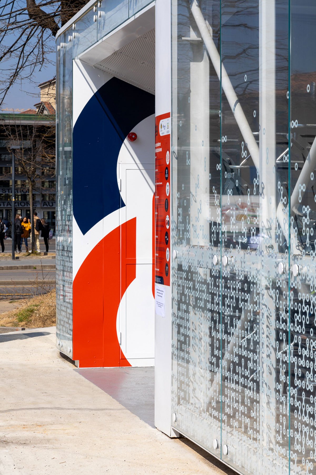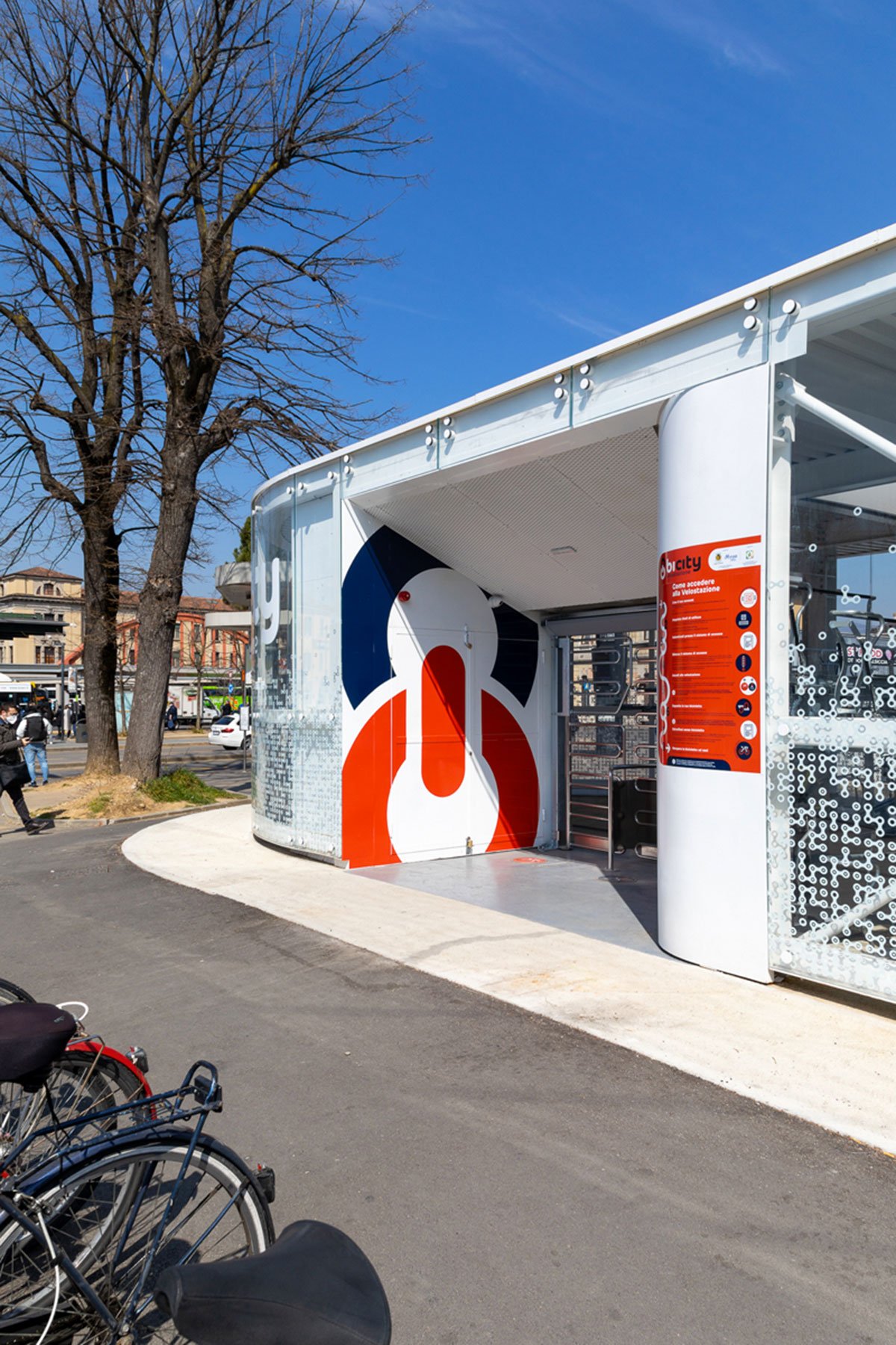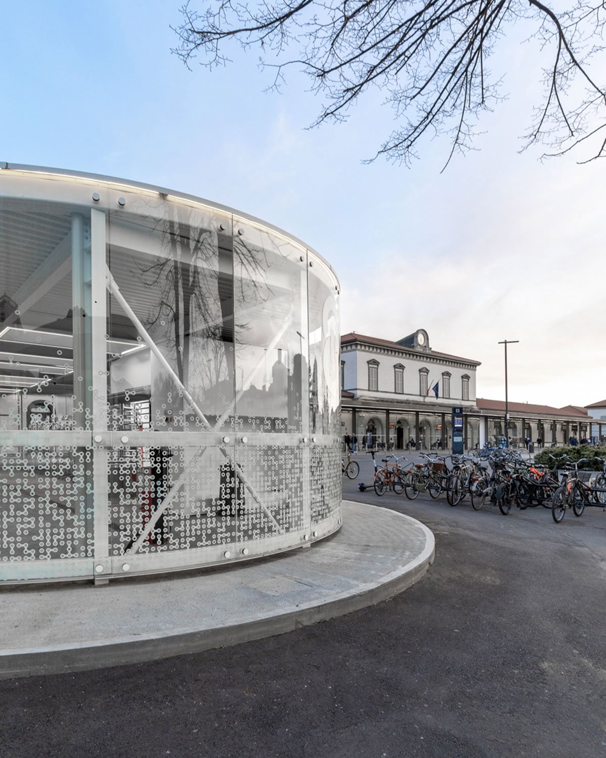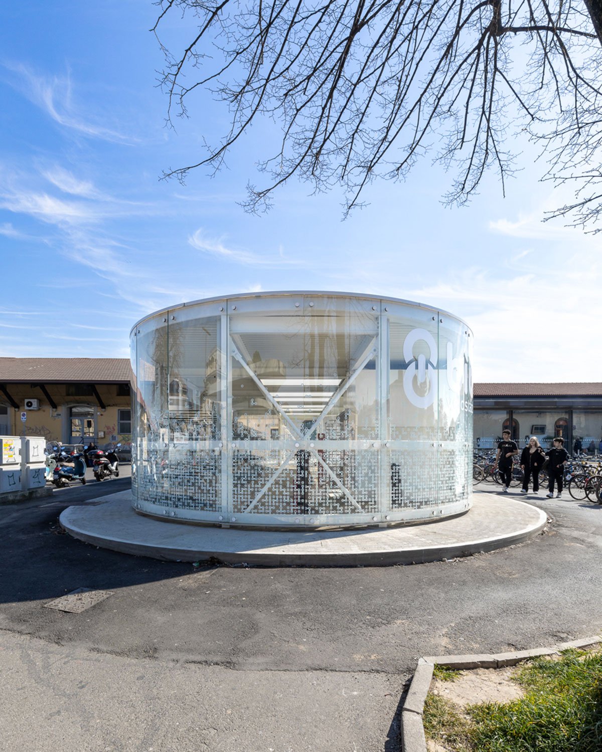 The low-tech infrastructure, completely reversible, where transparency becomes an expression of safety and accessibility, stands on the east side of Piazzale Marconi, recently requalified in a major upgrade by Portuguese architect Ines Lobo. The objective of the project was to insert a new element, integrated into the contemporary development of the square, providing a centre of interchange between modes of transport: public transport, cycling and walking.