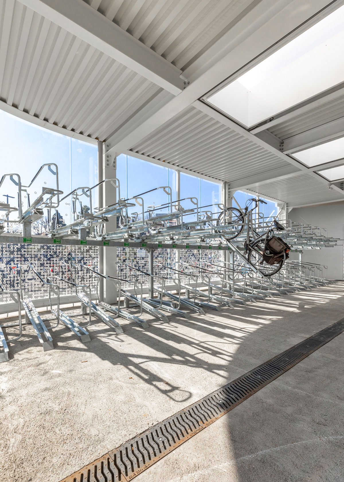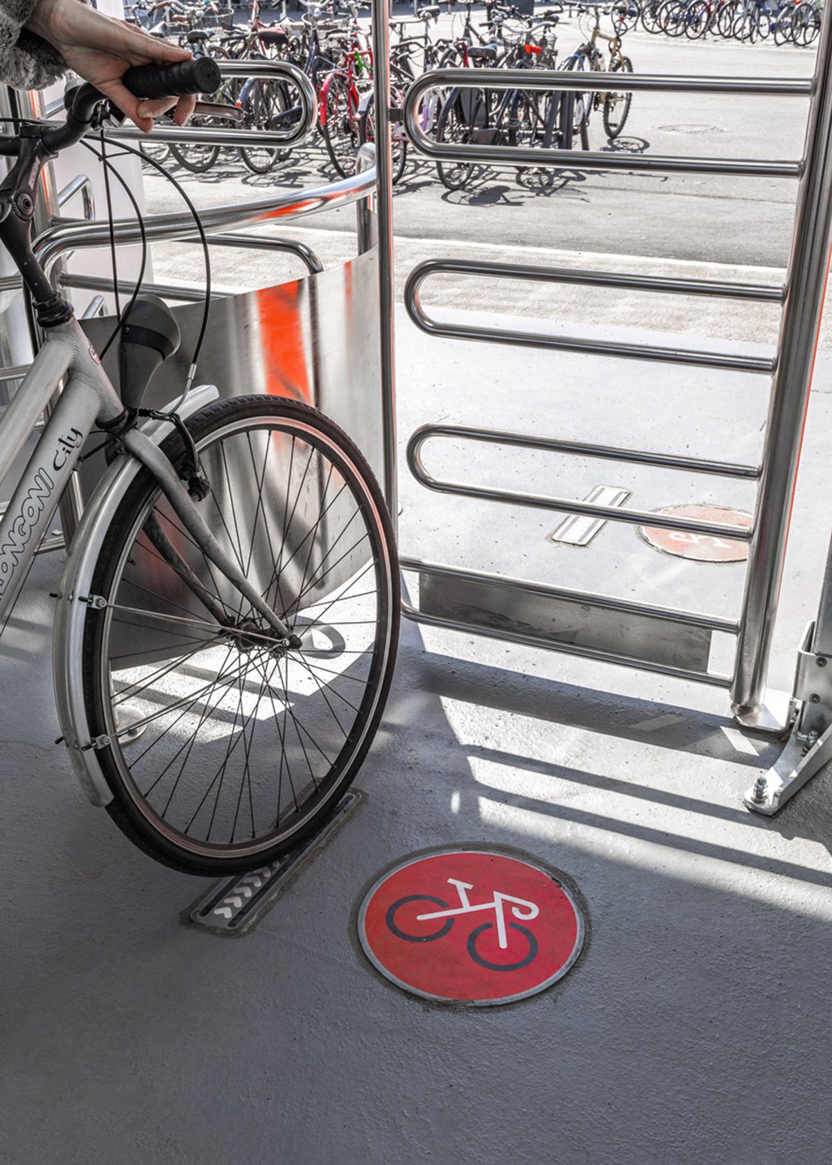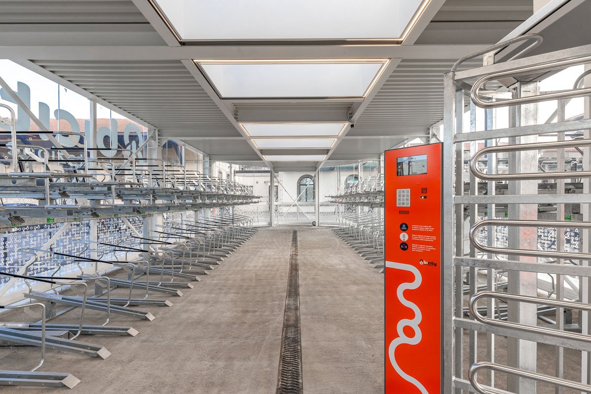 Particular attention was paid to the management of the bicycle station. The service to cyclists is fully automated using access badges and hydraulic lifting systems to avail of the two levels of bicycle racks.