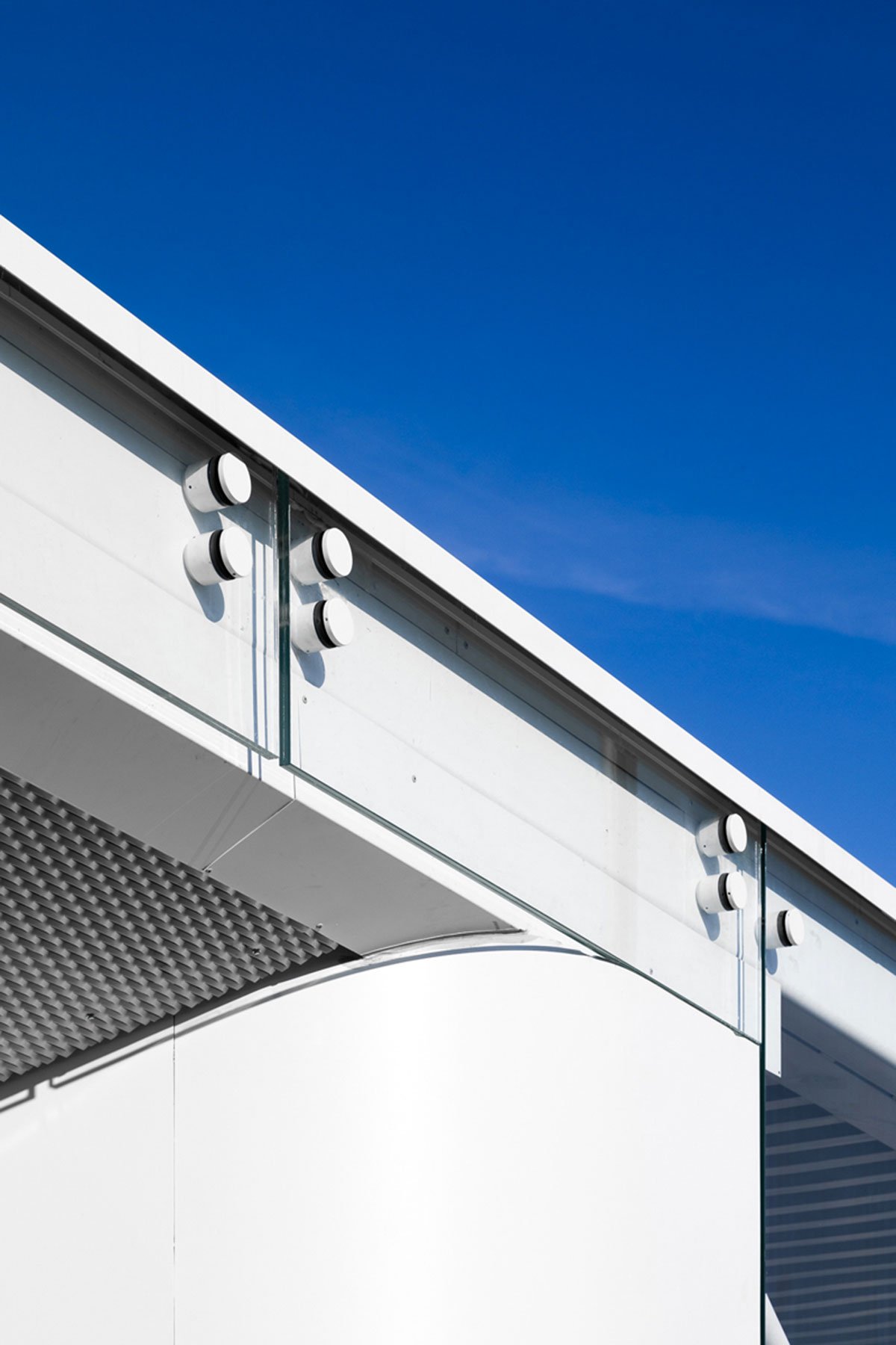 The compact design of the construction develops through a fabricated metal structure. The glass perimeter façades run without interruption, breaking only at the intersection at the front entrance of the building. The main distinctive feature of the elevations is the absence of containment frames for the glass surfaces, where single-point fixings are used instead. The transparent shell offers a diffused natural light to the station, which, at night, takes on a centralising role, lightening up quite like a lantern.