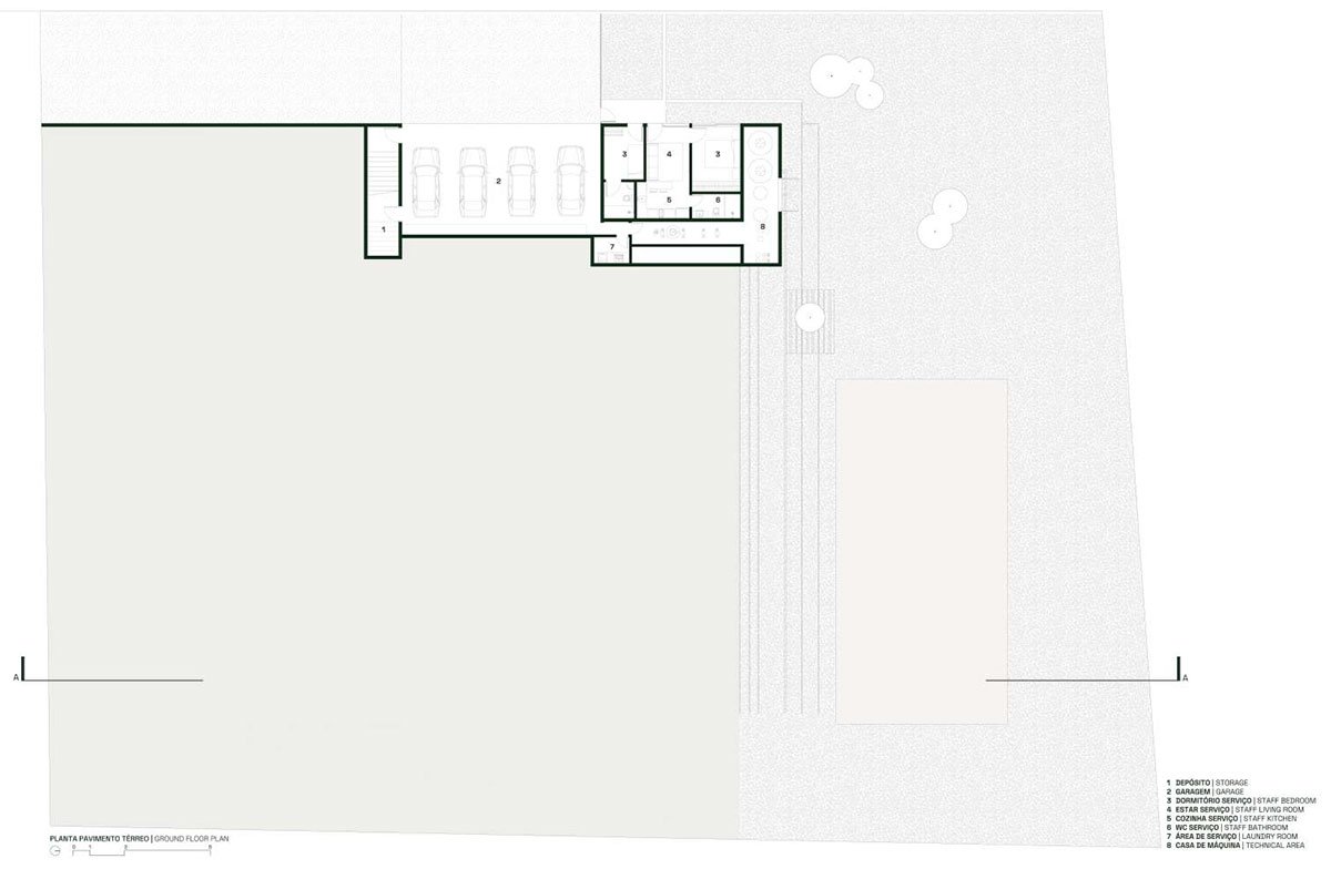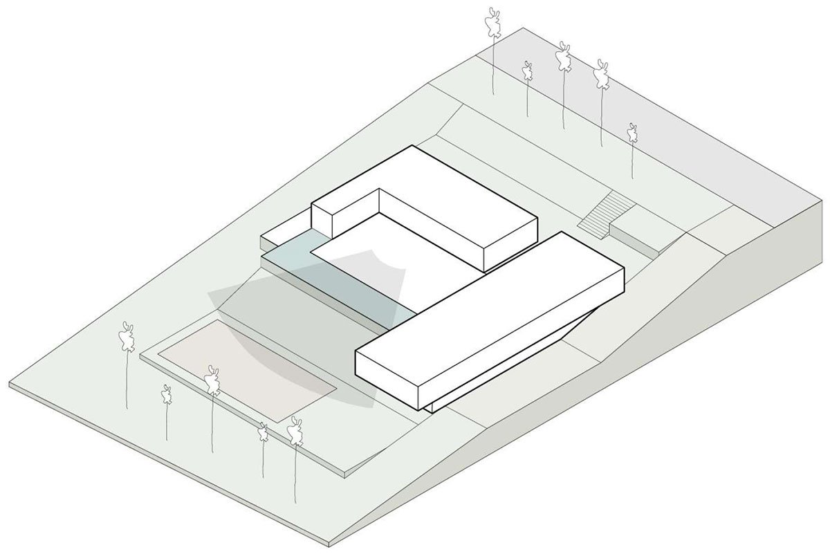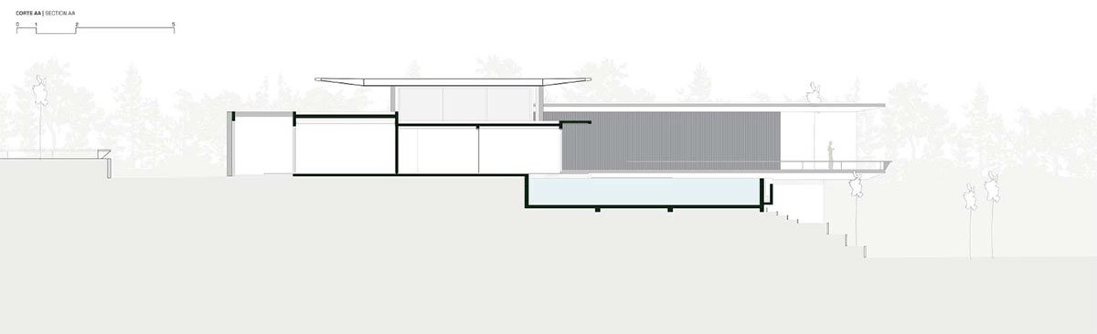 Located slightly below street level, the house has a single access point on a continuous plateau, where a void between the social and intimate blocks delineates the main entrance. A spacious central void, covered by a floating metal structure, connects and unifies the residence.