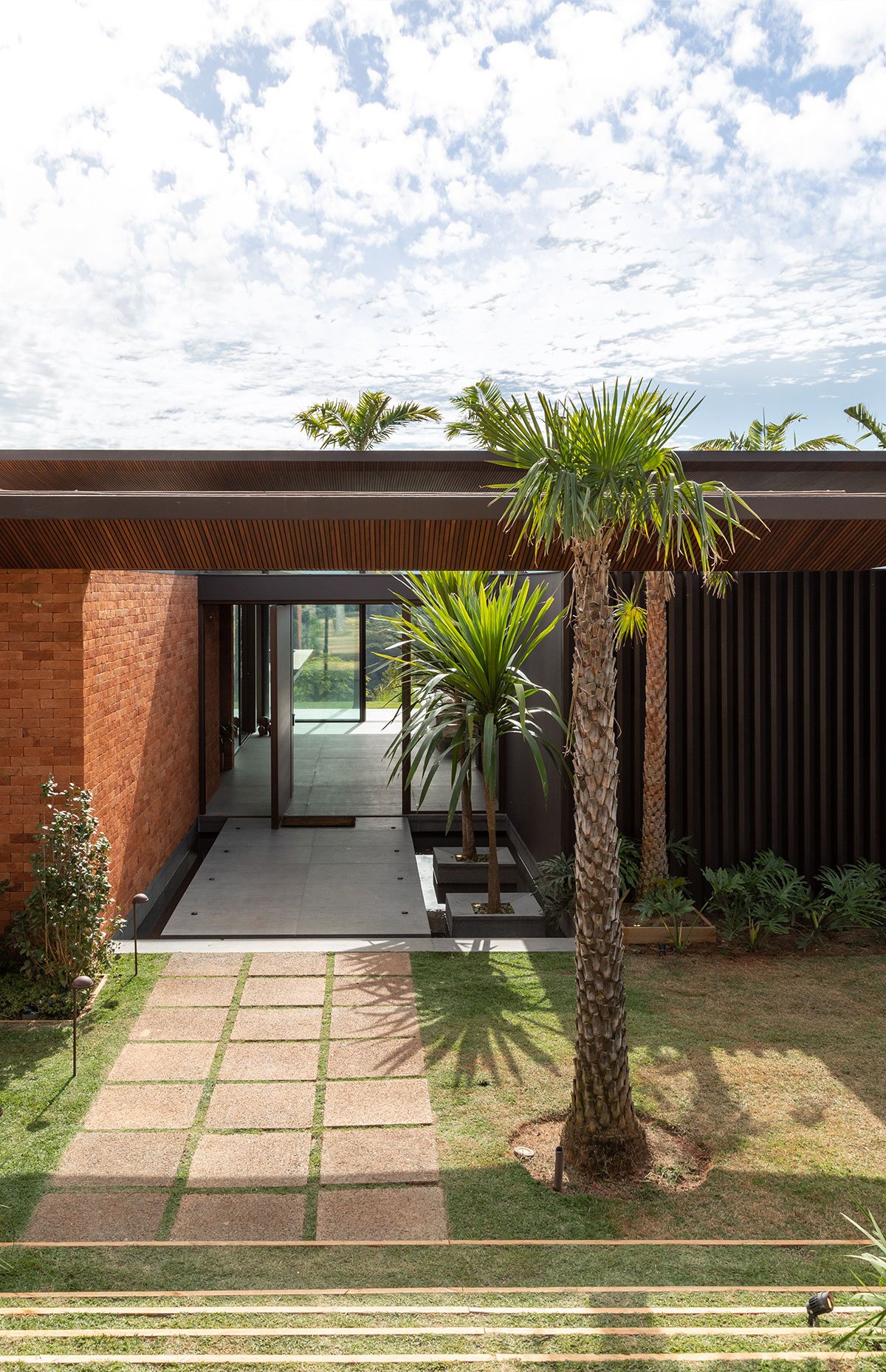 The composition of both social and intimate volumes under the expansive metal roof emphasizes the horizontality of the project. Natural materials such as bricks, stone, and warm-toned wood complement aluminum panels, balancing aesthetics and coziness.