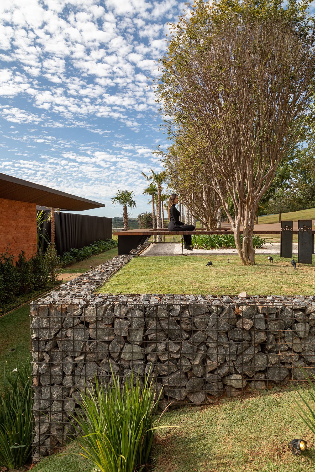 Excerpt: GM House, designed by Padovani Arquitetos, is situated on a unique plot of land with an intriguing topography. The house blends with the surroundings by resting horizontally on the terrain’s contours. Featuring a single access point on a continuous plateau, a void between social and intimate blocks serves as its main entrance. A central void, covered by a floating metal structure, unifies the residence.