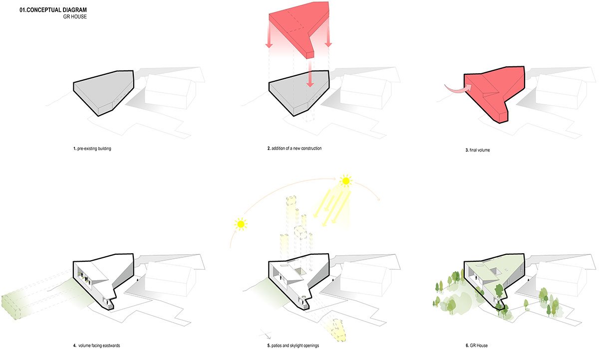 Thus, arose the need for introversion and hermeticism, making the constructed volume emerge as an inert, mimicking nature and assuming its exception in the eastern wing, whose volumetric deformation declares and accentuates its willing openness and submission to the views beyond.