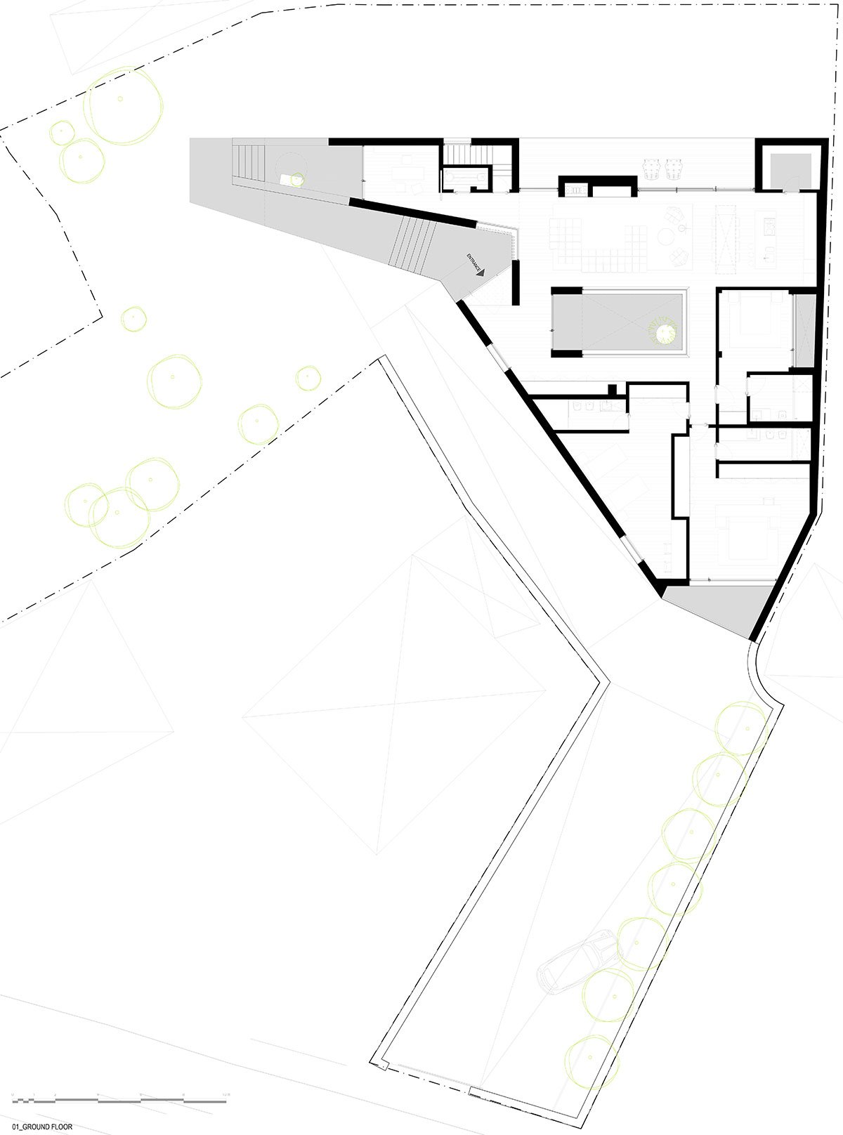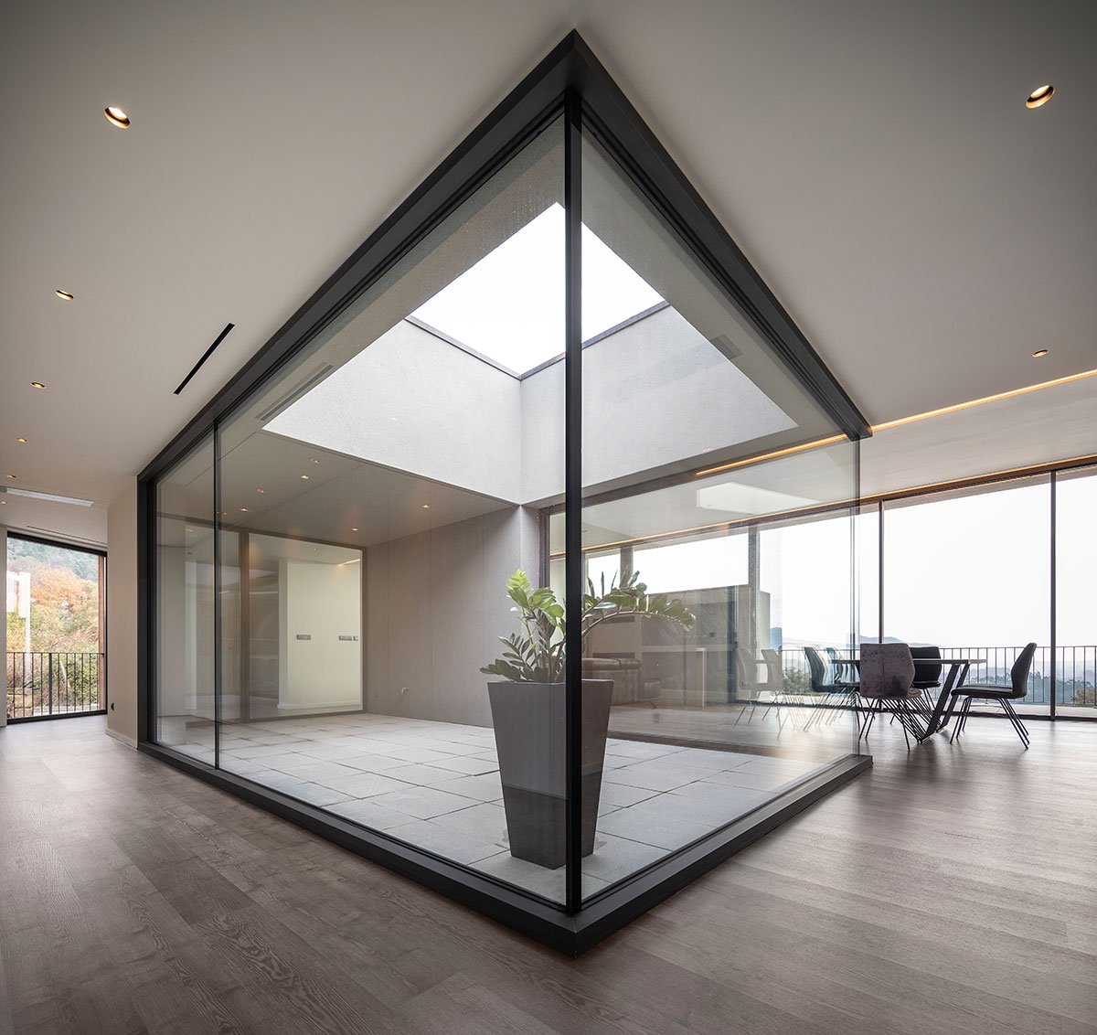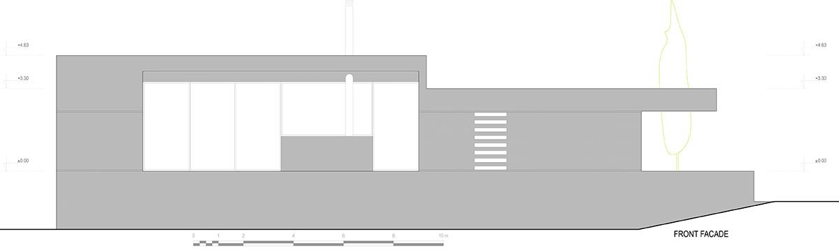 A clear outside/indoor duality stresses the idea of the villa’s lack of interest in its relations with the immediate environment, without this hindering the existential dynamics of its interior. Programmatically, the reception areas of the house face eastwards (valley) and the intimate zones westwards (road), with these spaces being separated by a large indoor patio around which it is possible to walk, creating enriched spatial and visual dynamics.