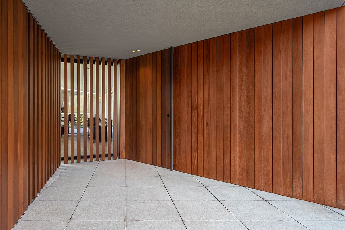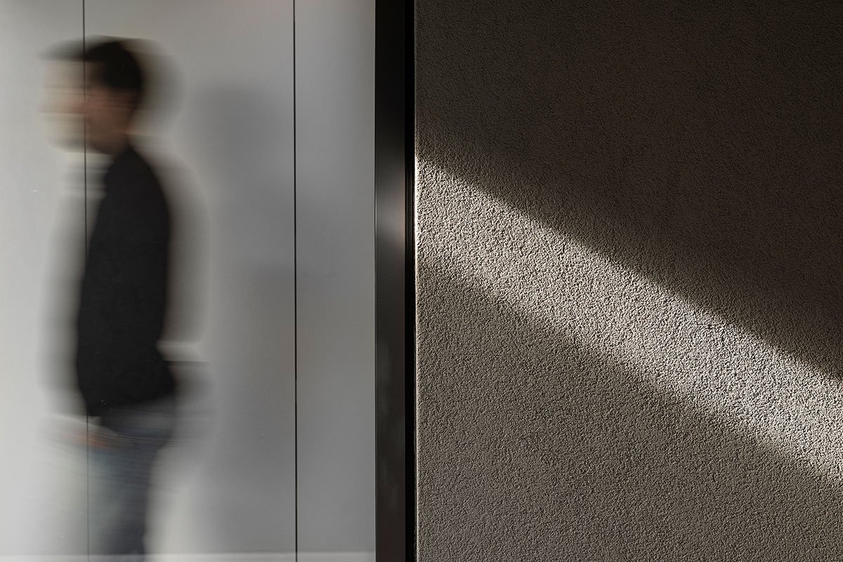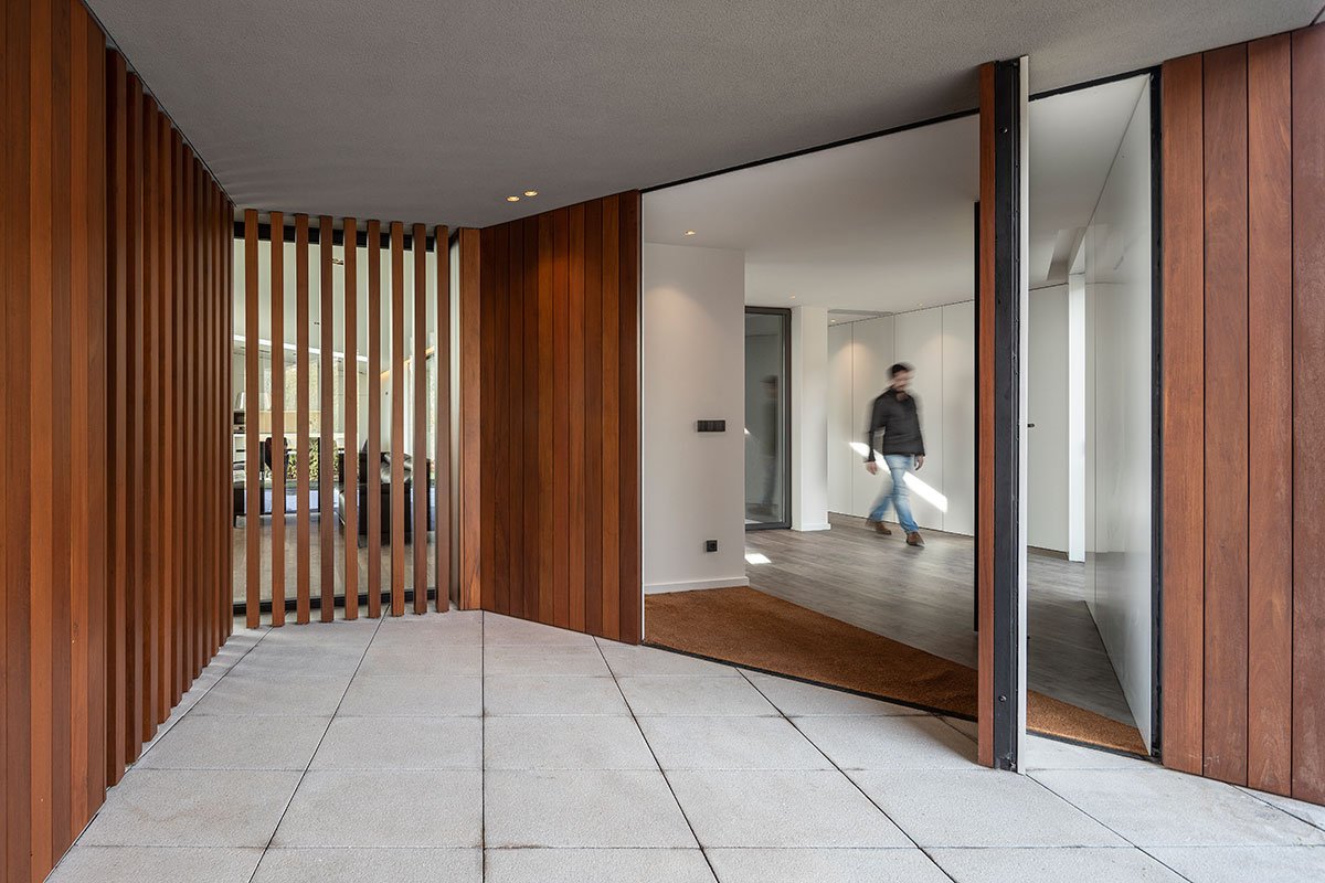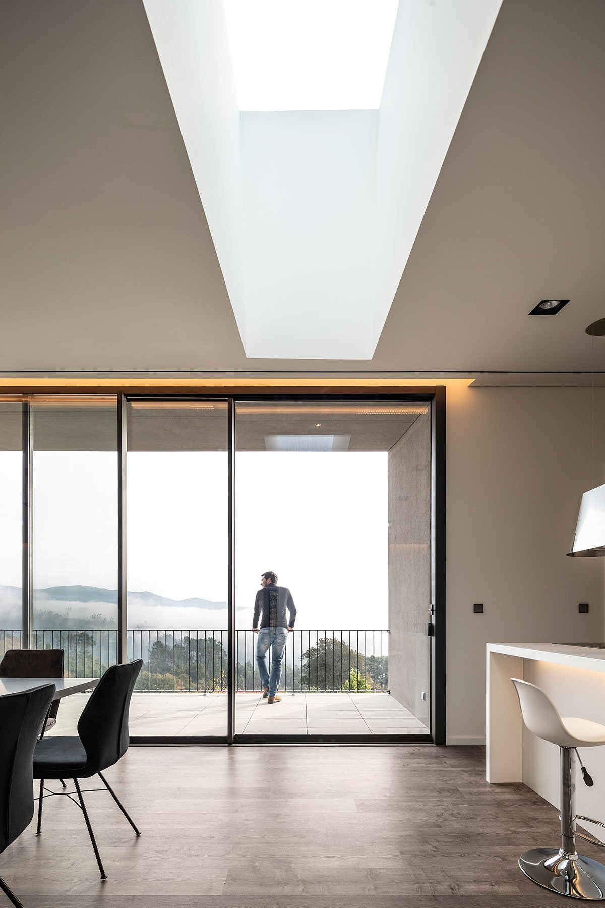 Walking along the successive ramps encountered since the entrance into this parcel of land, we are taken to a moment of transition between the interior and exterior, which is announced by its coating in roble wood, an exceptional superlative and invitation to enter through the oversized door that separates the hermetic and mysterious exterior from its pure and warm interior, with its spaces generously illuminated with zenithal light pointed towards the valley, where the mist denounces the crossing of a river.