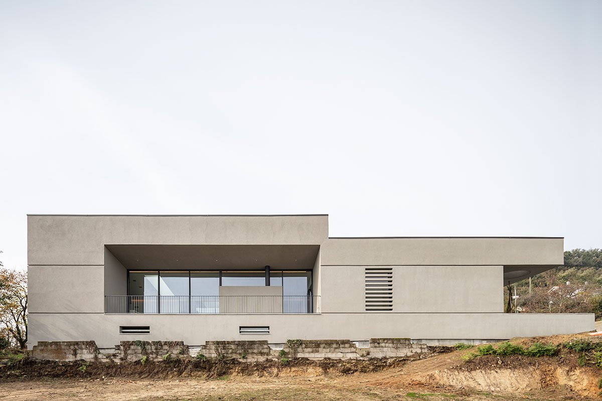 Excerpt: GR House, designed by Paulo Martins Arquitectura, is an inert volume that mimics nature, with its eastern wing’s volumetric deformation indicating its openness and submission to the surrounding views. The irregular, earthen form of this residence features patios and skylights visible only from higher up with openings that create a transition between interior and exterior.