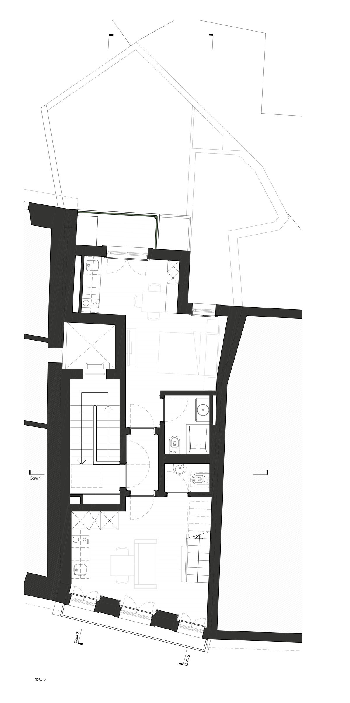 For the housing concept, it was designed seven small T0 apartments for a short stay functional and suitable for this purpose.