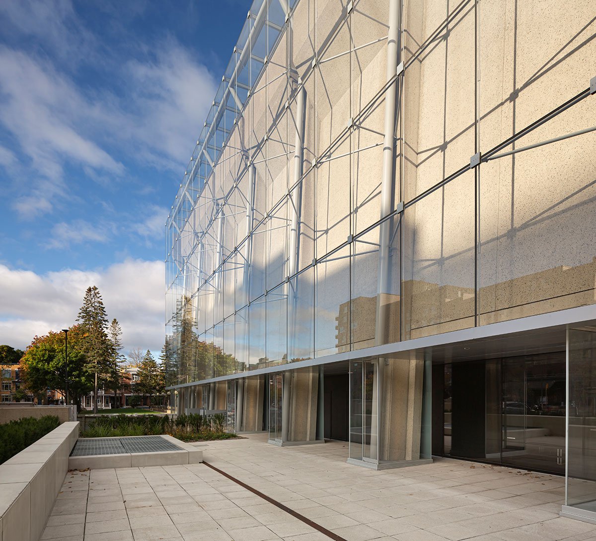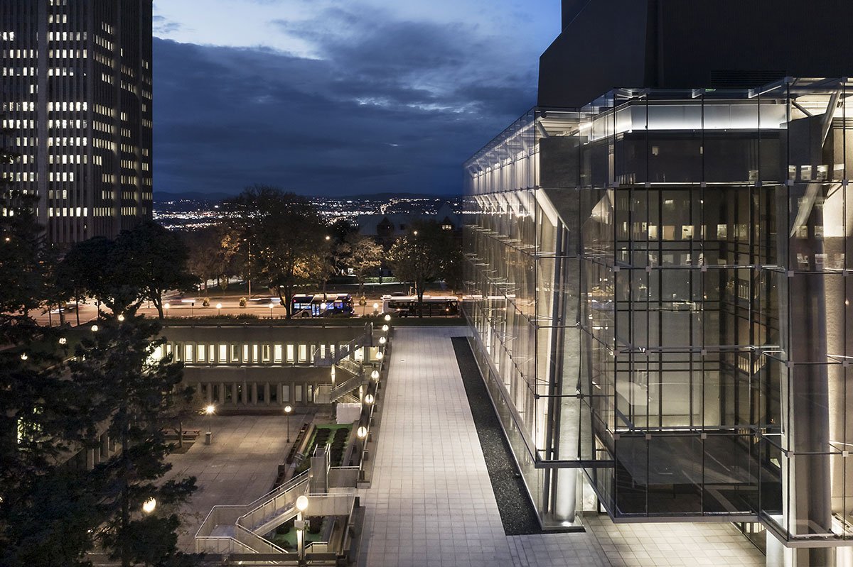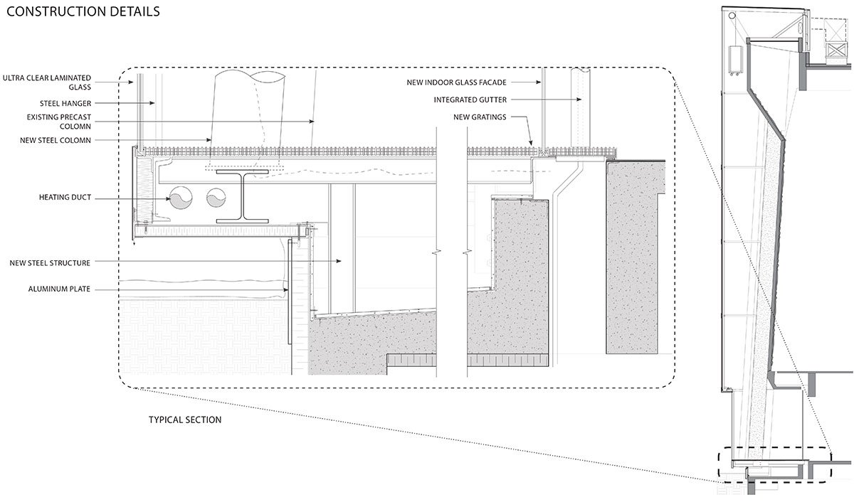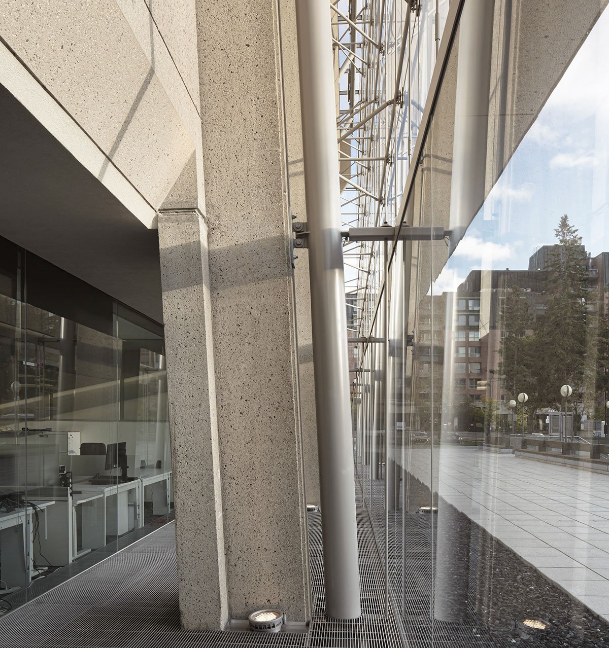 The glass casing was carefully designed in continuity with the structure developed by Victor Prus, the original architect, and the mural work of Jordi Bonet, enshrined by Prus’ protective outer shell. Discrete and almost immaterial at times, it reflects its surroundings and becomes the main interface with the city, adding a theatrical act in the discovery of this significant Quebecois work.