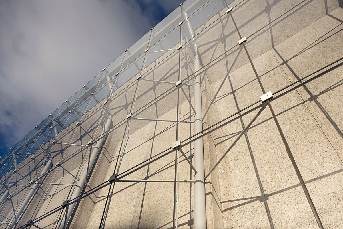 [Text as submitted by architect] The new envelope is a delicate response to a complex problem. In developing corrective measures for the building’s many weaknesses, the transdisciplinary team produced a sustainable, innovative solution: adding a transparent, glass curtain wall to the concrete structure.