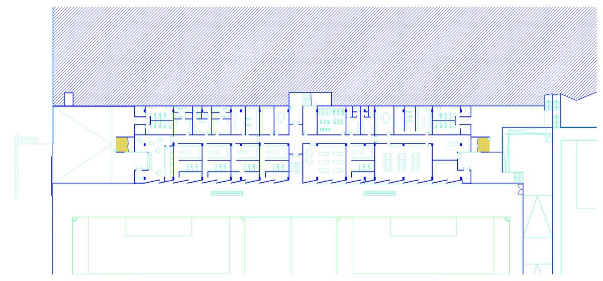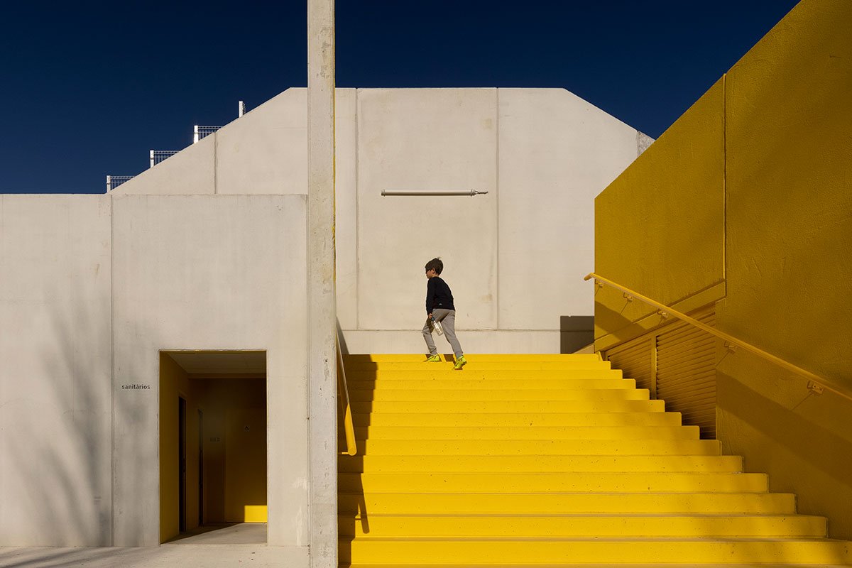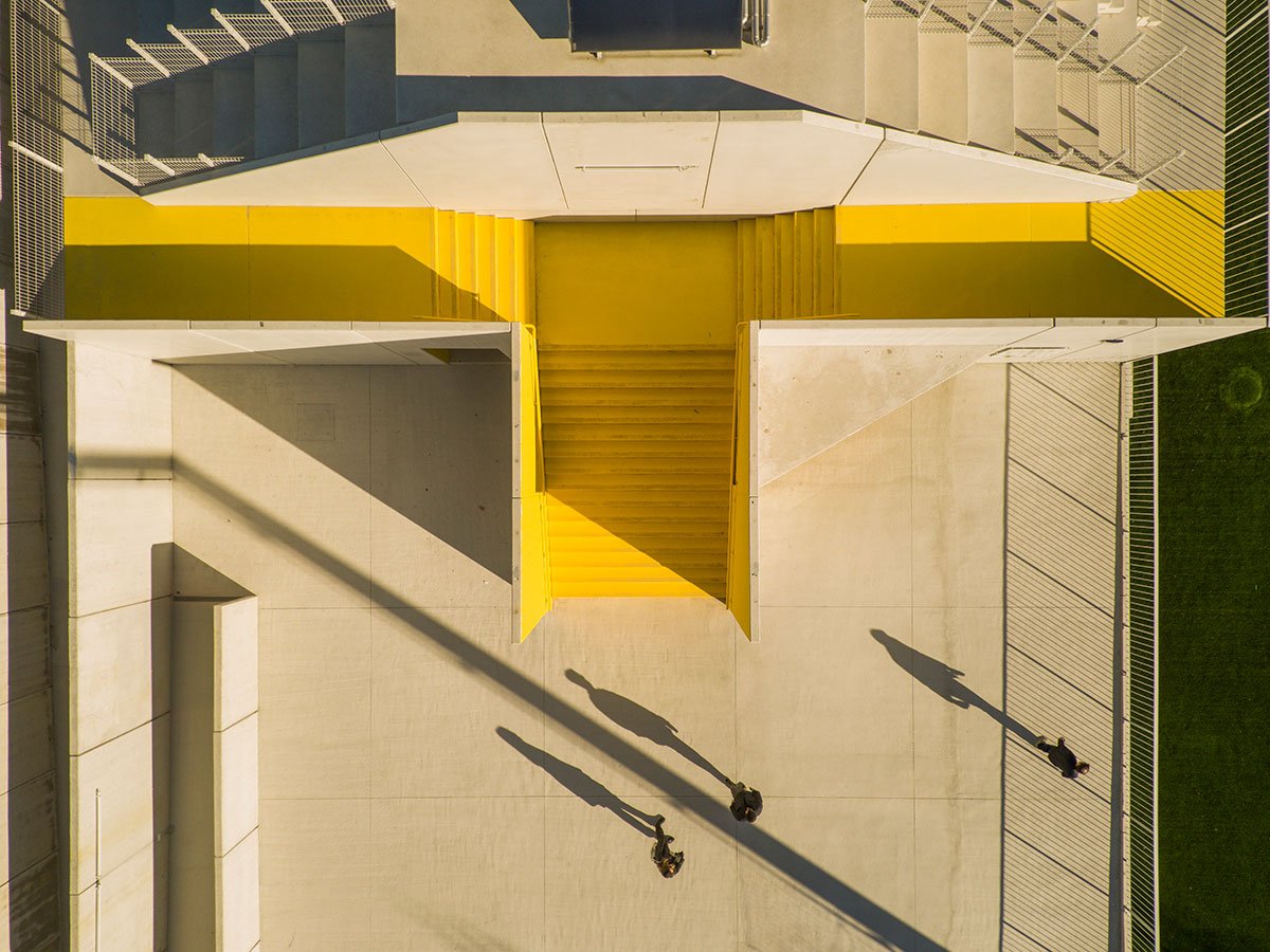 Under the pretext of having a building to house the technical functions that support the sportive activity we introduced a social layer on top of the building, by placing the public stand that faces both pitches on opposite sides.