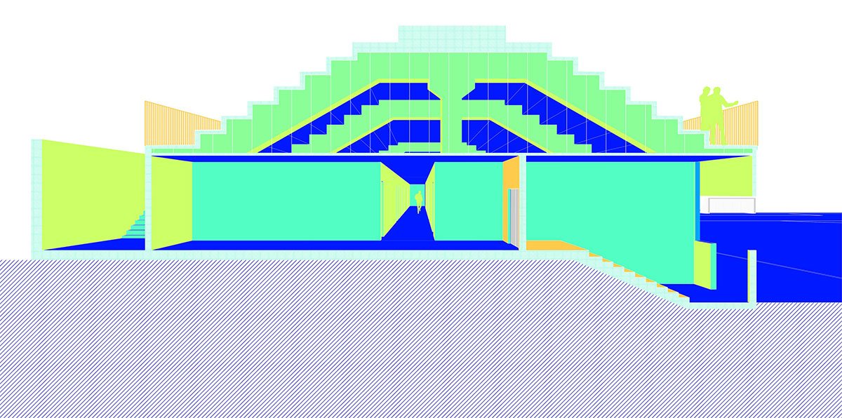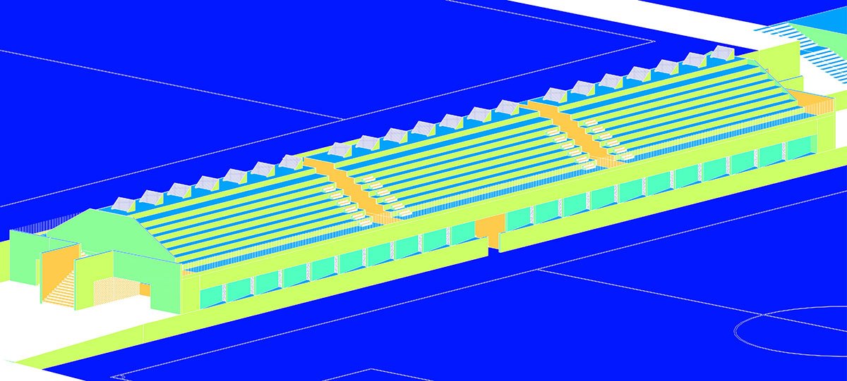 All functions were condensed into a single building, the public stands facing the playing pitches to each side and the remaining programmatic functions housed underneath. The option of joining all functions and the two public grandstands in a single unit optimizes public circulations, reduces building material, building costs and construction time.