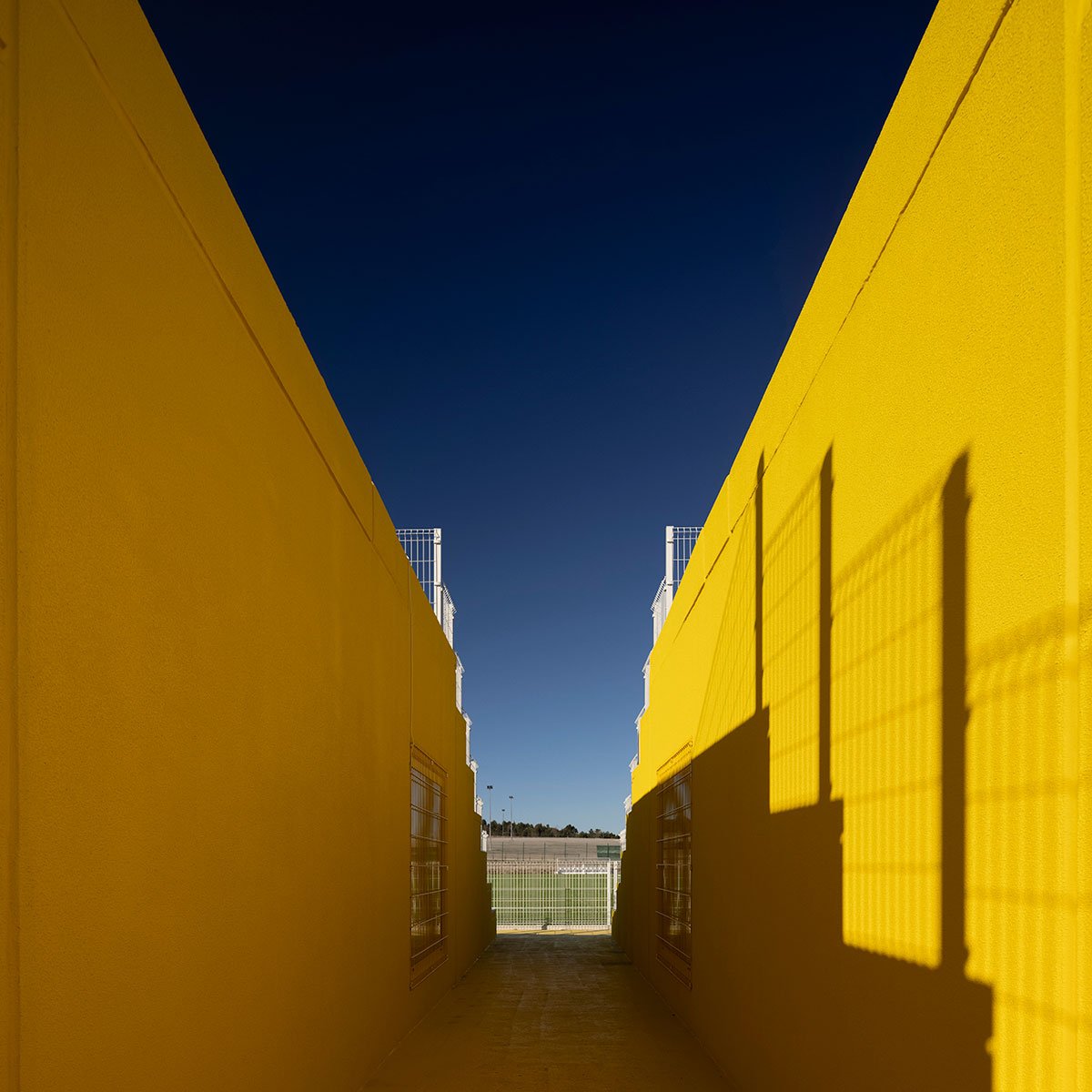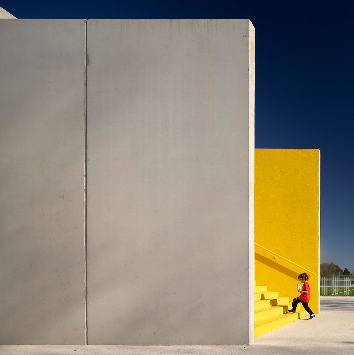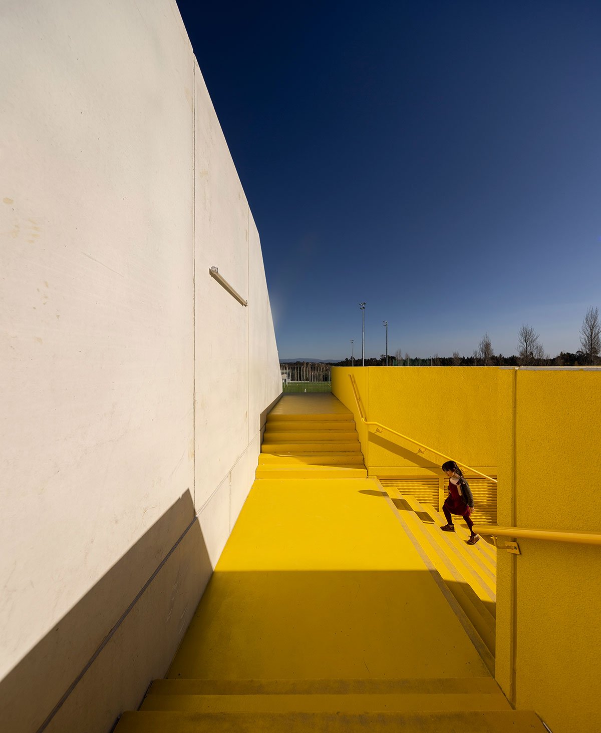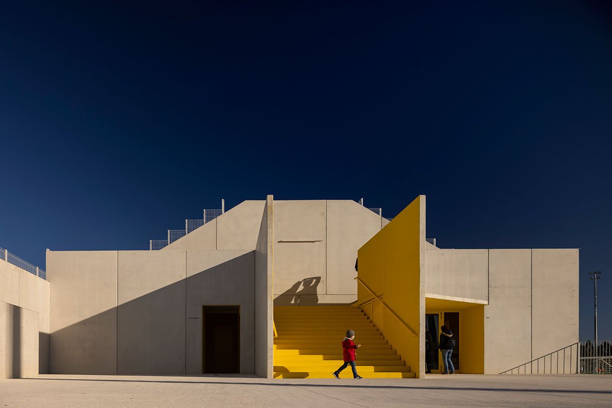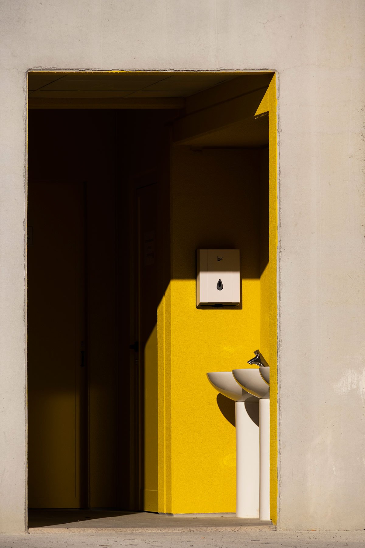 The general image of the building and its constructive system are strongly intertwined. The materiality of the building, specifically the use of concrete in its natural color, is simultaneously an aesthetic choice as well as a cost-effective one, avoiding the need for additional finishings. Colour is used sparingly but intentionally to create a strong effect in the circulation areas and to symbolically identify all public access areas.