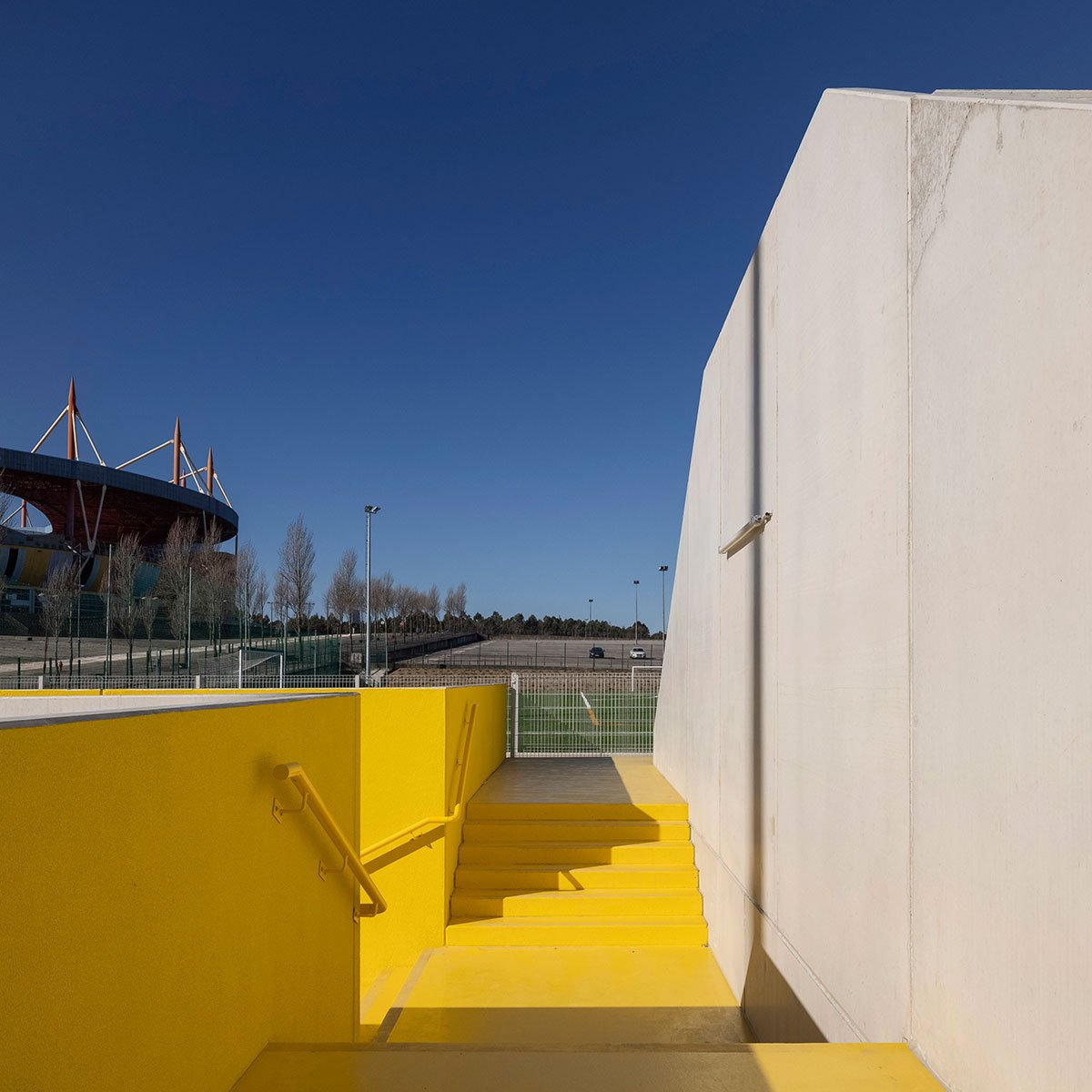 The simplicity of the design and the sobriety of its apparent materials aim for a more reduced presence of the building in the surroundings, offering a certain neutrality to the general intervention and not compete with the stronger presence of the Stadium nearby.