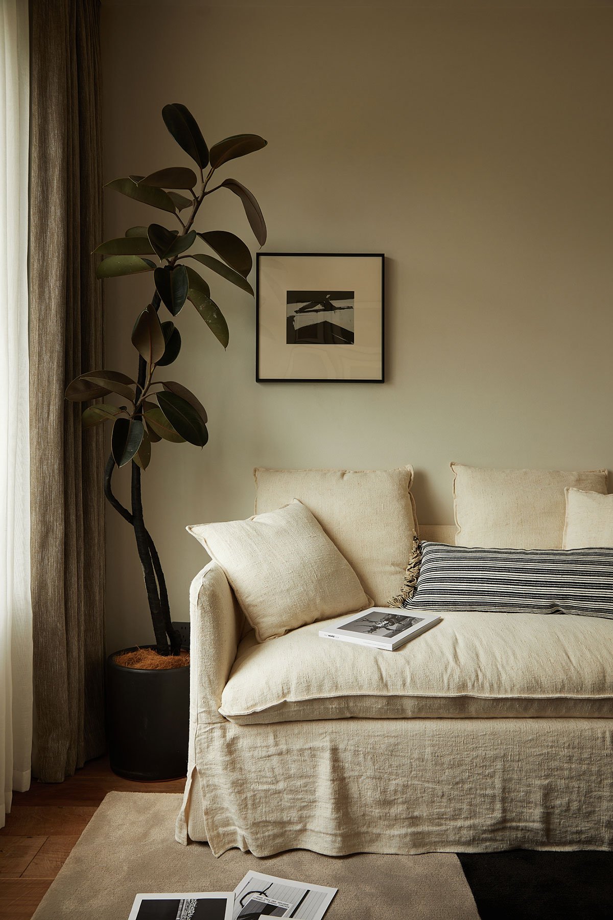 01 Art & Relaxation: Light traces time and adds depth to space. Lush elephant ears, casually arranged artworks, and the relaxed, open atmosphere—all of these embody the spirit of freedom in this home. Sunlight dances across the interior, casting playful shadows and soft lines.