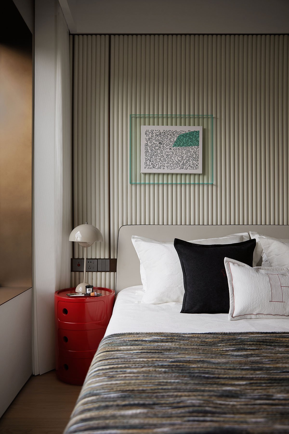 Rich, bold colors and geometric patterns also feature prominently in the master bedroom. The combination of red, green, black, yellow, and blue adds warmth and passion, sparking the imagination without overwhelming the senses. The children’s room is a colorful space where creativity comes alive—art here is something to look at, create, and play with.