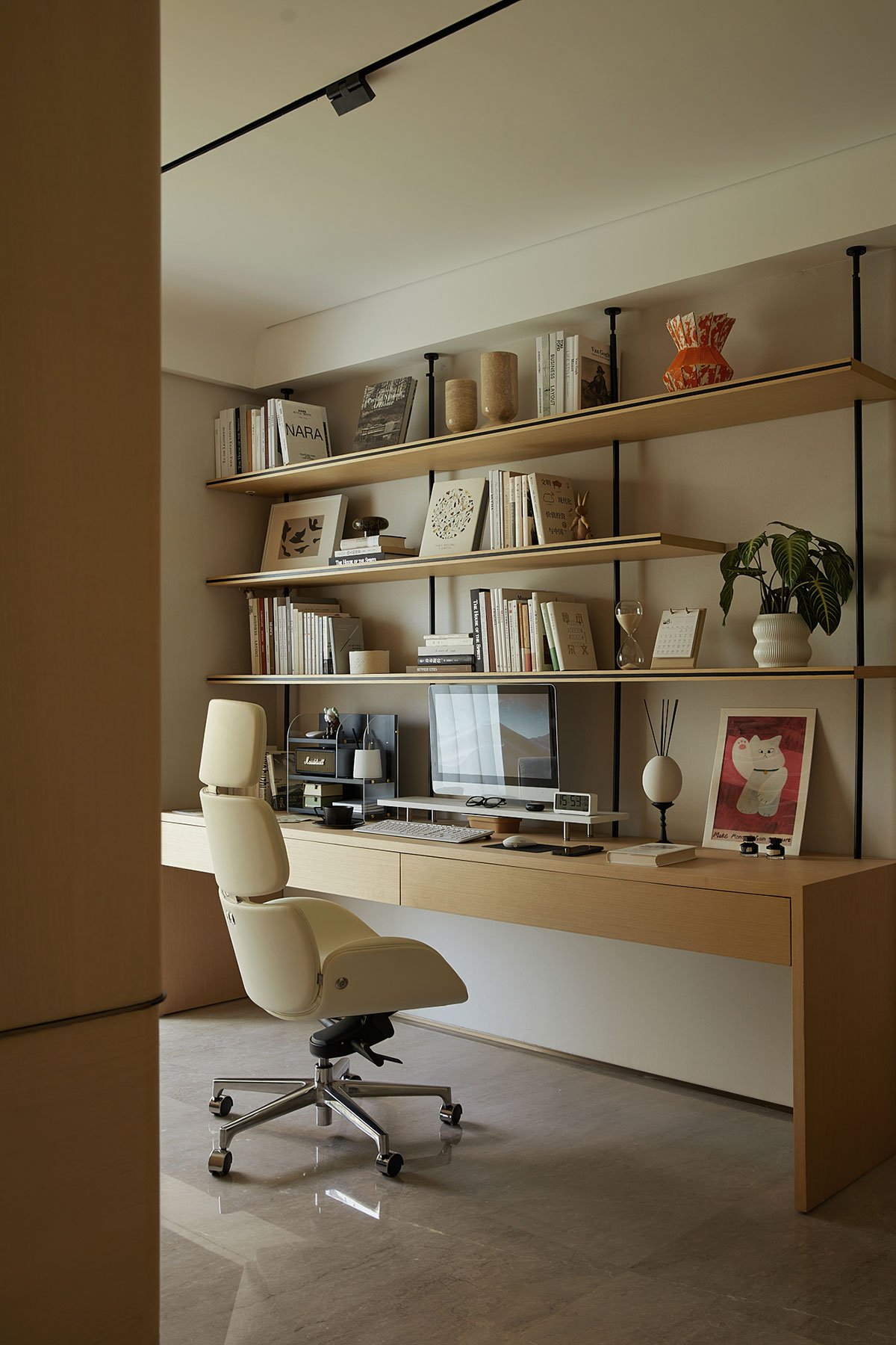 The balcony, adorned with greenery, is a quiet retreat. Sip a cup of tea and enjoy the peaceful ambiance as the scent of the tea fills the space, bringing a moment of serenity. The study continues the theme of tranquility, with an open bookshelf energizing the room while subtly displaying the owner’s art collection.