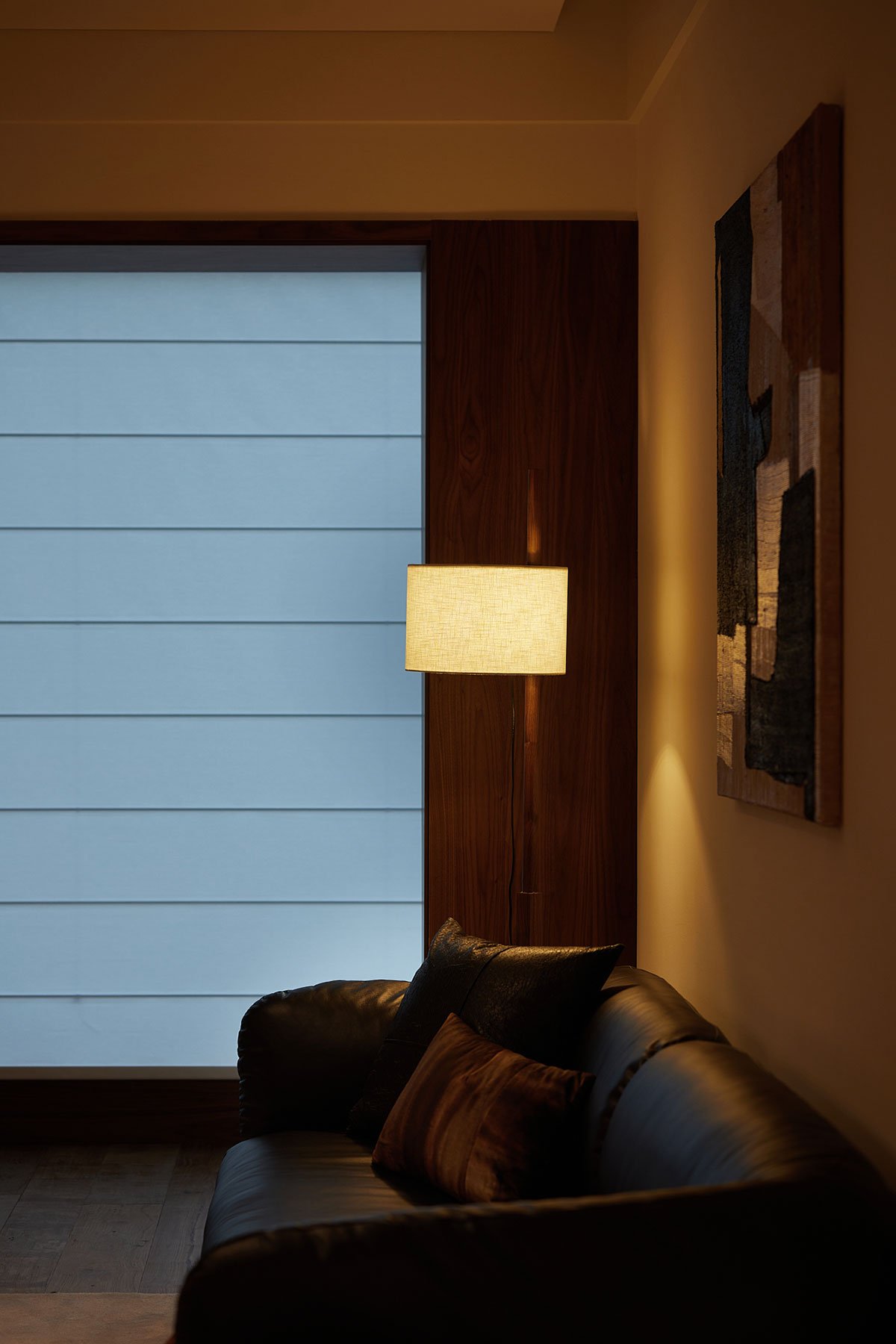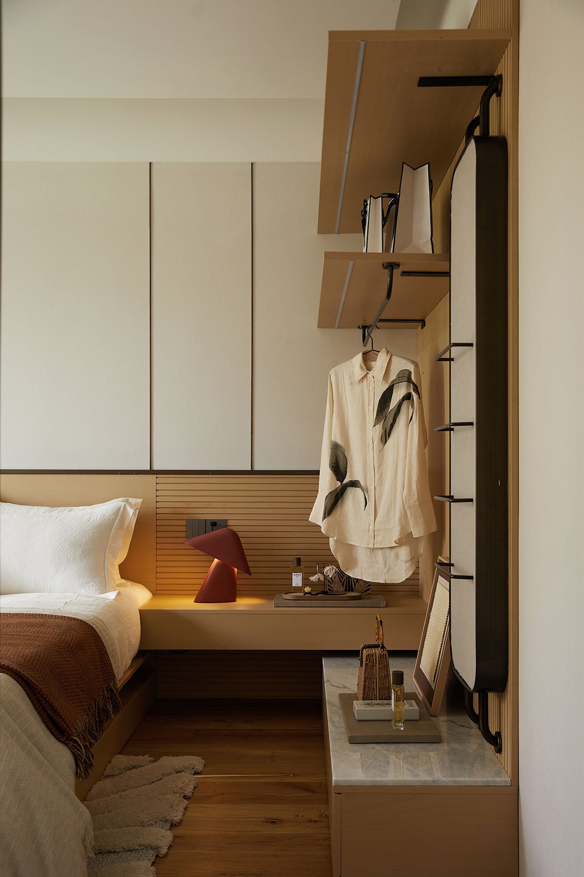 The bedroom, with its use of soft cotton-linen, velvet, and washi paper, creates a relaxed, vacation-like atmosphere—ideal for unwinding and reconnecting with nature. The multifunctional room serves multiple purposes—a guest room, a movie room, a space for hobbies, or a retreat. The minimalist approach leaves room for creativity and the simple enjoyment of time spent alone.