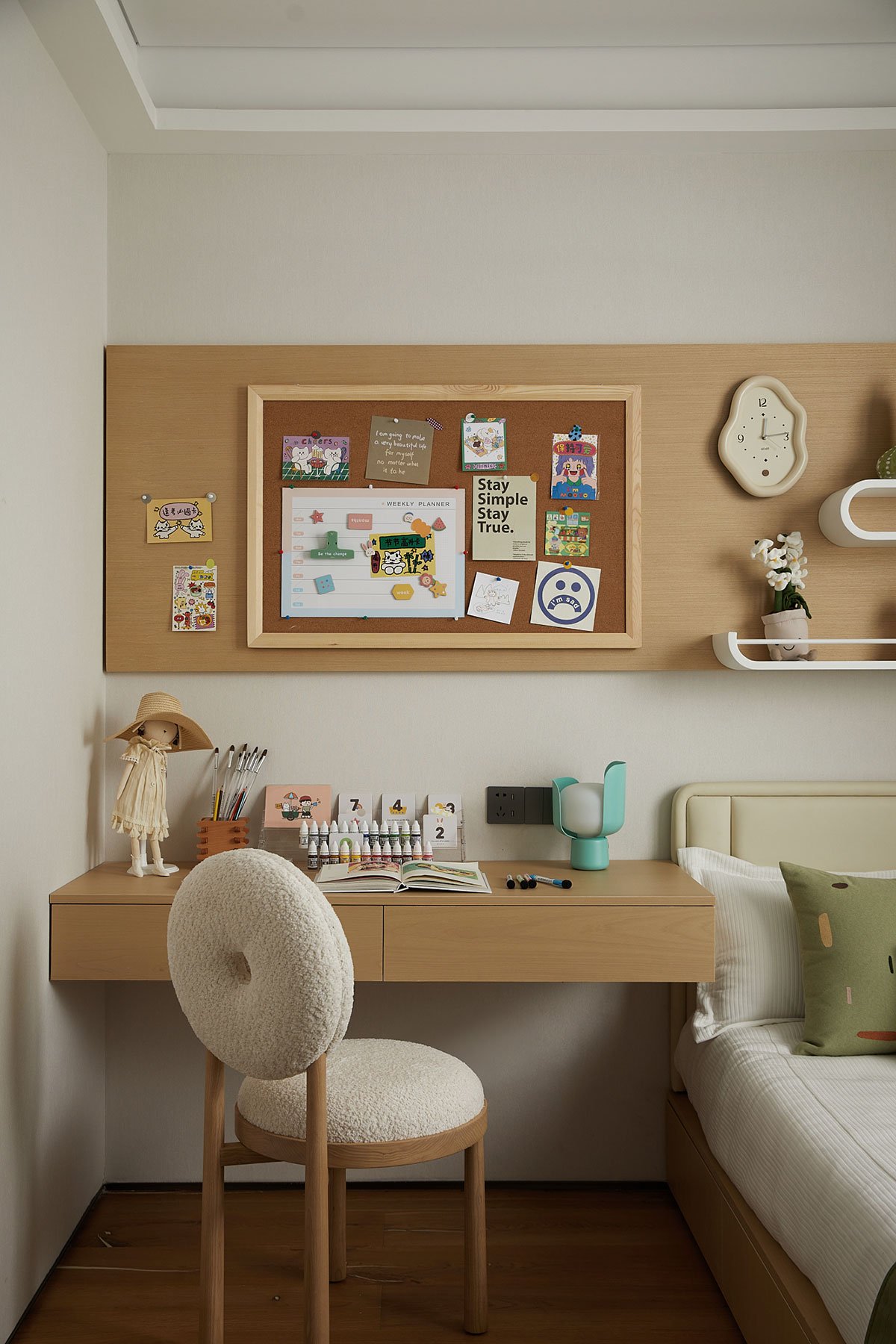 This sense of calm carries into the master bedroom, where soft bedding and warm lighting create a restful environment—perfect for both relaxation and restful sleep. The children’s room embraces a playful jungle theme, with green accents and adorable animal characters creating a fun and joyful space for young imaginations.