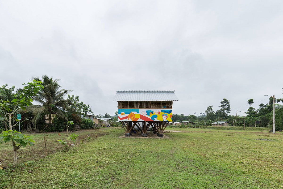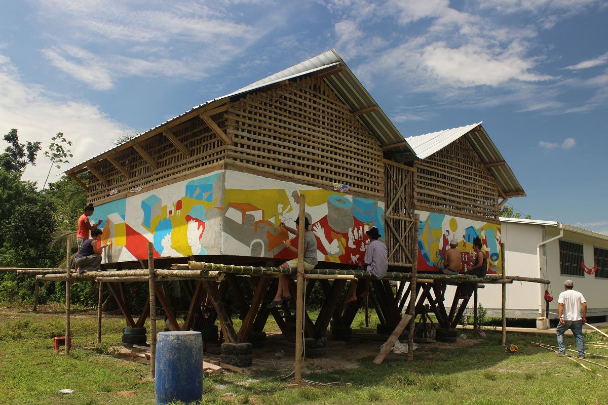 The project rapidly became iconic for the community and with their own means they decided to give the sugar cane walls a new cement covering. During this improvement frenzy they asked us in which color they ought to paint it. David Sur, an urban artist and graphic designer, was still on the site as part of the Taller General team that was giving technical assistance after the earthquake.