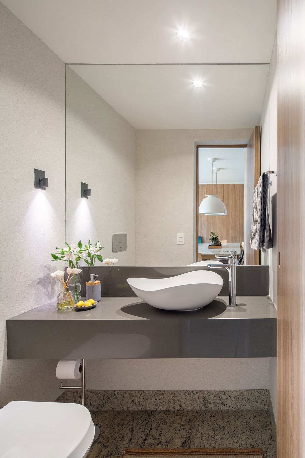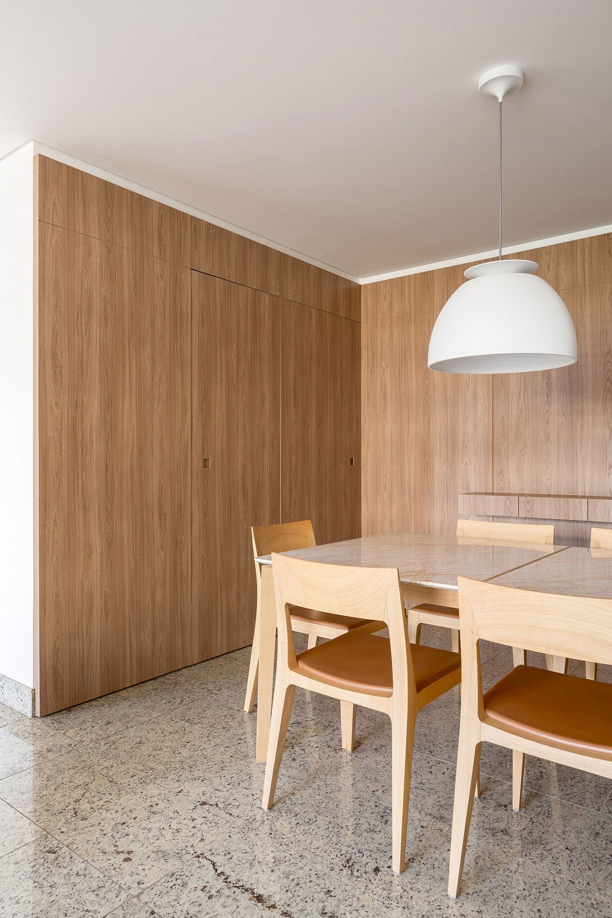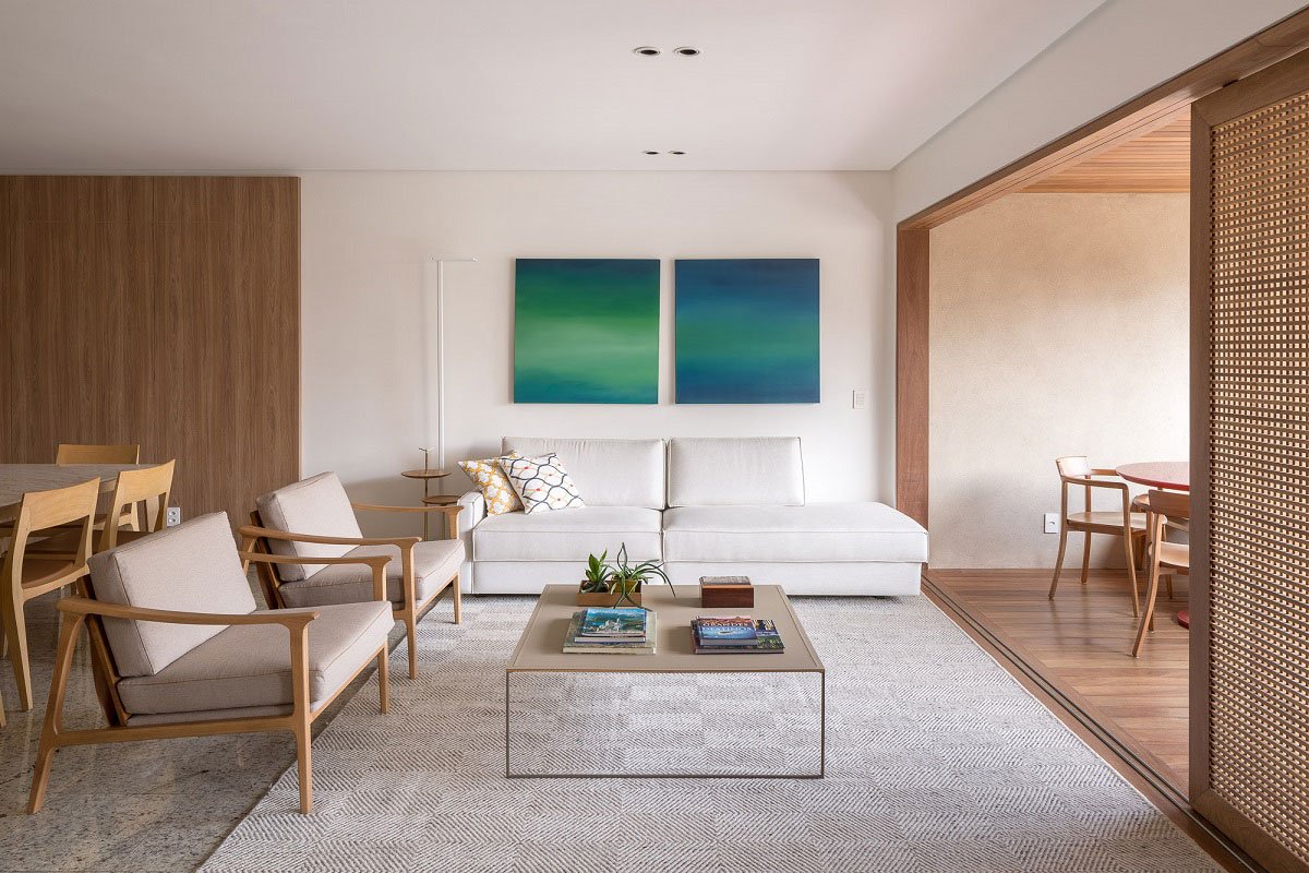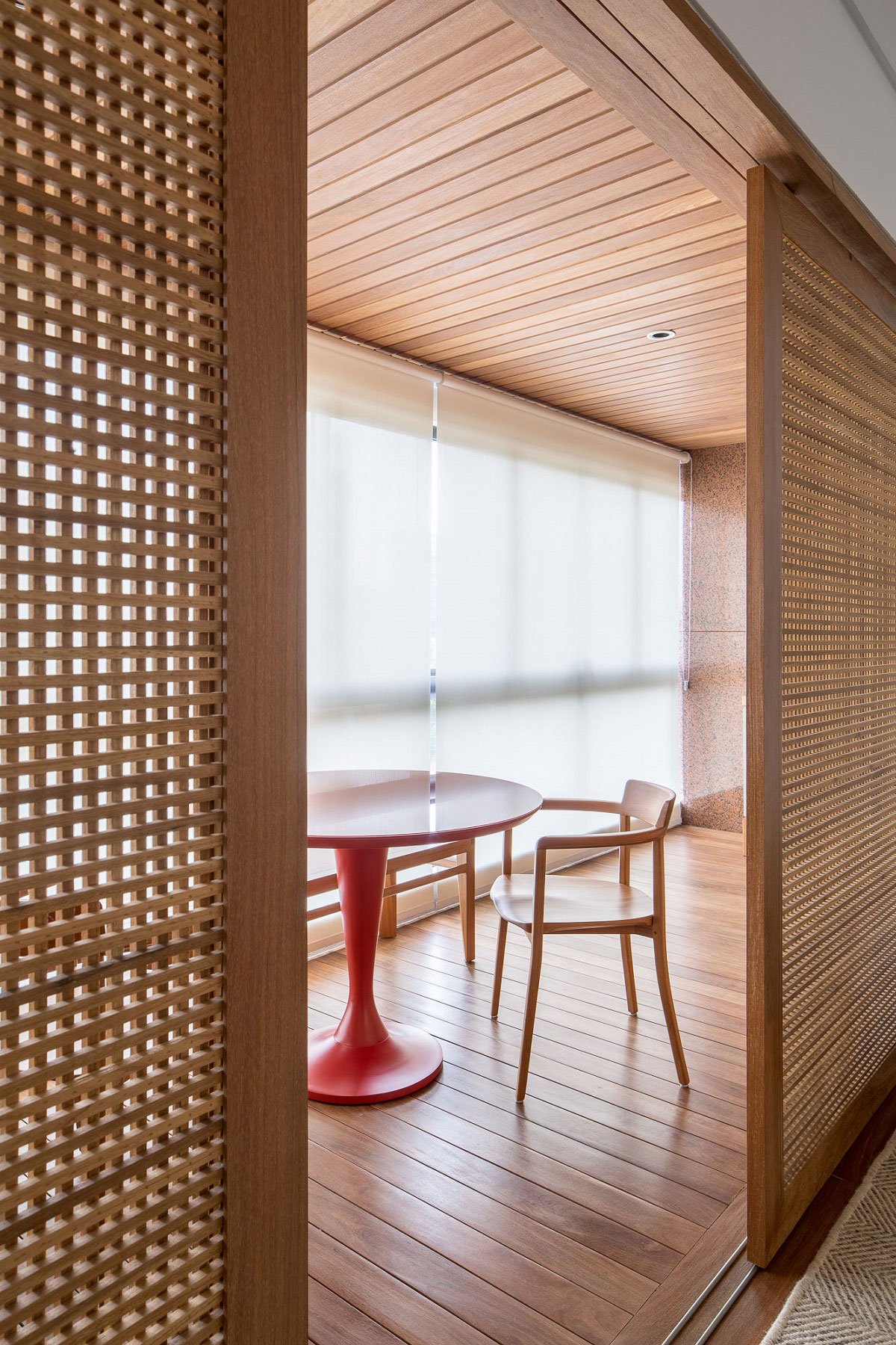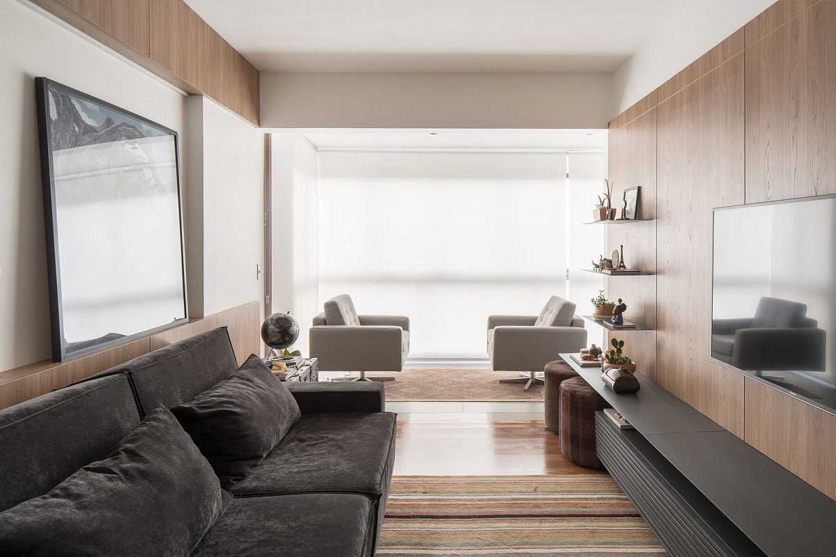 [Text as submitted by architect] This apartment 190m² , located on the residential scale of Brasília, has been renovated with modifications in almost all its environments: living room and dining room, TV room, balconies, kitchen, office, suites, bathrooms and toilet. The main work was developed in the living room, integrated with dining room and balcony. Wooden planks, serving as floor and ceiling, were installed in the veranda, partially separated from the living room by slatted wood sliding panels. Wooden boards were used to clad the walls and visually integrate the dining room environment with the veranda.