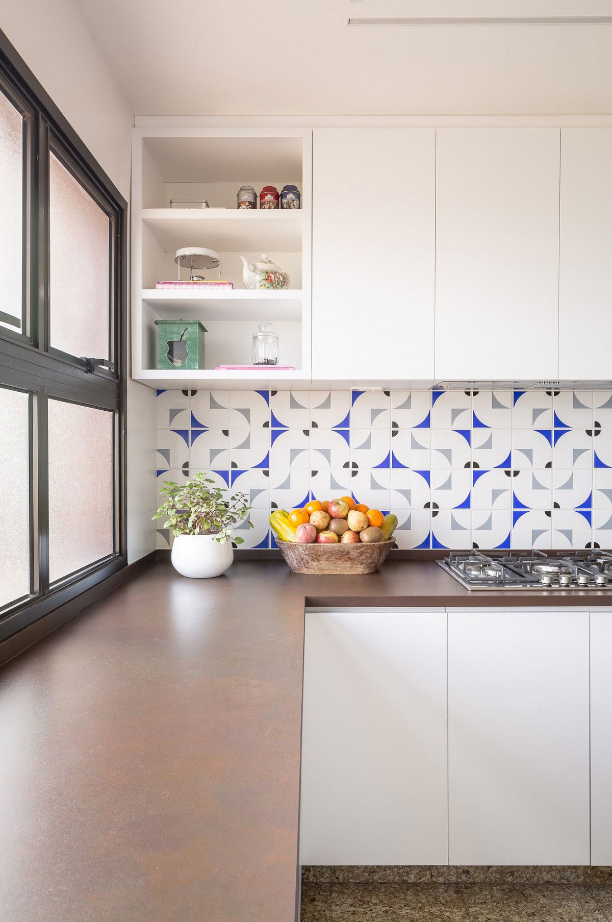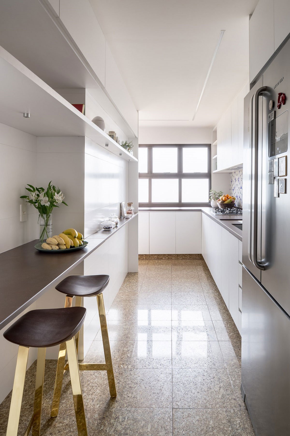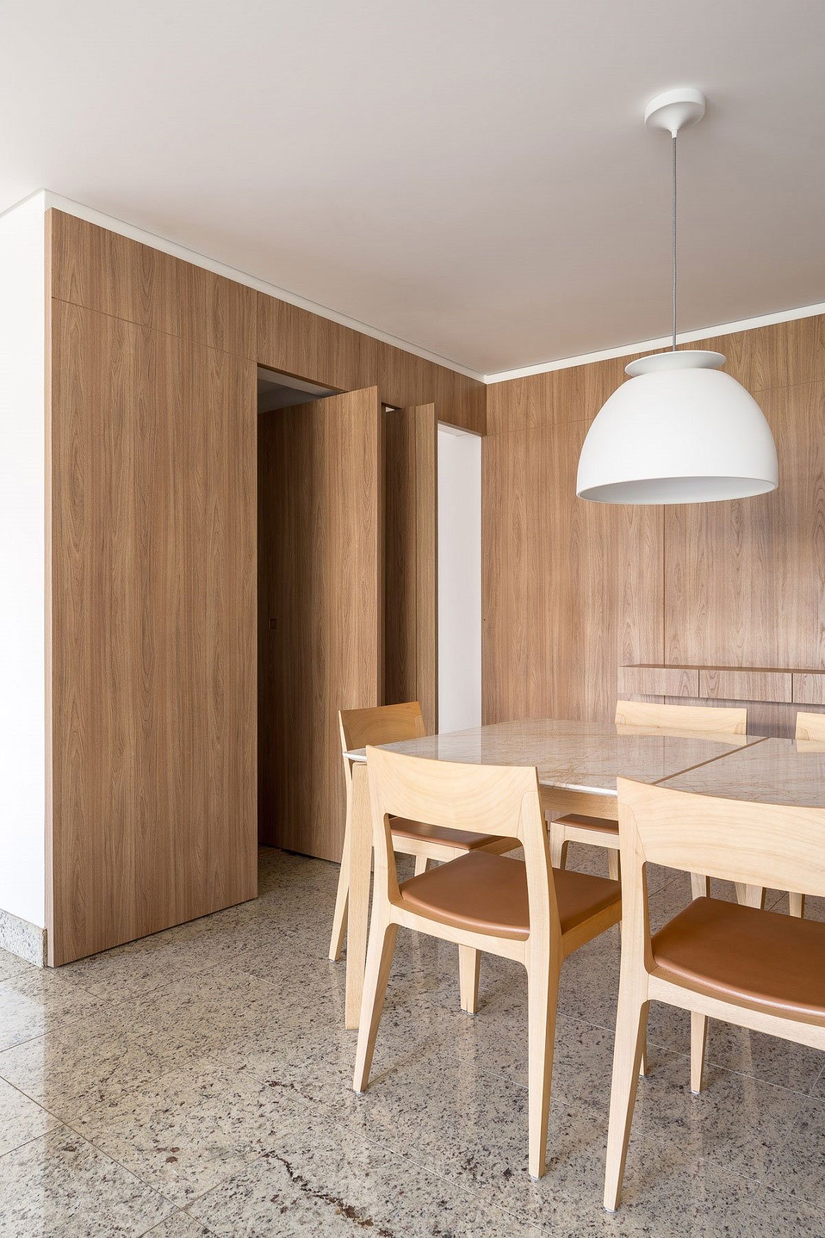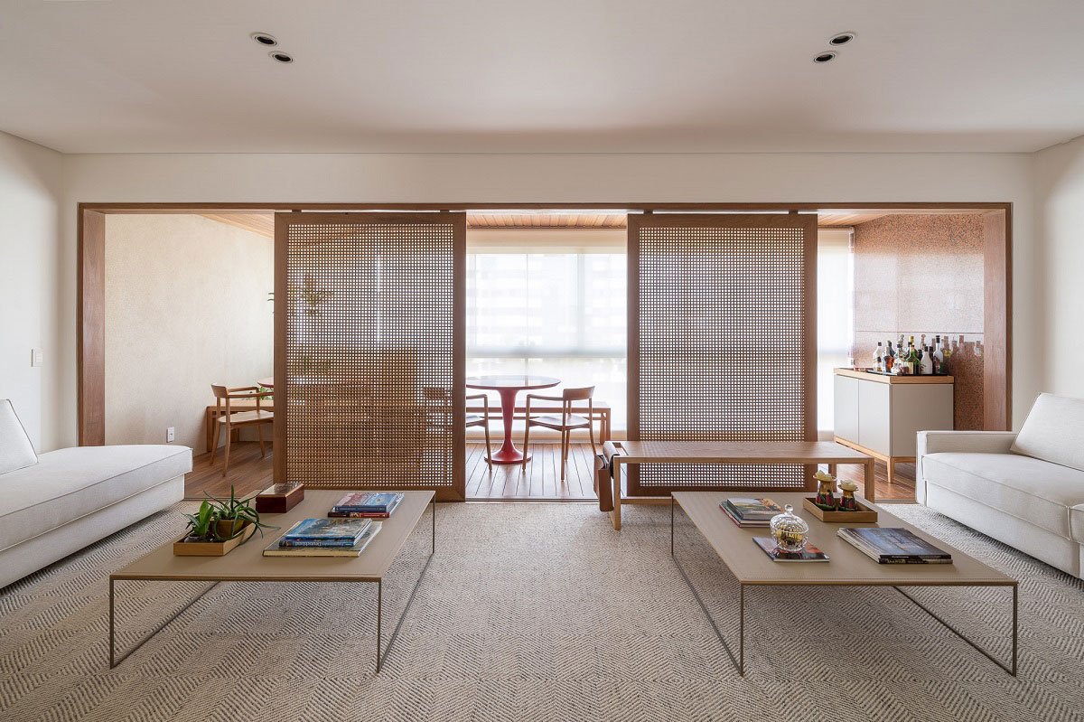 Excerpt: Guths Apartment, designed by Arqbr Arquitetura e Urbanismo, is a home interior renovated with modifications in almost all its environments. Wooden planks, serving as floor and ceiling, were installed in the veranda, partially separated from the living room by slatted wood sliding panels. Wooden boards were used to clad the walls and visually integrate the dining room environment with the veranda.