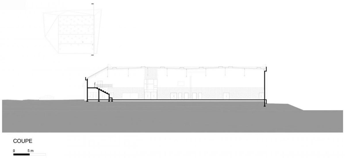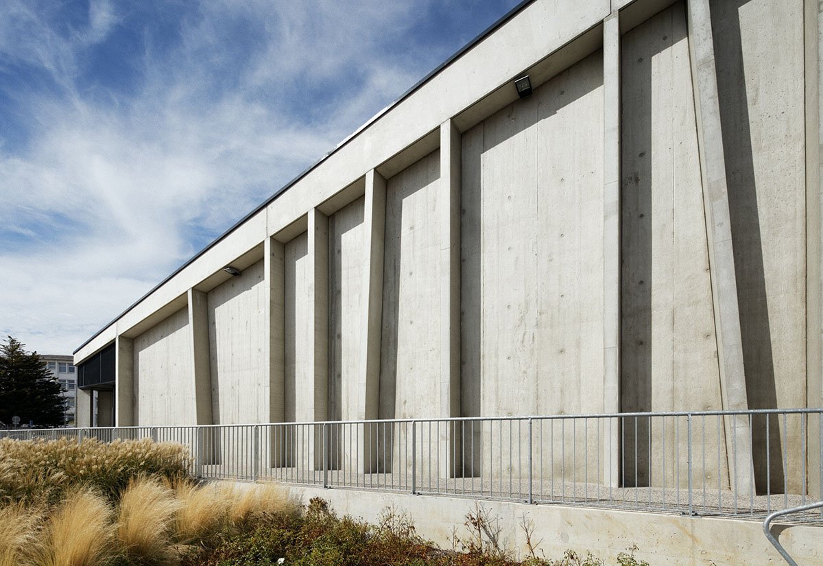 Made entirely of raw concrete, with large irregular plate glass windows, the gymnasium symbolizes the desire to create generous volumes for their internal use.