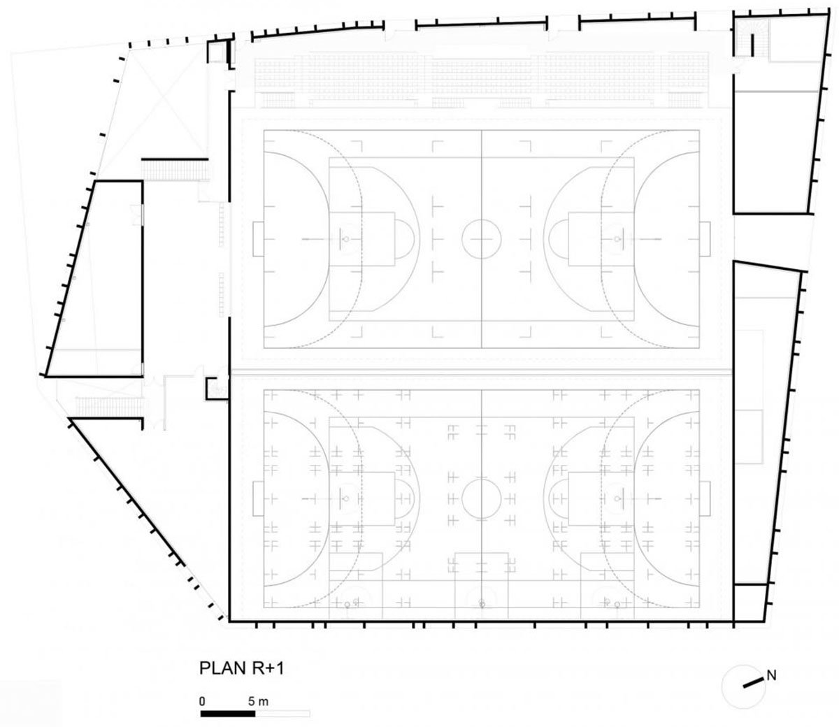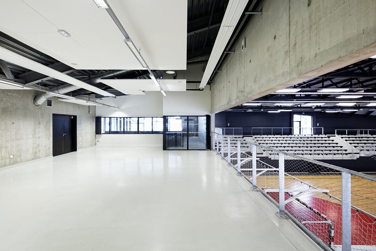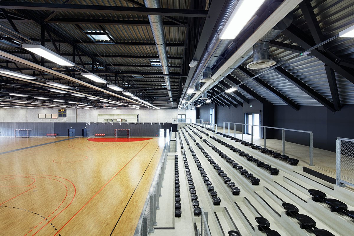 Inside, extensive terraced seating opens onto a substantial playing surface that can accommodate two handball courts, with no load-bearing element for more than 2,200 m² of wooden flooring. With its random perforations, the roof lets natural light into all the playing areas.