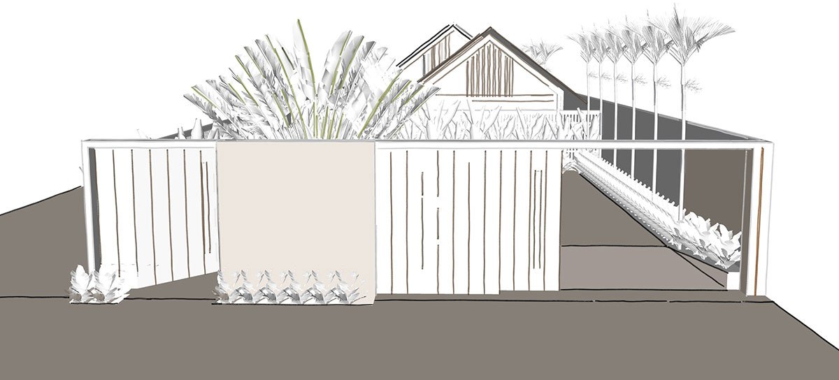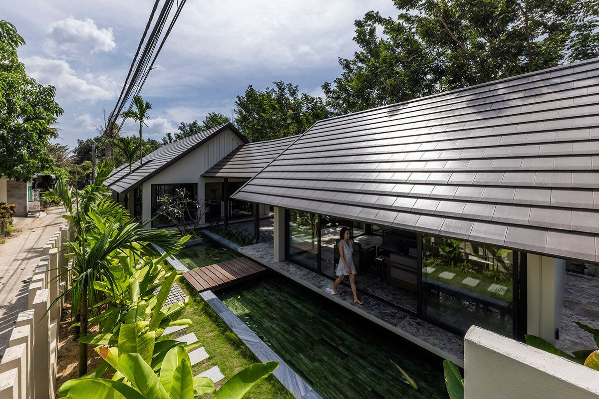 Rather than direct access, the entrance to the house is through a verdant corridor and a natural stone pathway, adorned with refreshing greenery and a Koi pond, enhancing the natural ambiance and providing a welcoming approach.