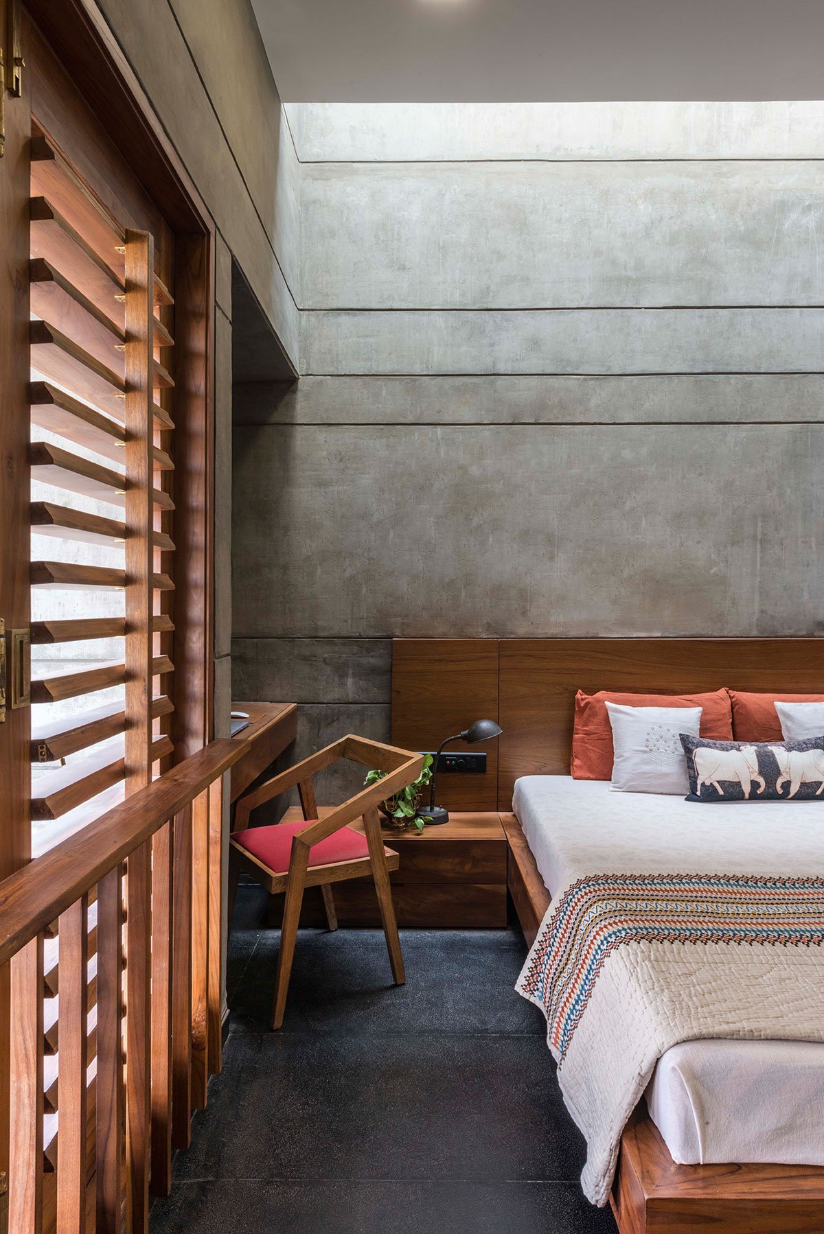 Given its location, the house necessarily became an introvert one. The connections to the outside became discreet, shielded… which meant that ventilation had to be carefully resolved. Louvered windows in the south-west corner (on both levels) allow cool breeze in, while the warm air escapes through the vents of the skylight and windows along the eastern face. Additionally, the master bedroom has been given a slit-like skylight just above the bed, which creates a living artwork on the exposed concrete wall, with the sciography that plays through the day, and indeed, across seasons… Given these daylighting strategies, the dependence on artificial light is minimal, and mainly achieved through exposed and recessed spotlights.
